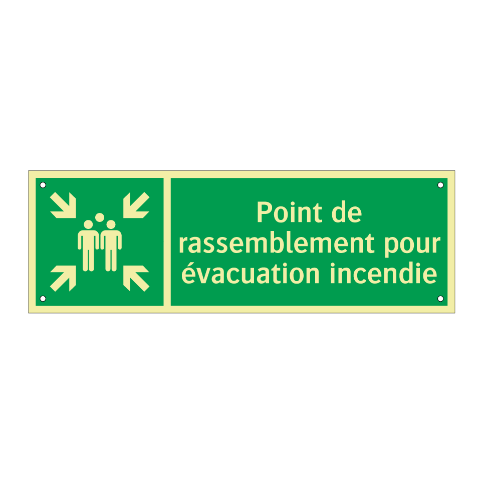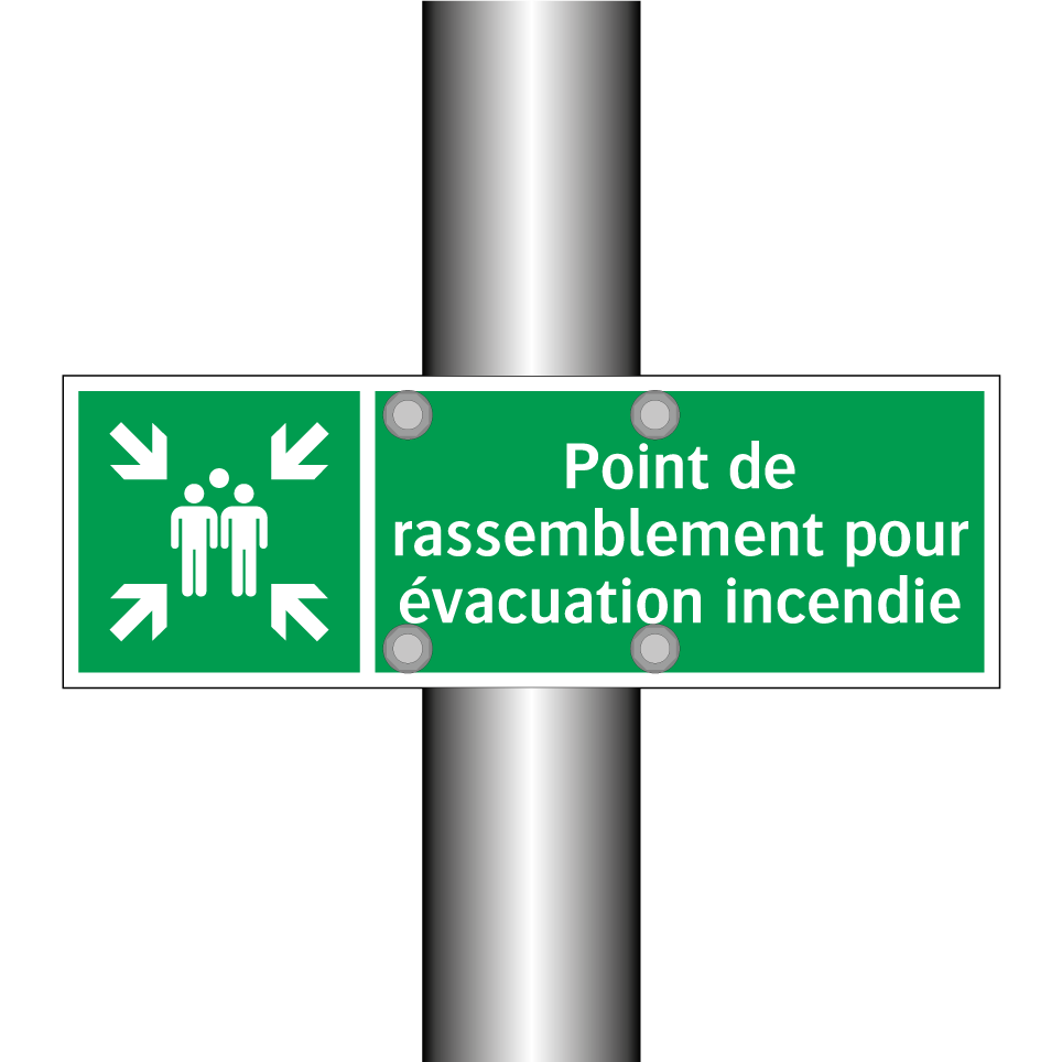 Panneau de secours avec le texte Point de rassemblement pour évacuation incendie et une symbolique claire