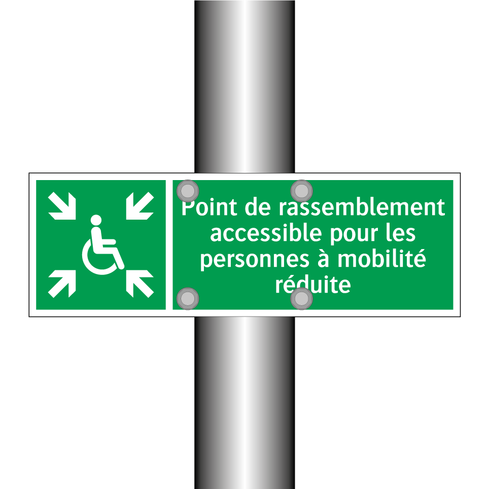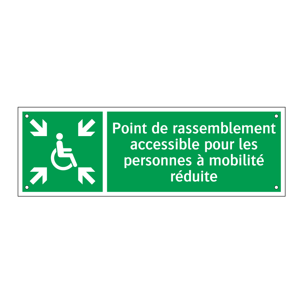 Panneau de secours avec le texte Point de rassemblement accessible pour les personnes à mobilité réduite et une symbolique claire
