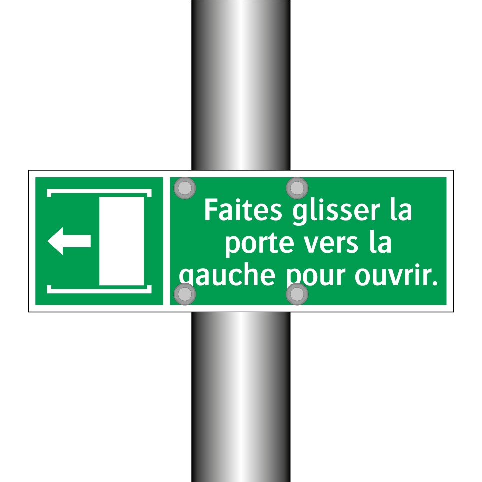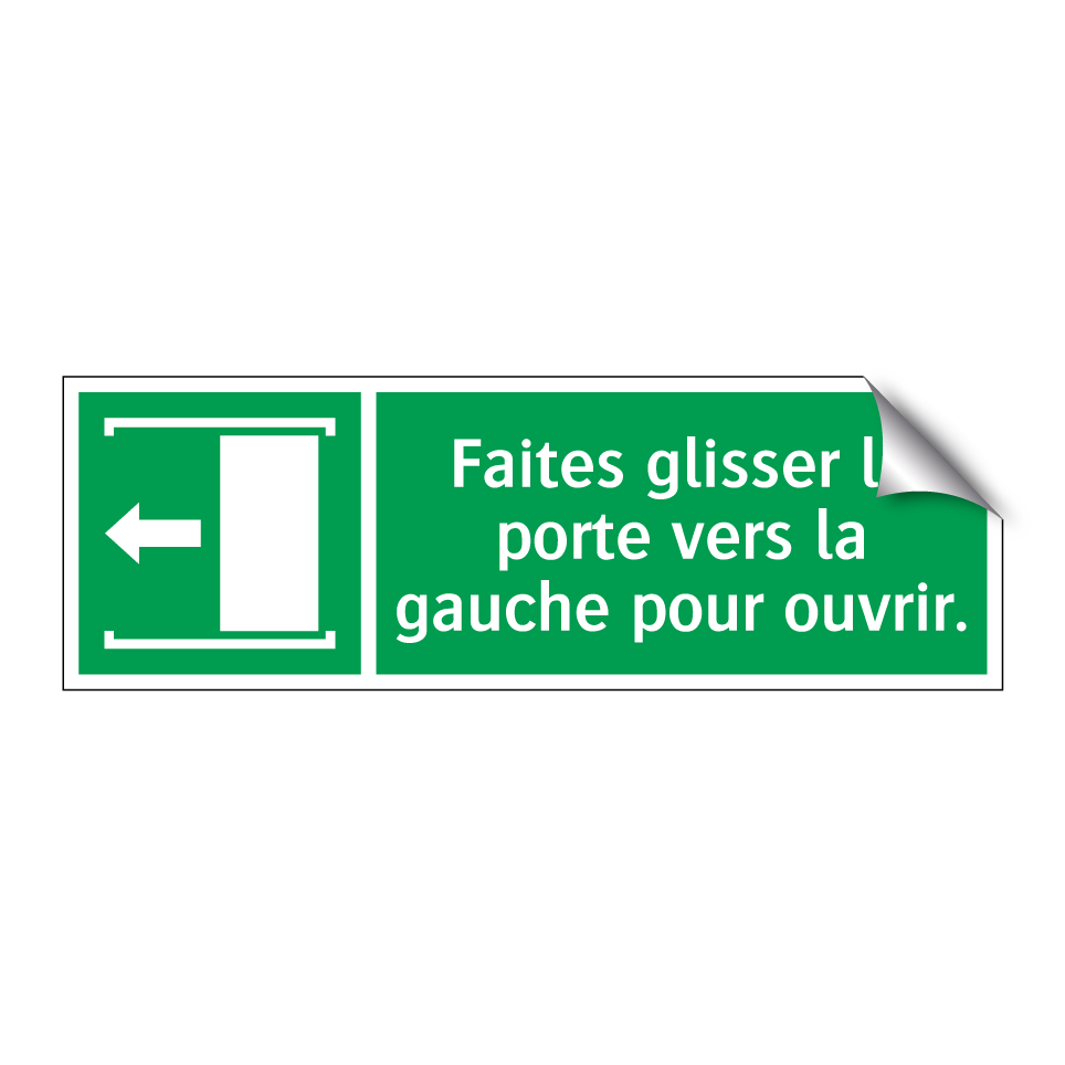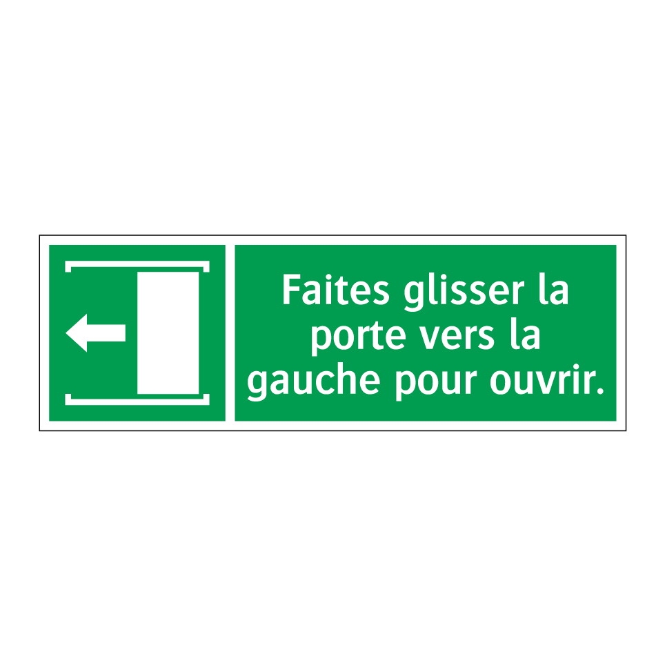 Panneau de secours avec le texte Faites glisser la porte vers la gauche pour ouvrir. et une symbolique claire