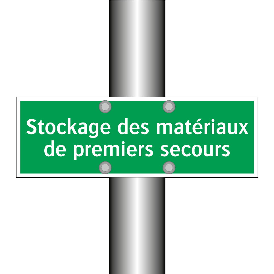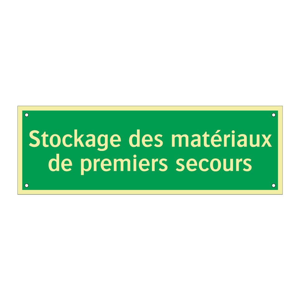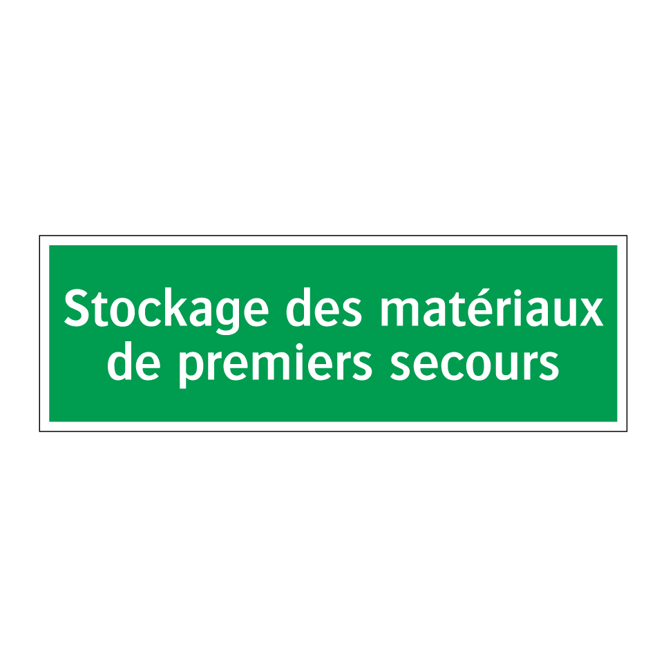 Panneau de secours avec le texte Stockage des matériaux de premiers secours