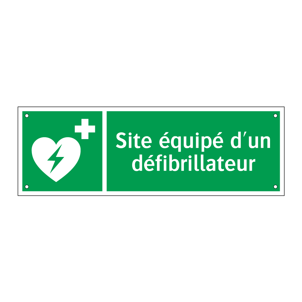 Panneau de secours avec le texte Site équipé d'un défibrillateur et une symbolique claire