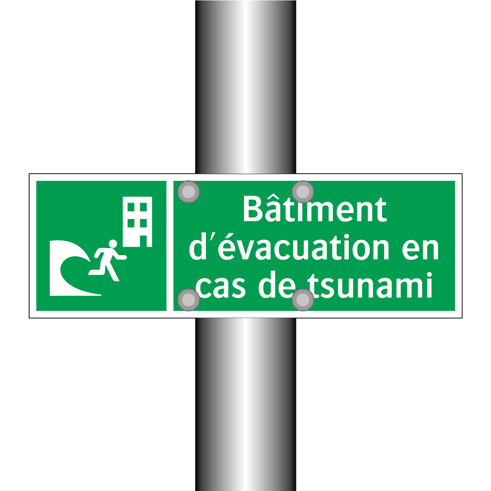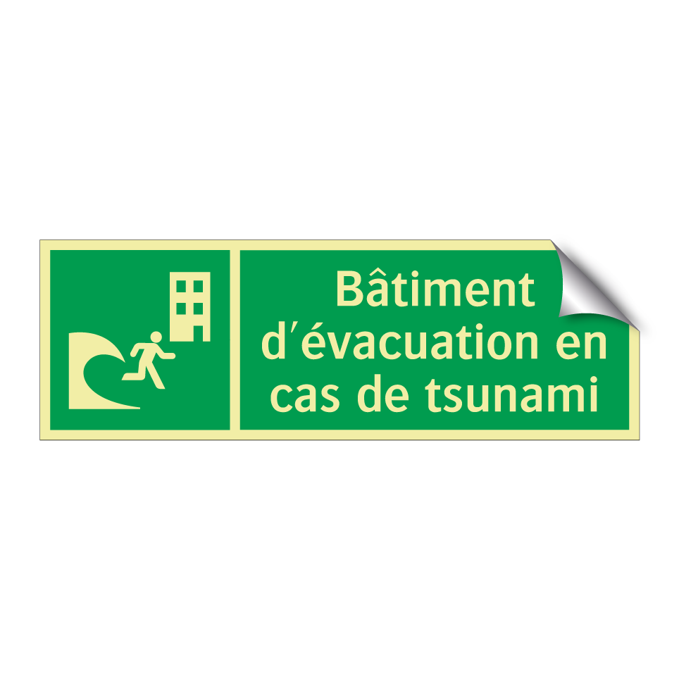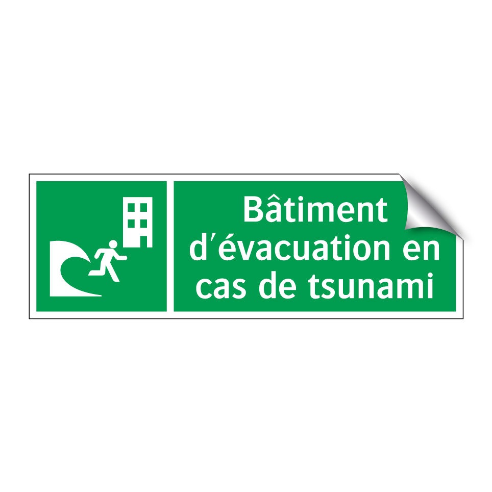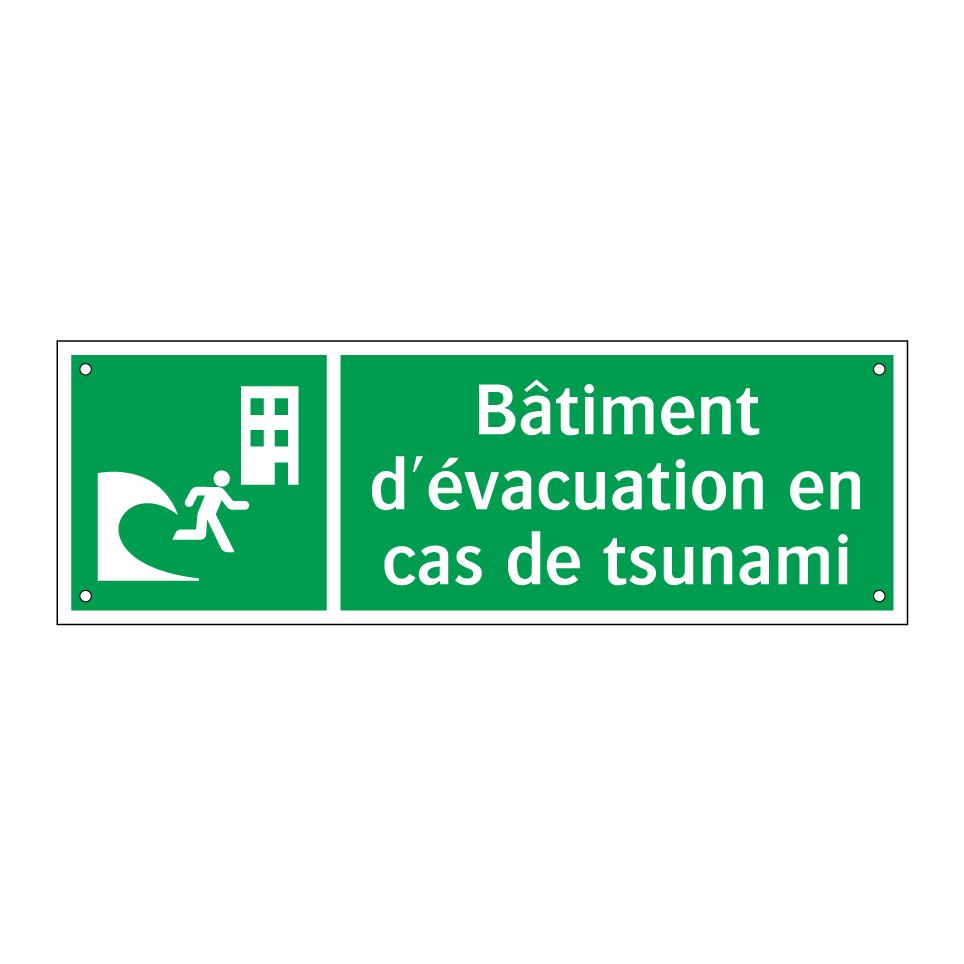Panneau de secours avec le texte Bâtiment d'évacuation en cas de tsunami et une symbolique claire