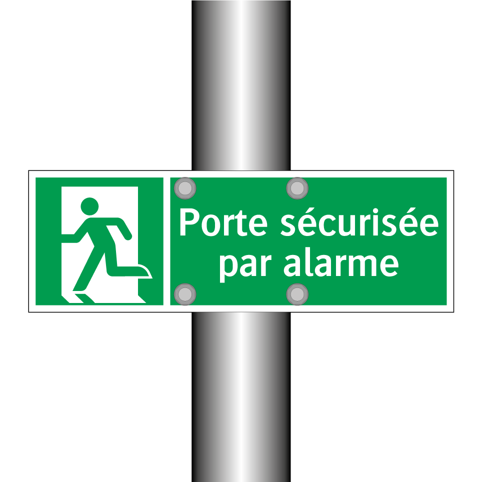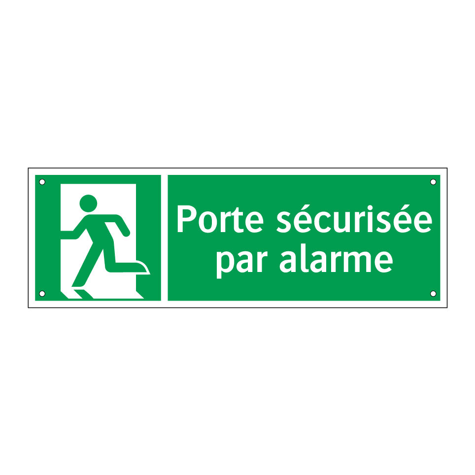 Panneau de secours avec le texte Porte sécurisée par alarme et une symbolique claire