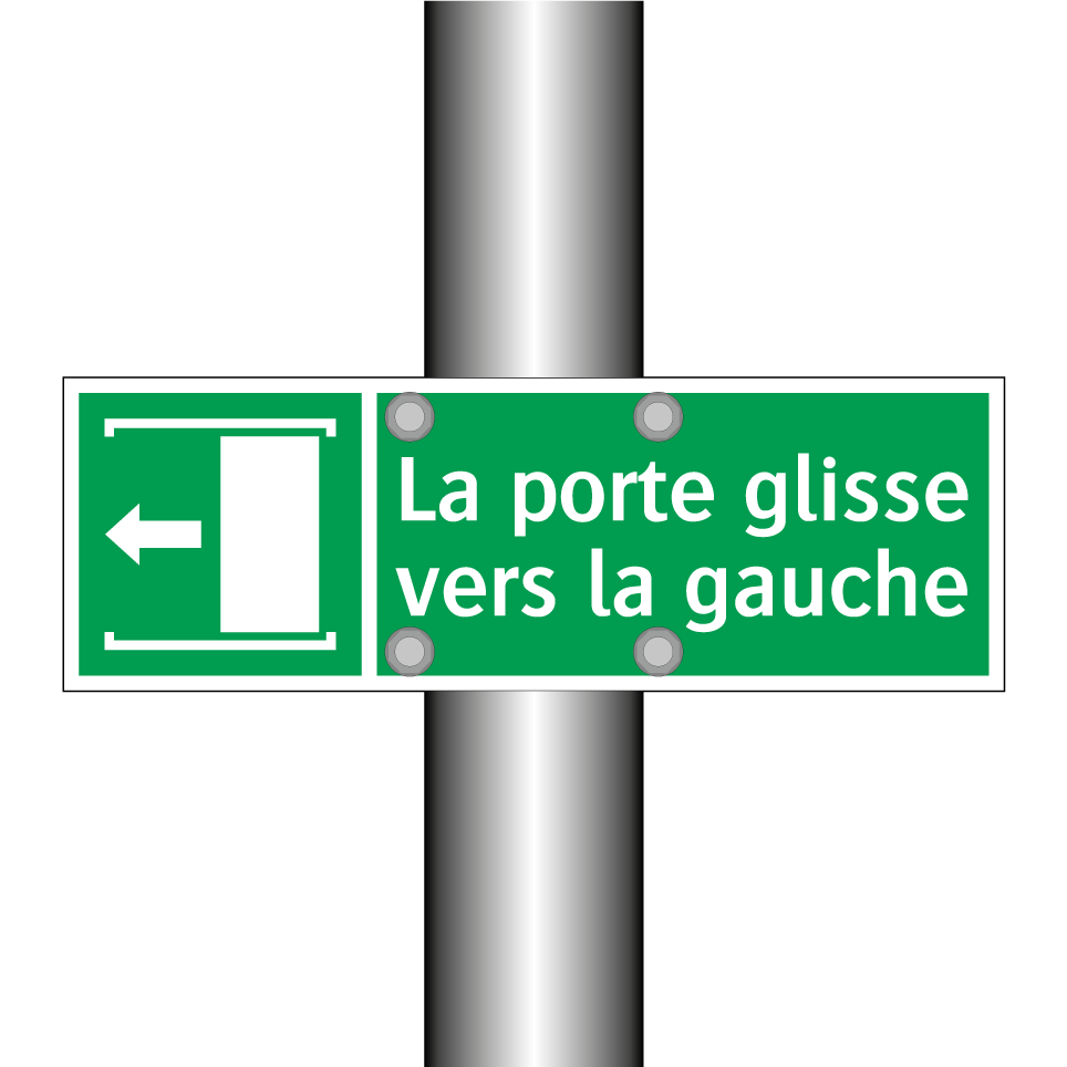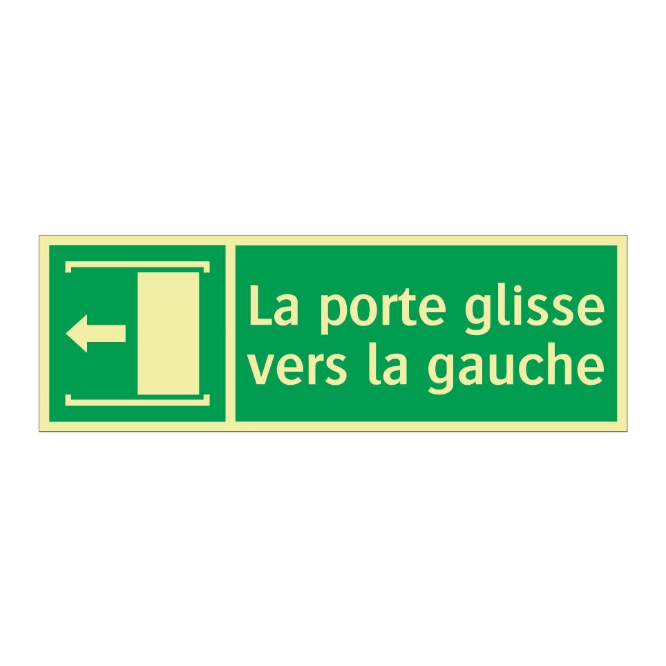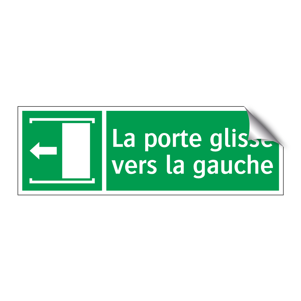 Panneau de secours avec le texte La porte glisse vers la gauche et une symbolique claire