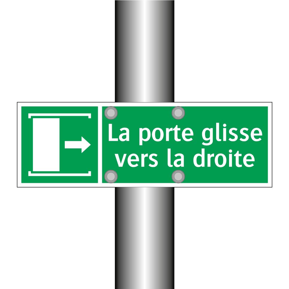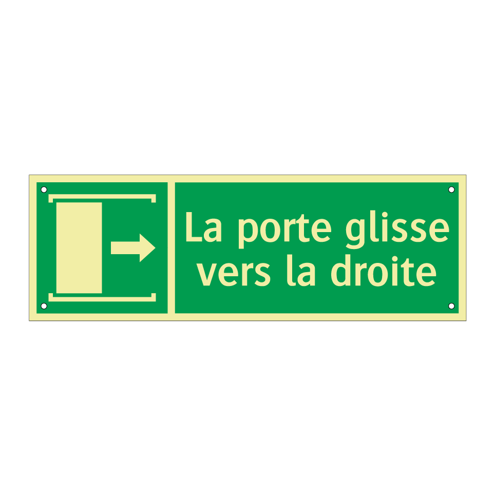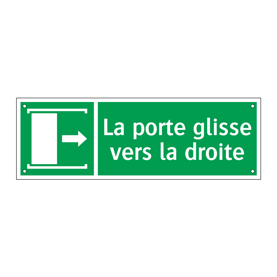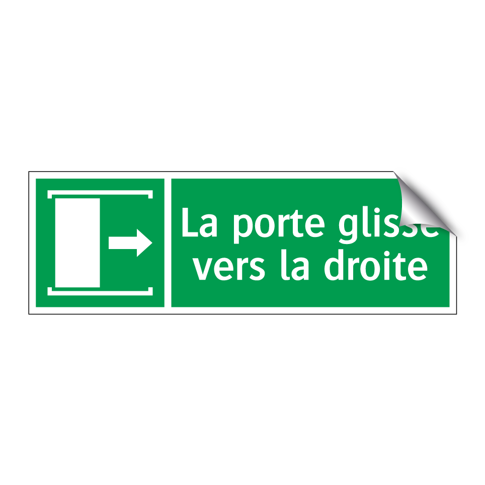 Panneau de secours avec le texte La porte glisse vers la droite et une symbolique claire