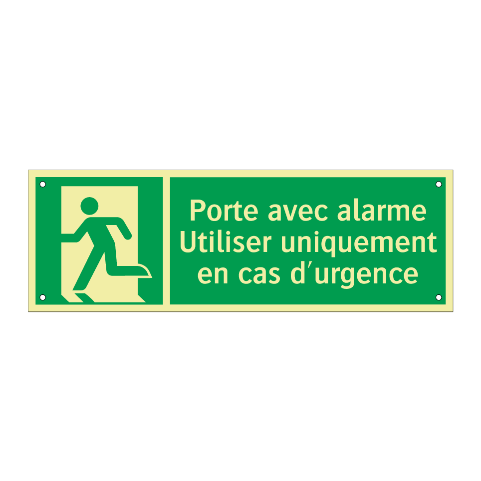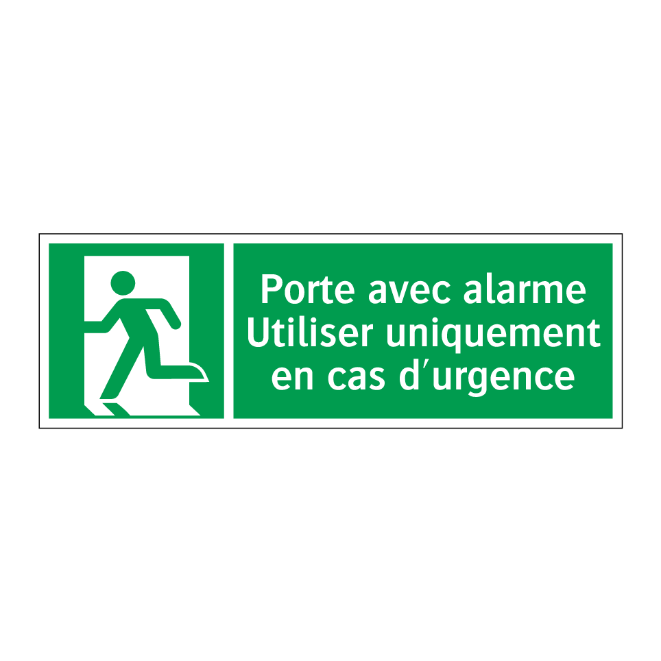 Panneau de secours avec le texte Porte avec alarme Utiliser uniquement en cas d'urgence et une symbolique claire