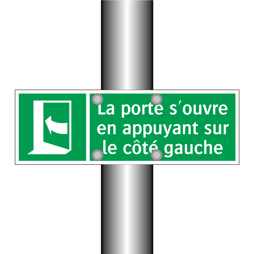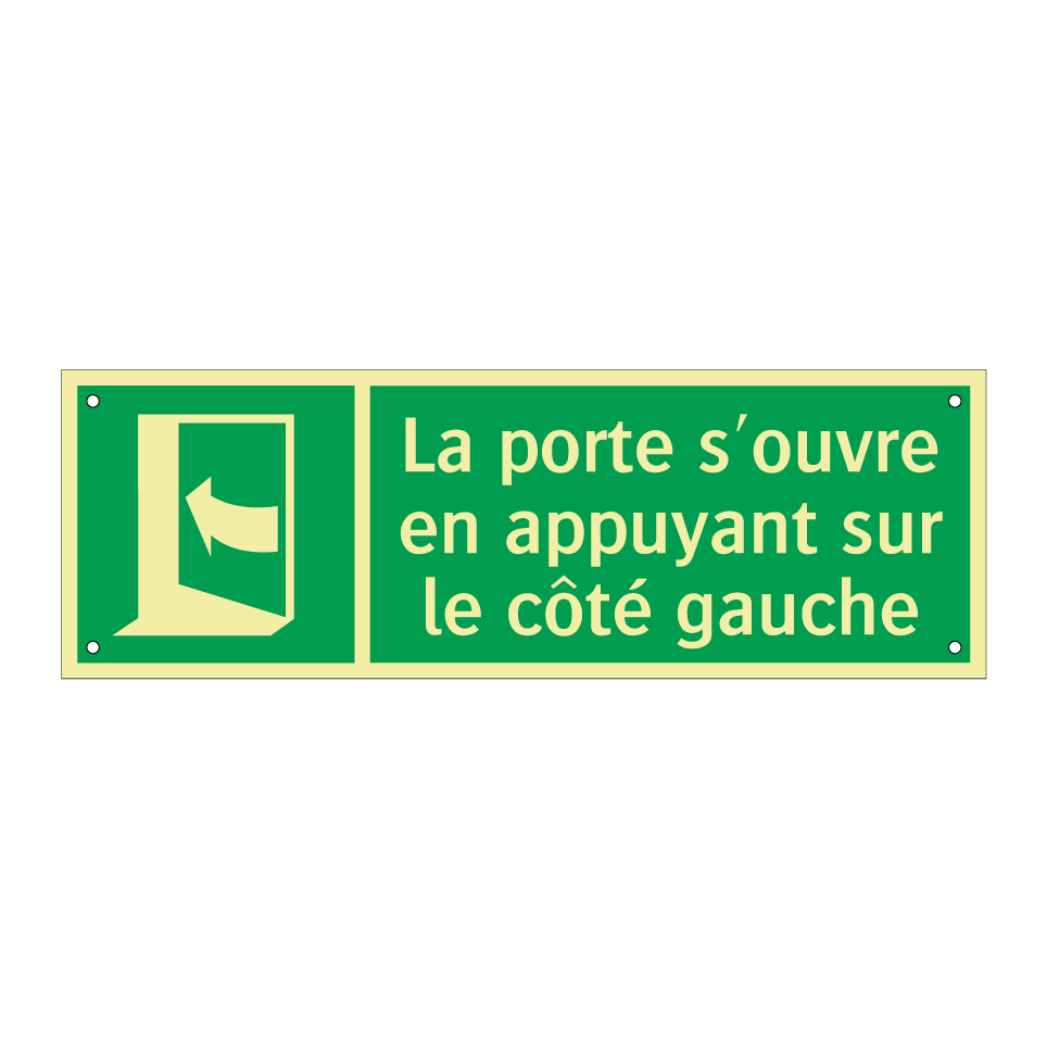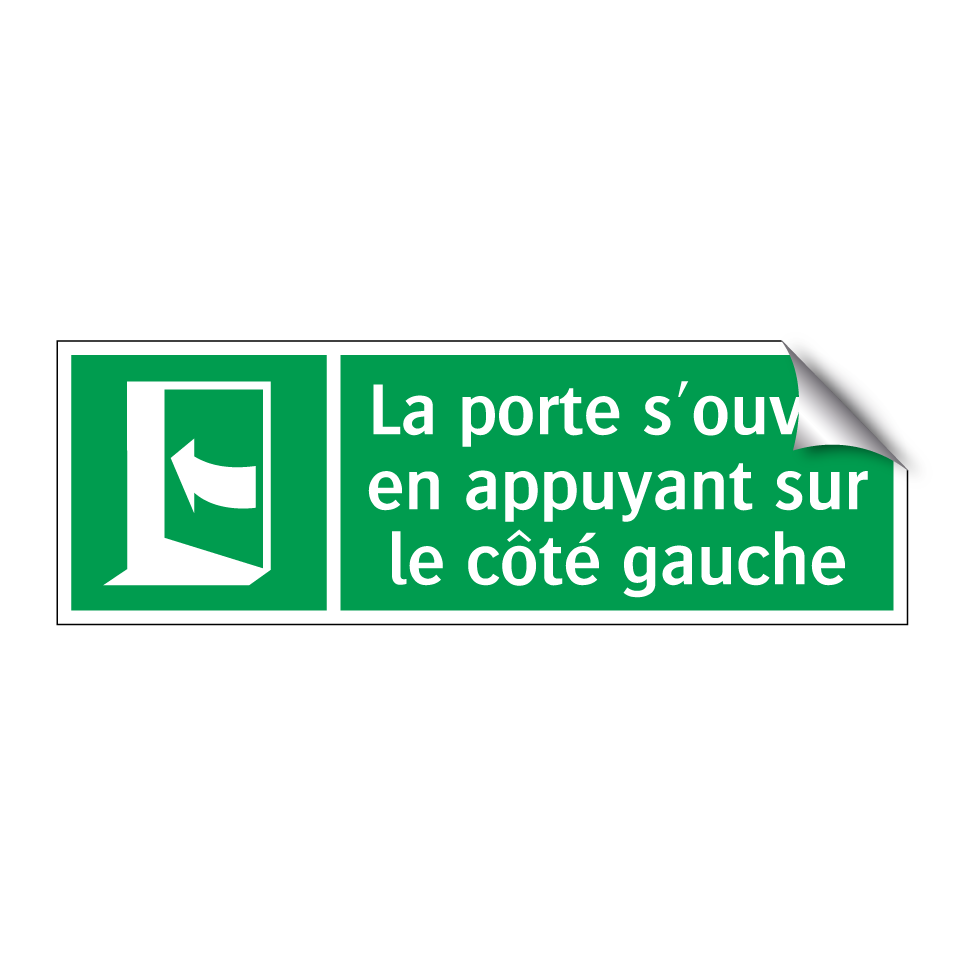 Panneau de secours avec le texte La porte s'ouvre en appuyant sur le côté gauche et une symbolique claire