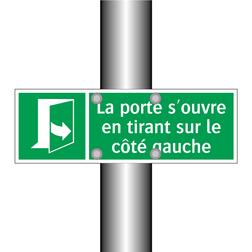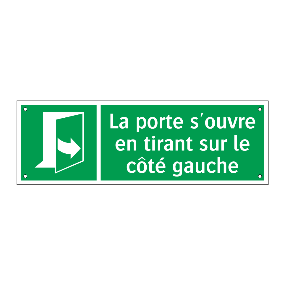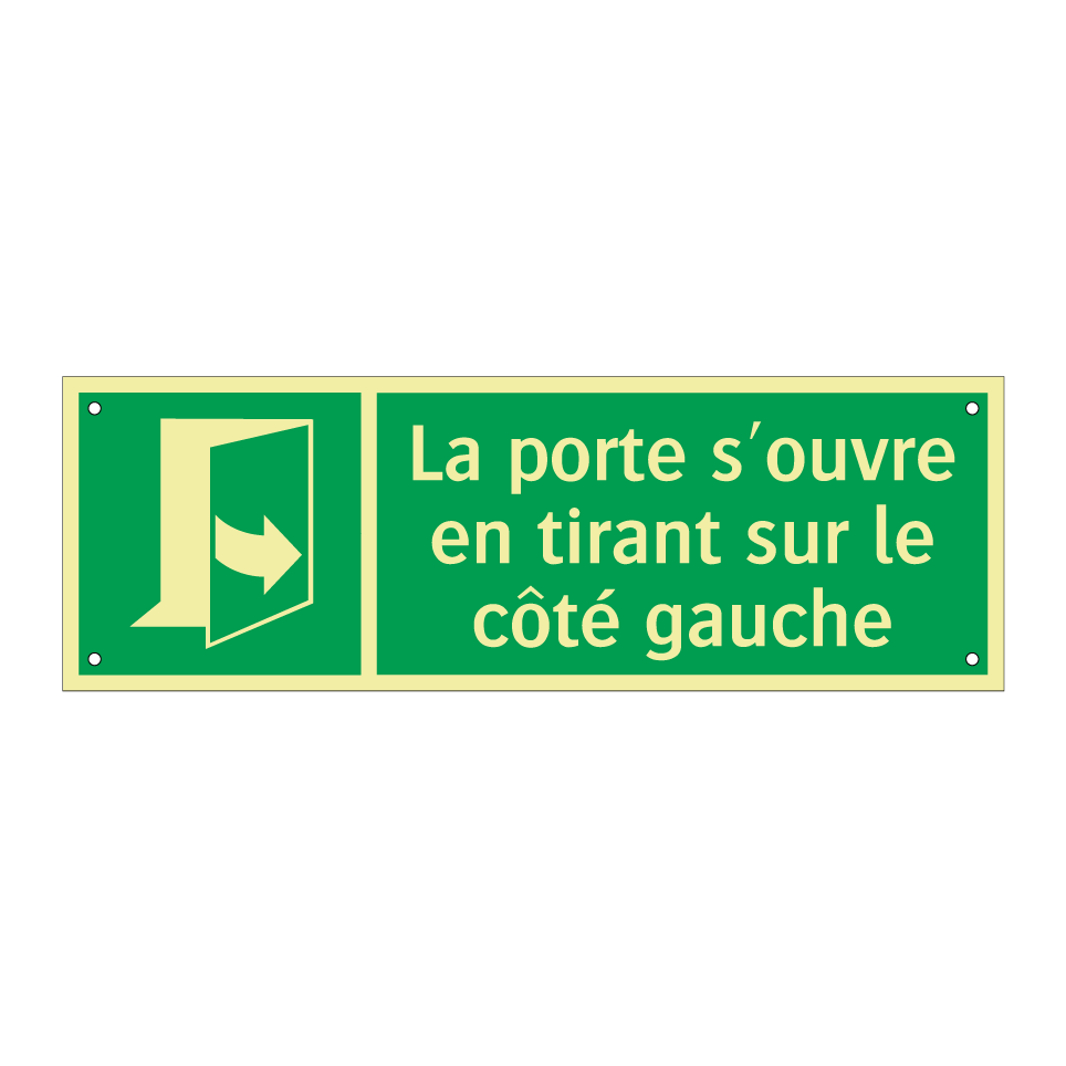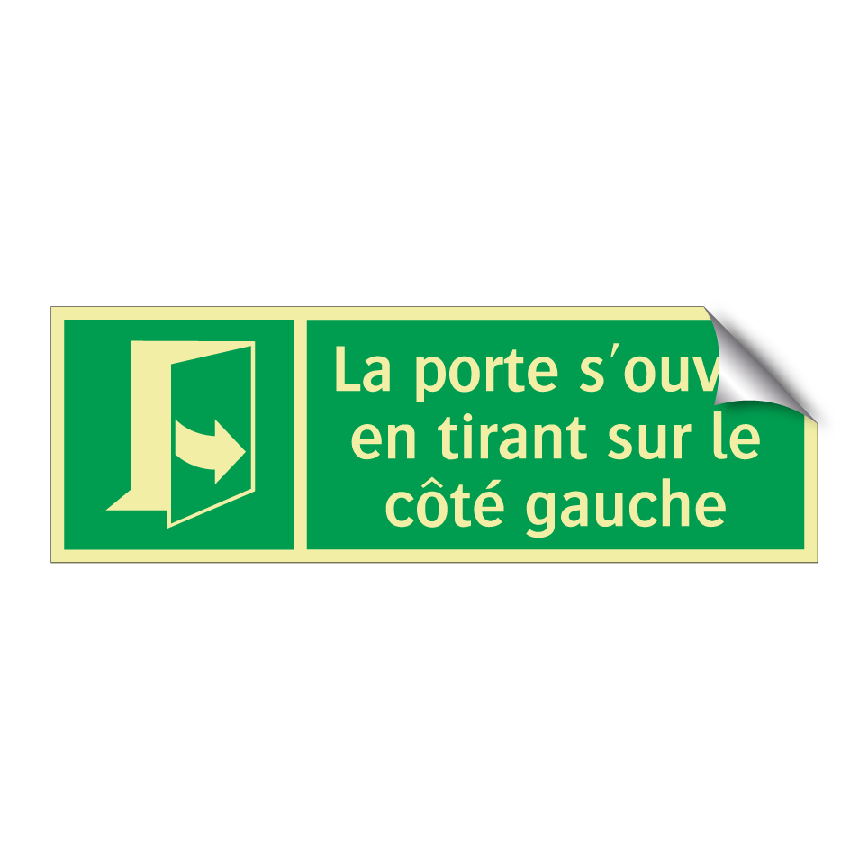 Panneau de secours avec le texte La porte s'ouvre en tirant sur le côté gauche et une symbolique claire