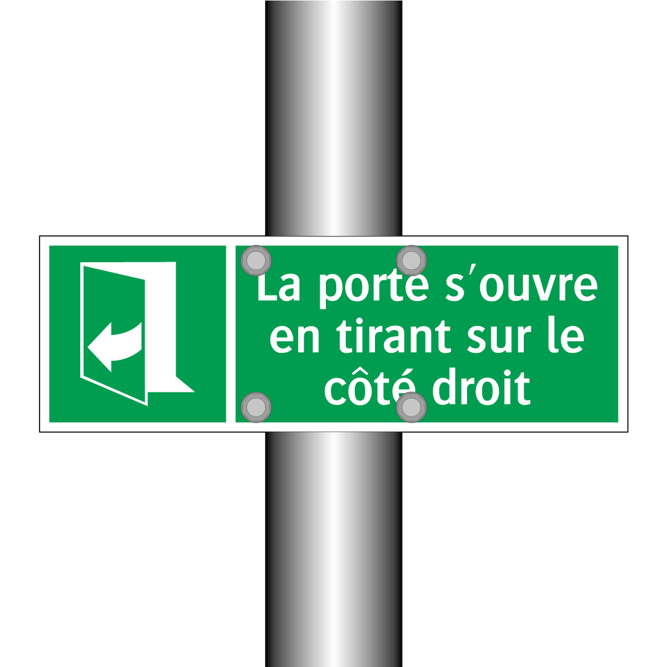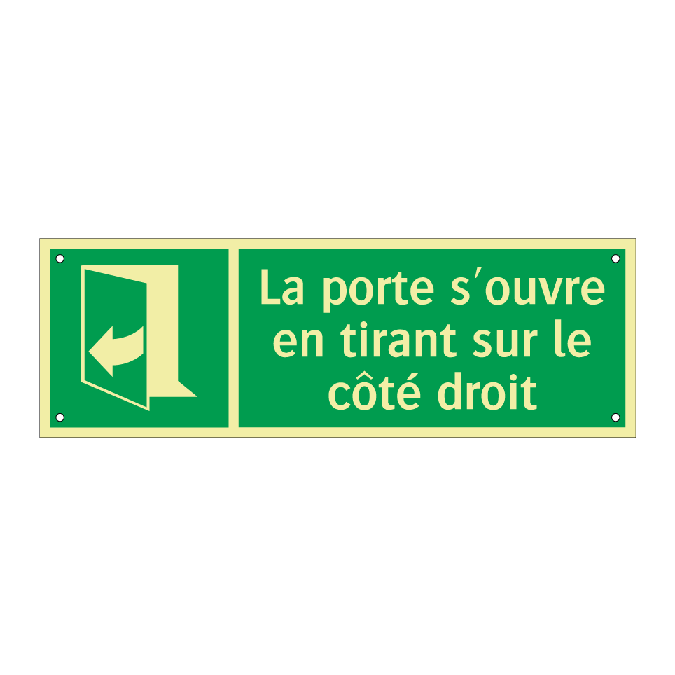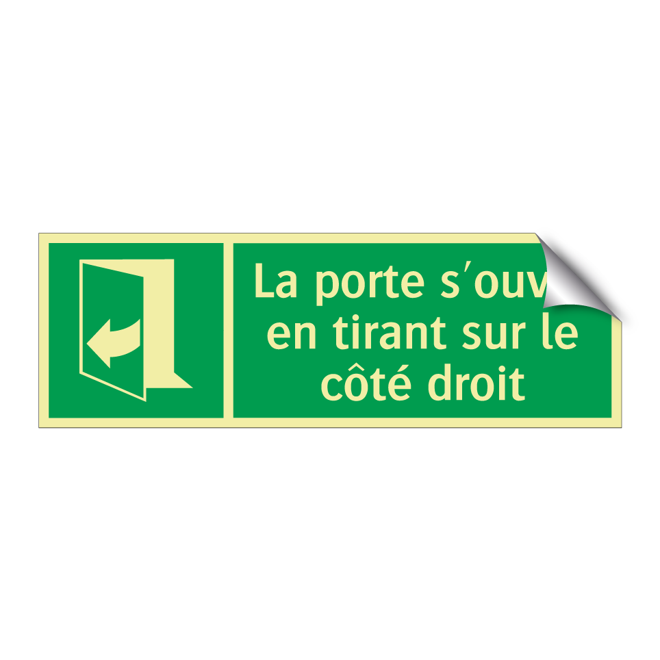 Panneau de secours avec le texte La porte s'ouvre en tirant sur le côté droit et une symbolique claire