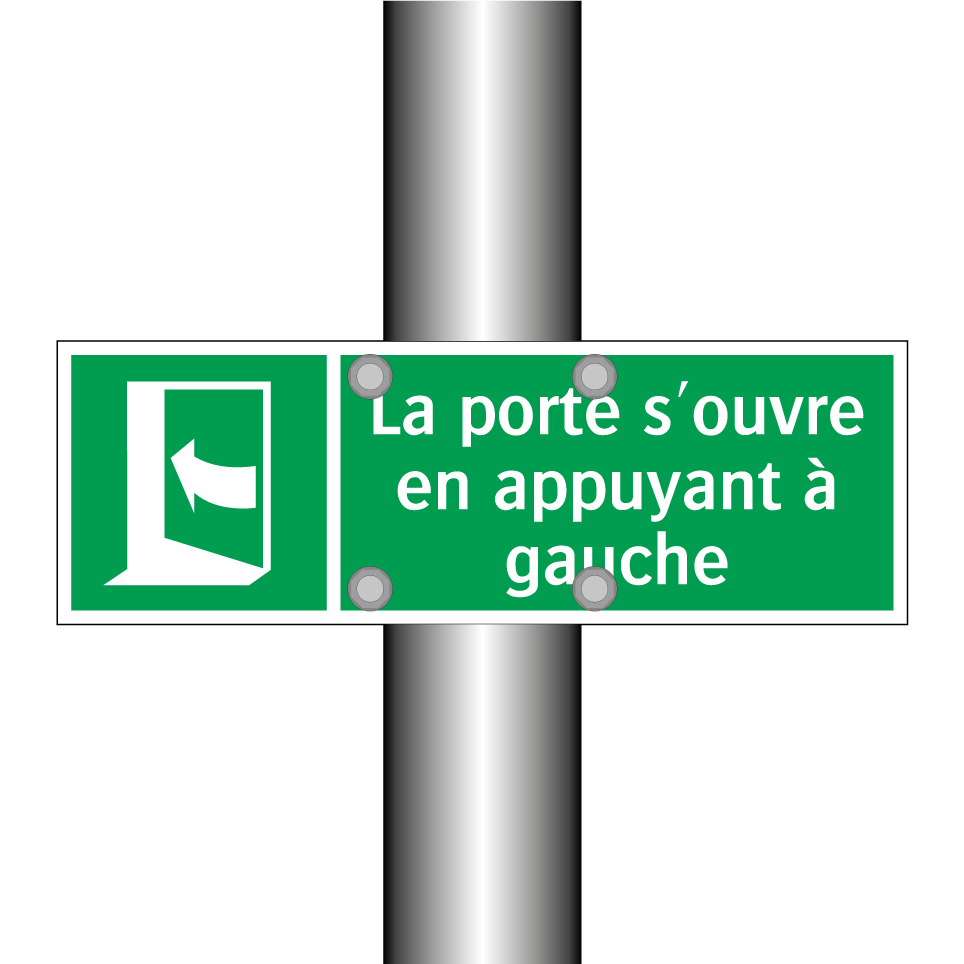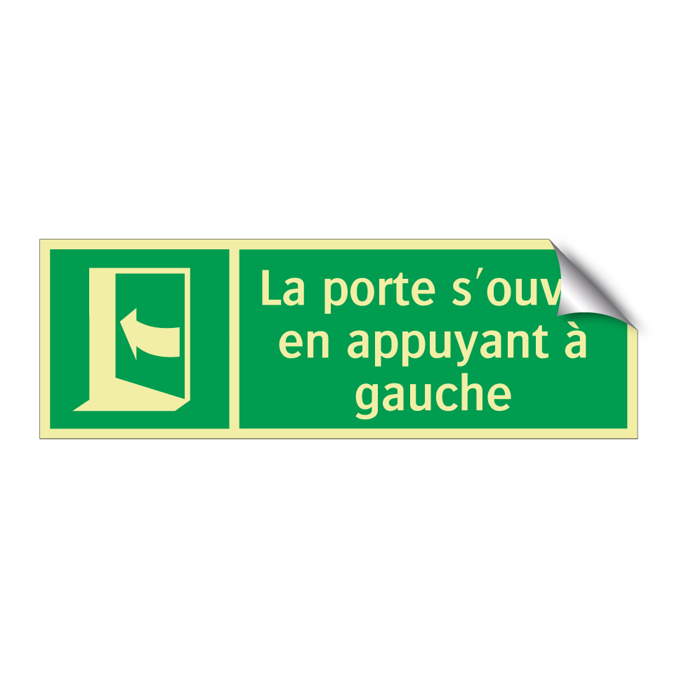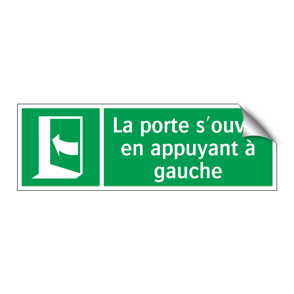 Panneau de secours avec le texte La porte s'ouvre en appuyant à gauche et une symbolique claire