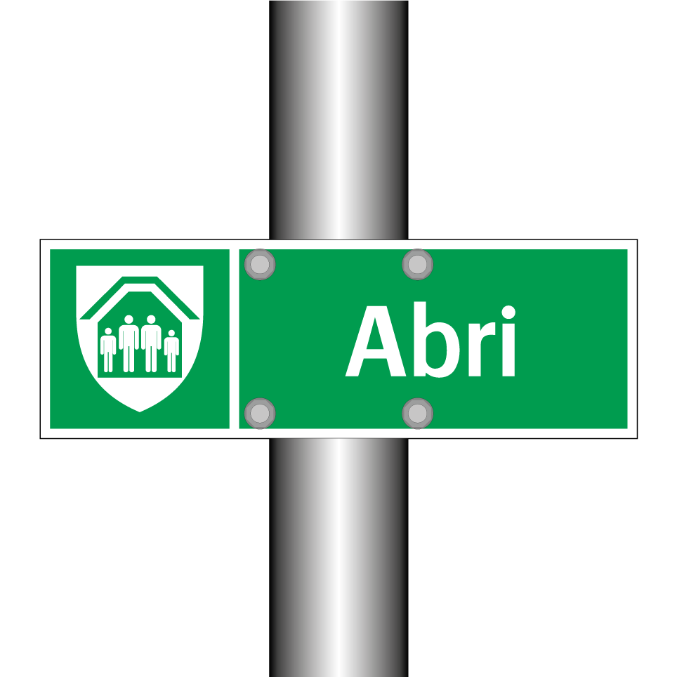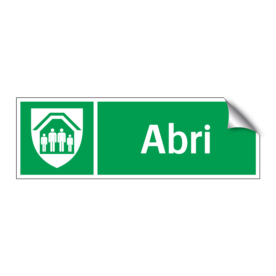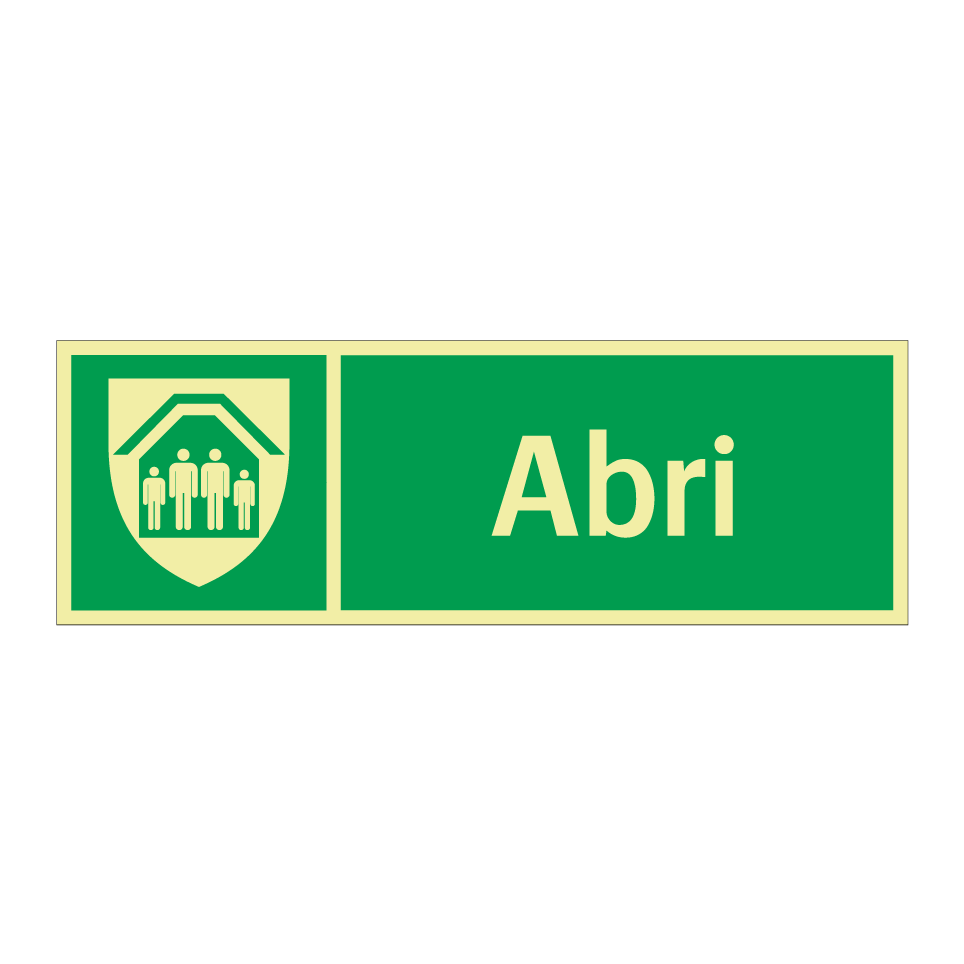 Cette enseigne de sécurité, avec son fond vert et son texte blanc, est conçue pour indiquer un abri d'urgence. Elle est idéale pour être placée dans des lieux publics tels que les centres commerciaux, les gares ou les aéroports, où elle guide les personnes vers un refuge en cas de besoin. Grâce à son symbole clair et son message en français, elle assure une compréhension rapide et efficace, garantissant ainsi la sécurité des usagers en situation d'urgence.