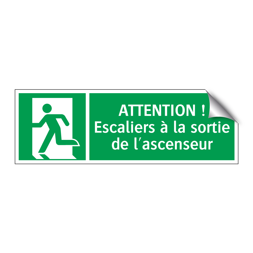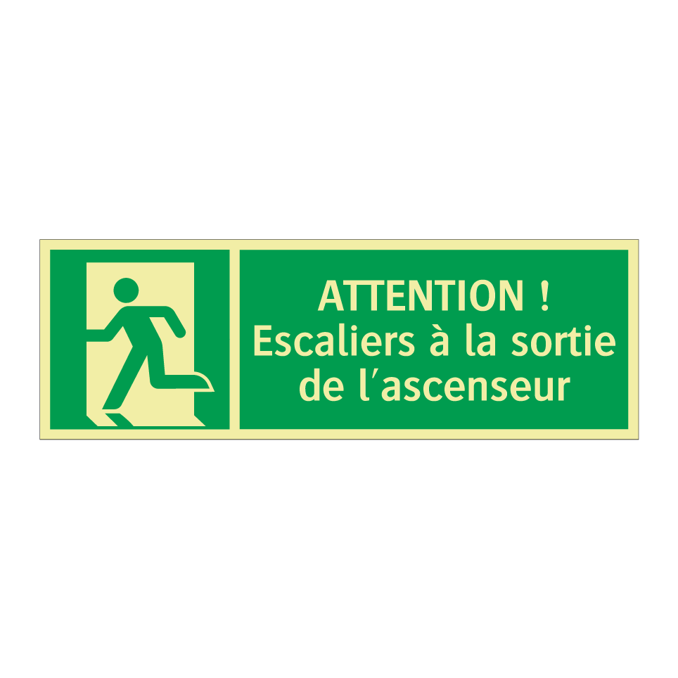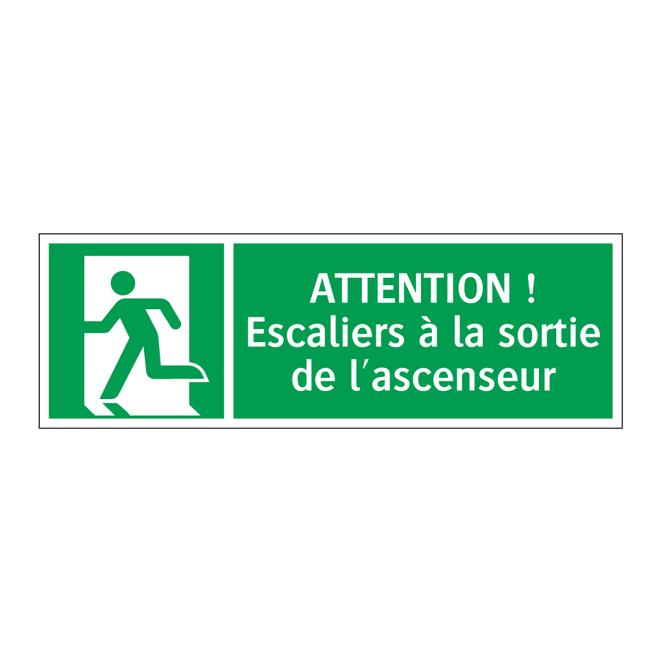 Panneau de secours avec le texte ATTENTION ! Escaliers à la sortie de l'ascenseur et une symbolique claire