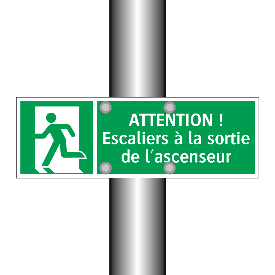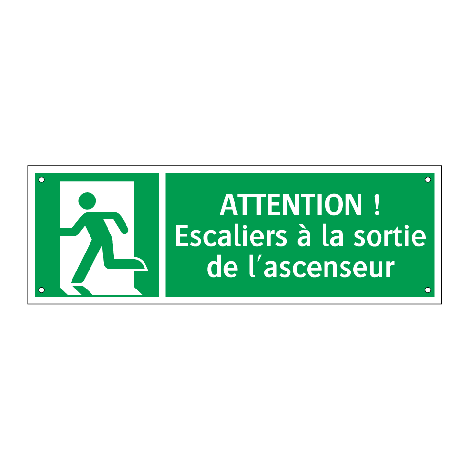 Cette signalisation d'urgence, avec son fond vert et son texte blanc, est idéale pour assurer la sécurité dans les bâtiments publics et privés. Elle est conçue pour être placée à proximité des ascenseurs, avertissant les usagers de la présence d'escaliers à la sortie. Grâce à sa symbolique claire et son message en français, elle est particulièrement adaptée aux environnements francophones. Installez-la dans les halls d'entrée, les couloirs ou les zones de transit pour guider efficacement les personnes et prévenir les accidents. Sa visibilité et son design universel en font un choix essentiel pour toute infrastructure soucieuse de la sécurité.
