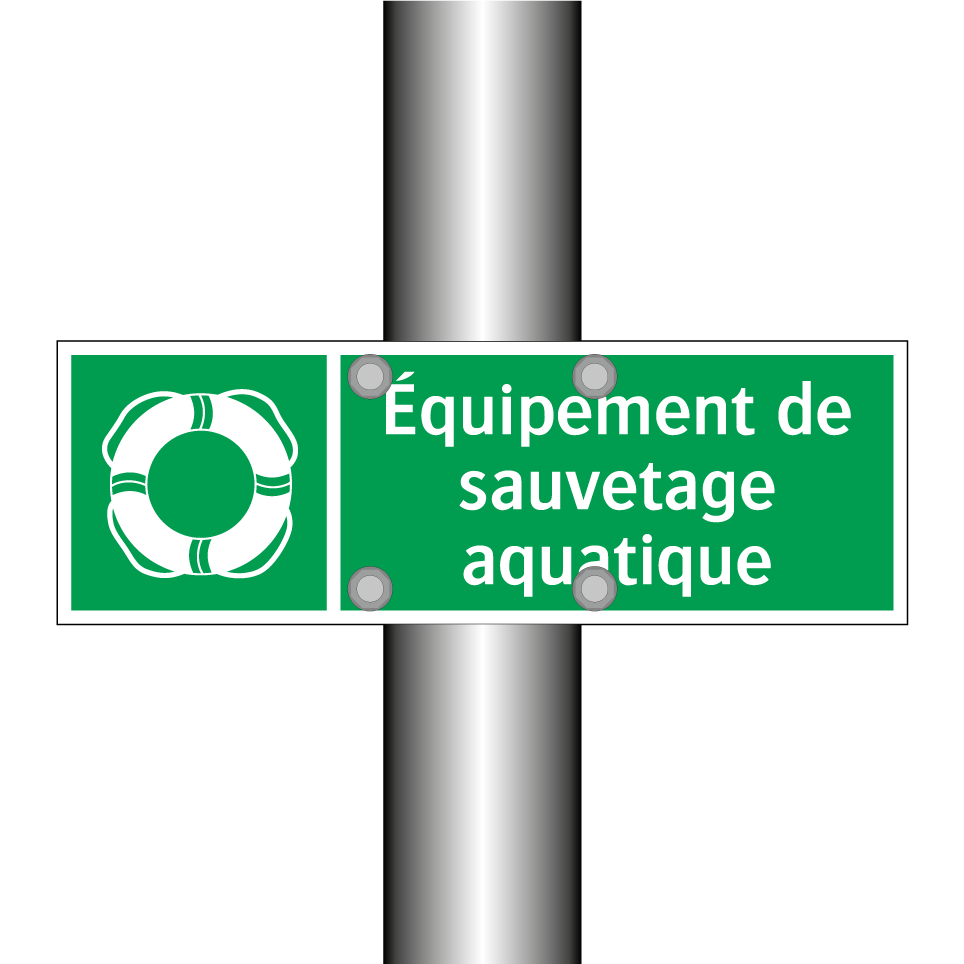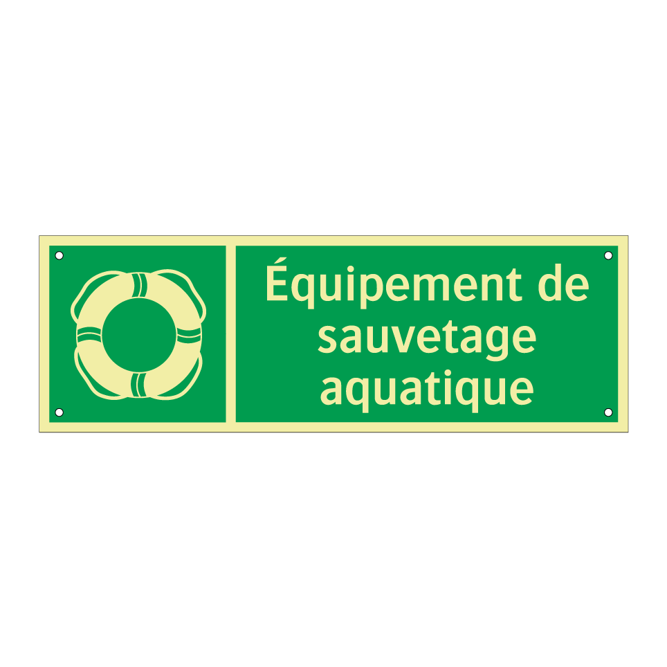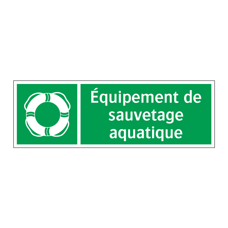 Panneau de secours avec le texte Équipement de sauvetage aquatique et une symbolique claire