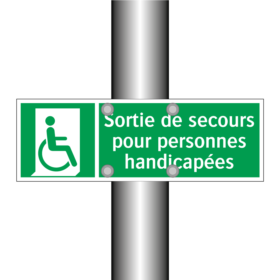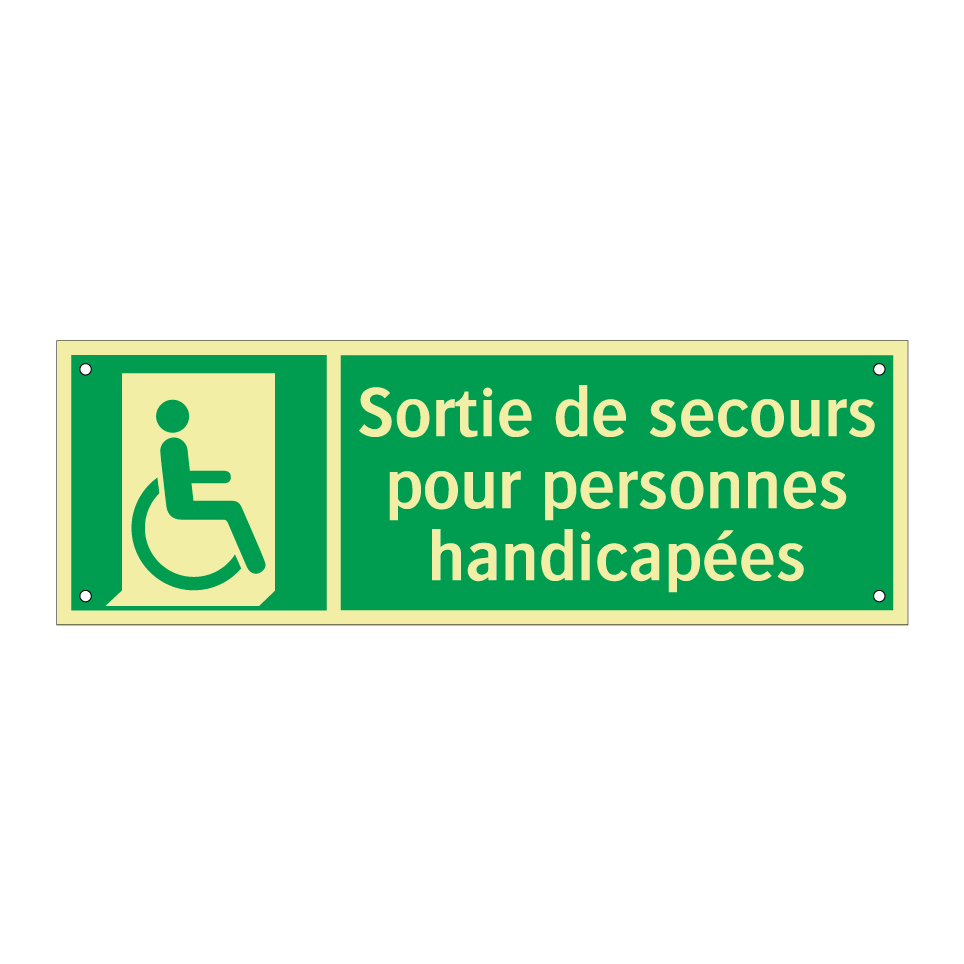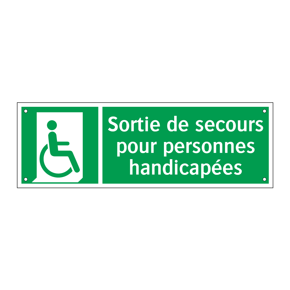 Panneau de secours avec le texte Sortie de secours pour personnes handicapées et une symbolique claire