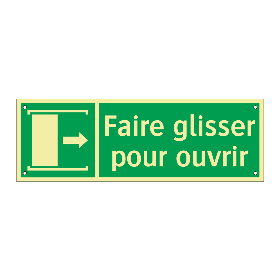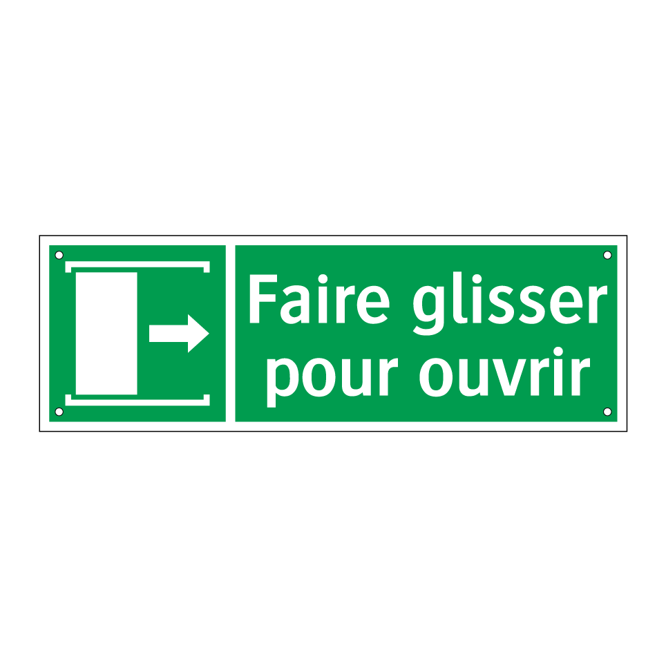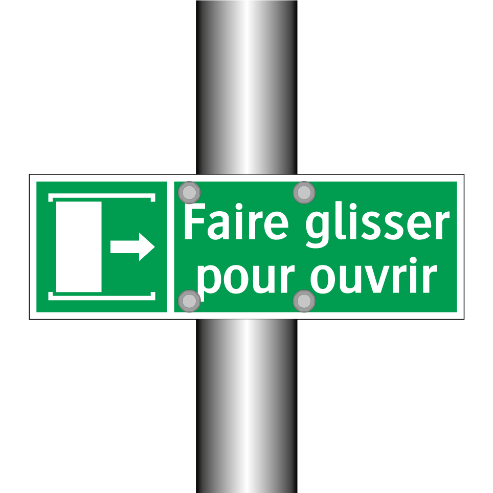 Panneau de secours avec le texte Faire glisser pour ouvrir et une symbolique claire