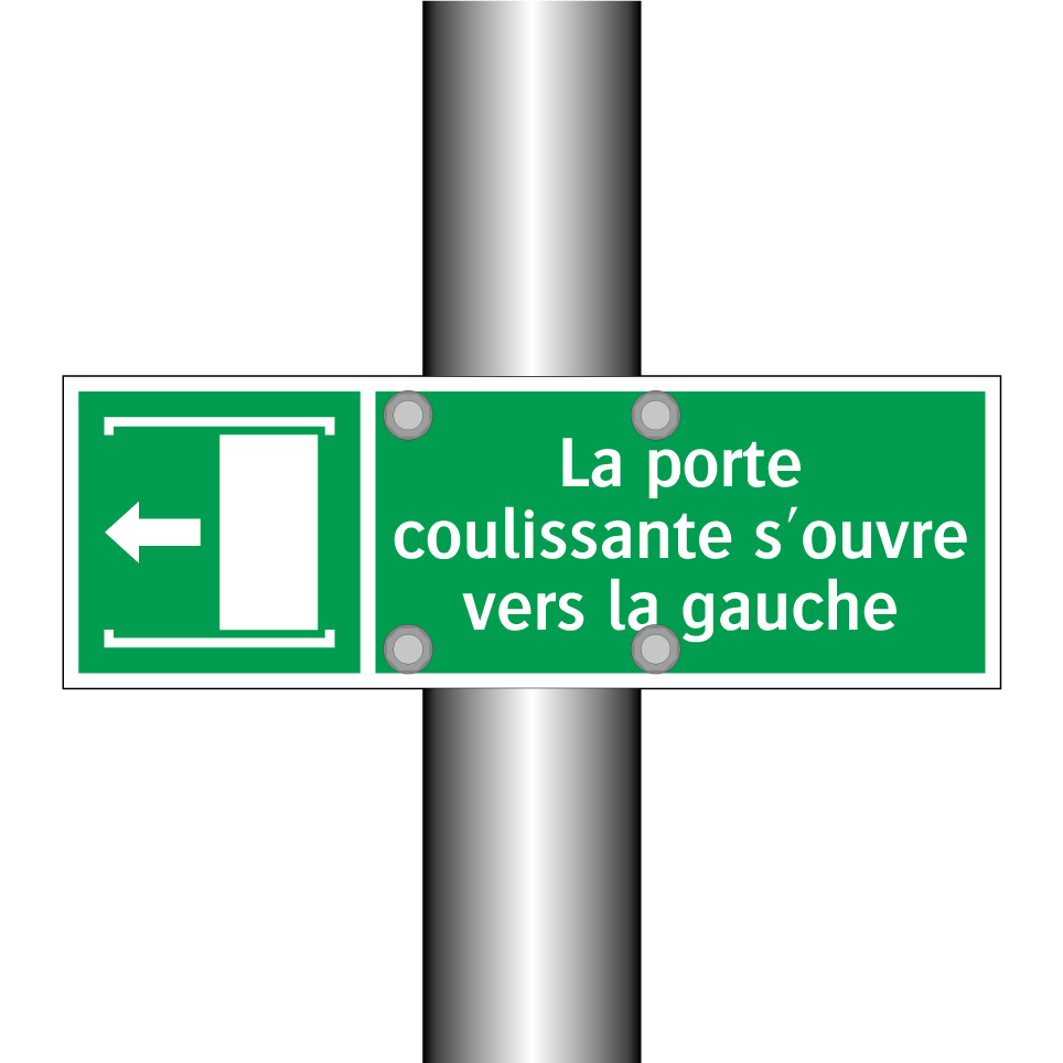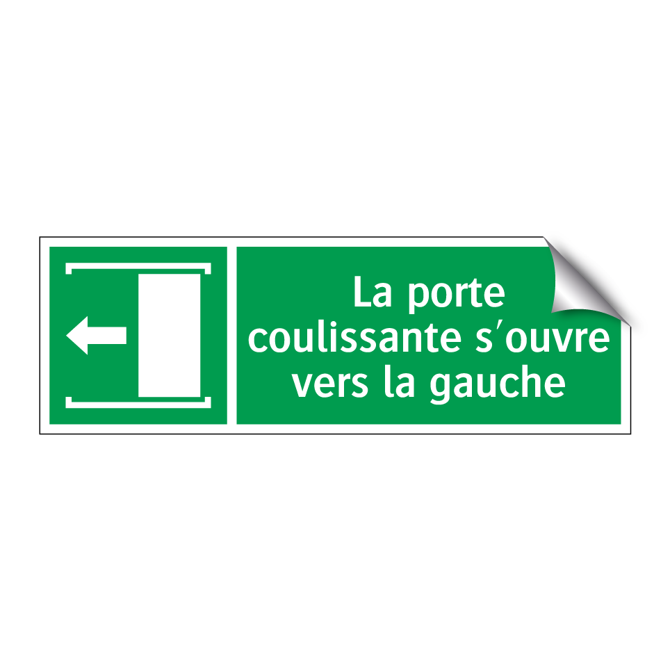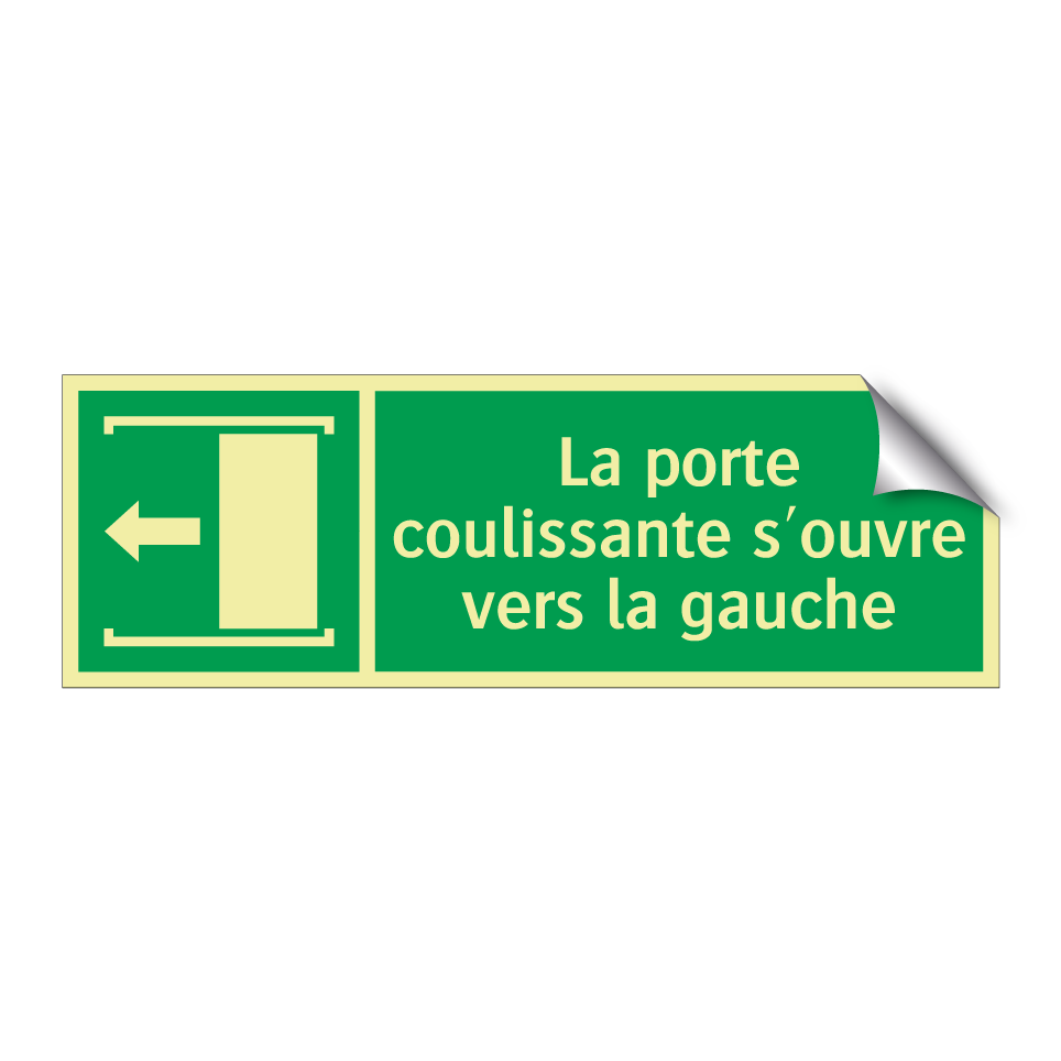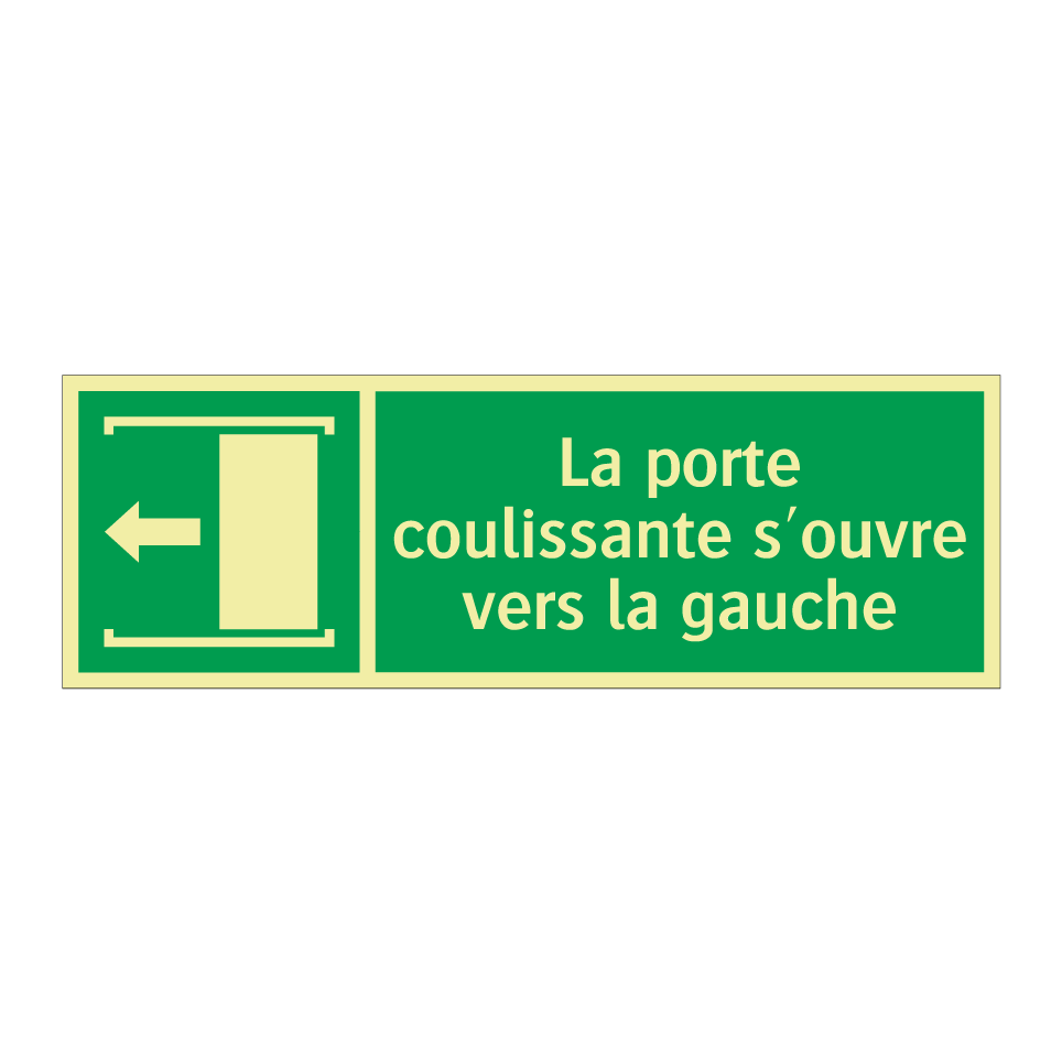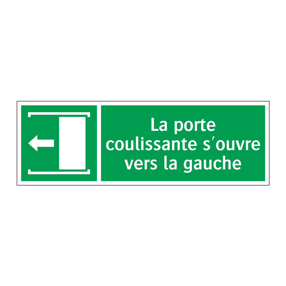 Panneau de secours avec le texte La porte coulissante s'ouvre vers la gauche et une symbolique claire