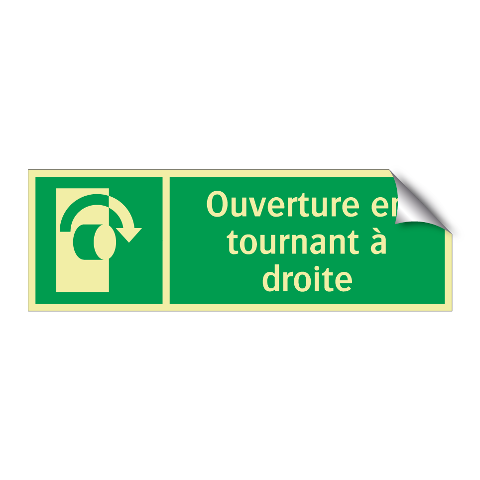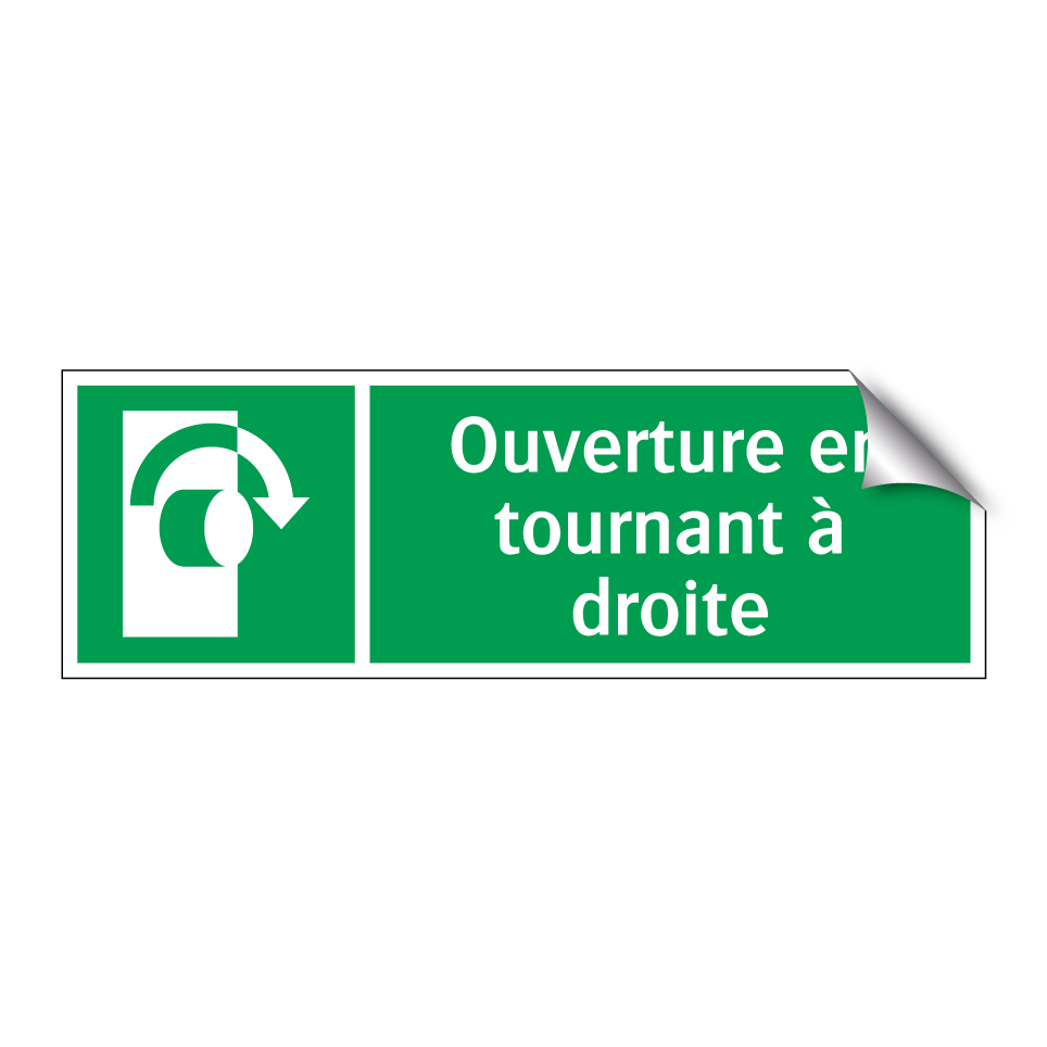 Panneau de secours avec le texte Ouverture en tournant à droite et une symbolique claire