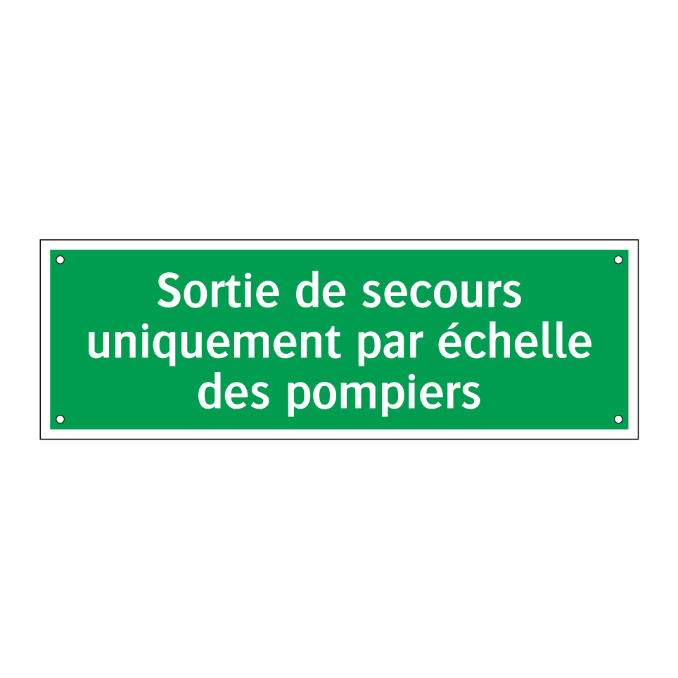 Cette enseigne de sécurité est idéale pour indiquer une sortie de secours accessible uniquement par l'échelle des pompiers. Elle est conçue pour être placée dans des bâtiments où l'accès direct à une issue de secours n'est pas possible, comme dans les immeubles de grande hauteur ou les installations industrielles. Grâce à sa couleur verte et son texte blanc, elle est facilement repérable en cas d'urgence. Installez-la près des escaliers, des couloirs ou des zones de rassemblement pour garantir une évacuation rapide et sécurisée.