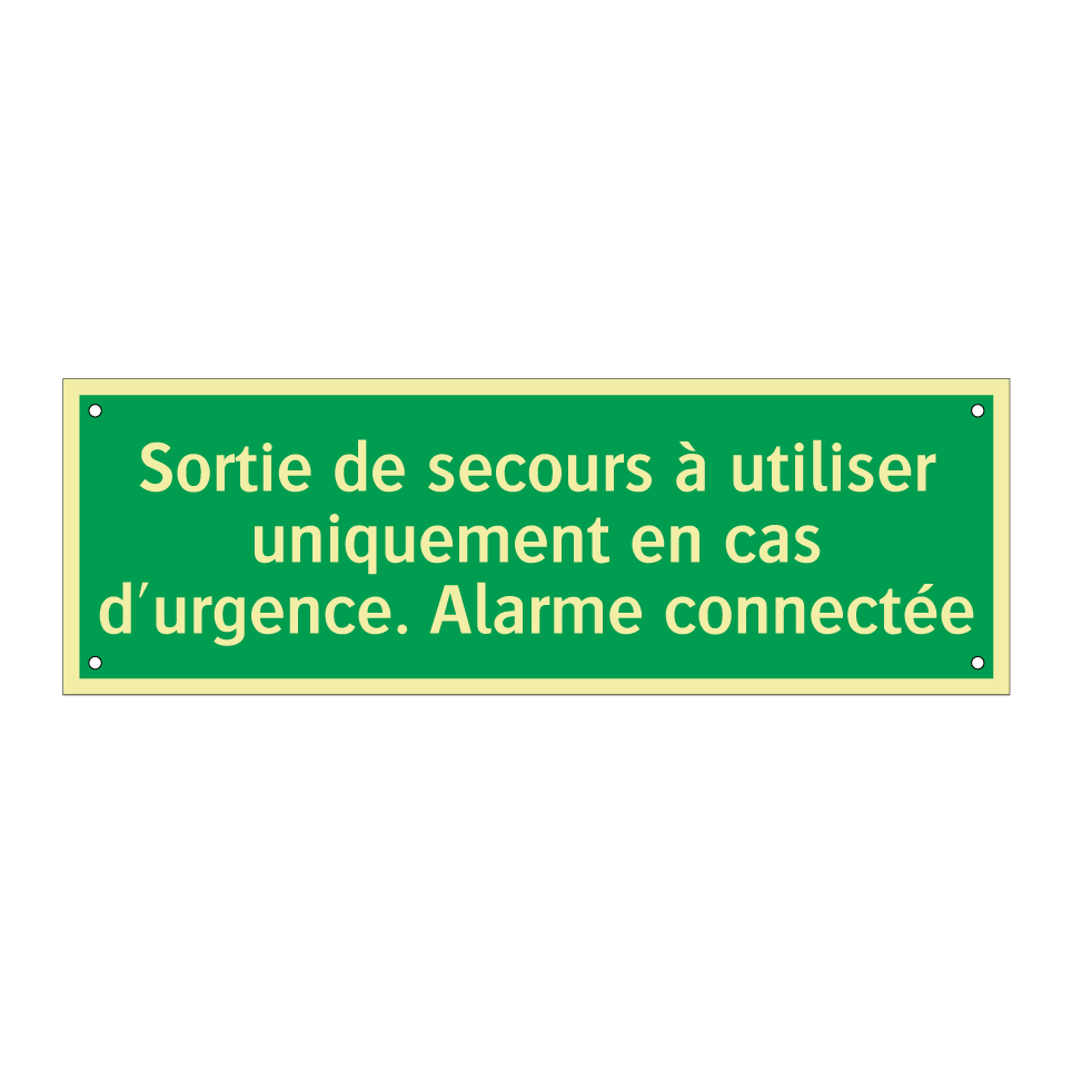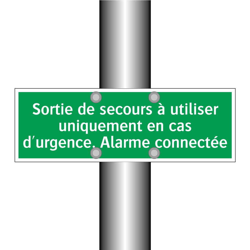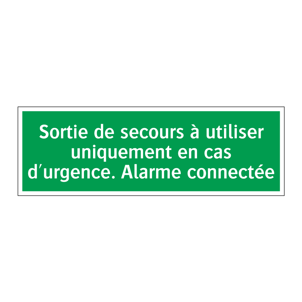 Panneau de secours avec le texte Sortie de secours à utiliser uniquement en cas d'urgence. Alarme connectée