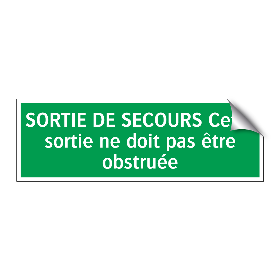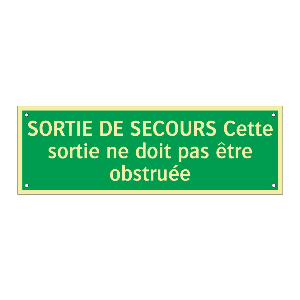Panneau de secours avec le texte SORTIE DE SECOURS Cette sortie ne doit pas être obstruée