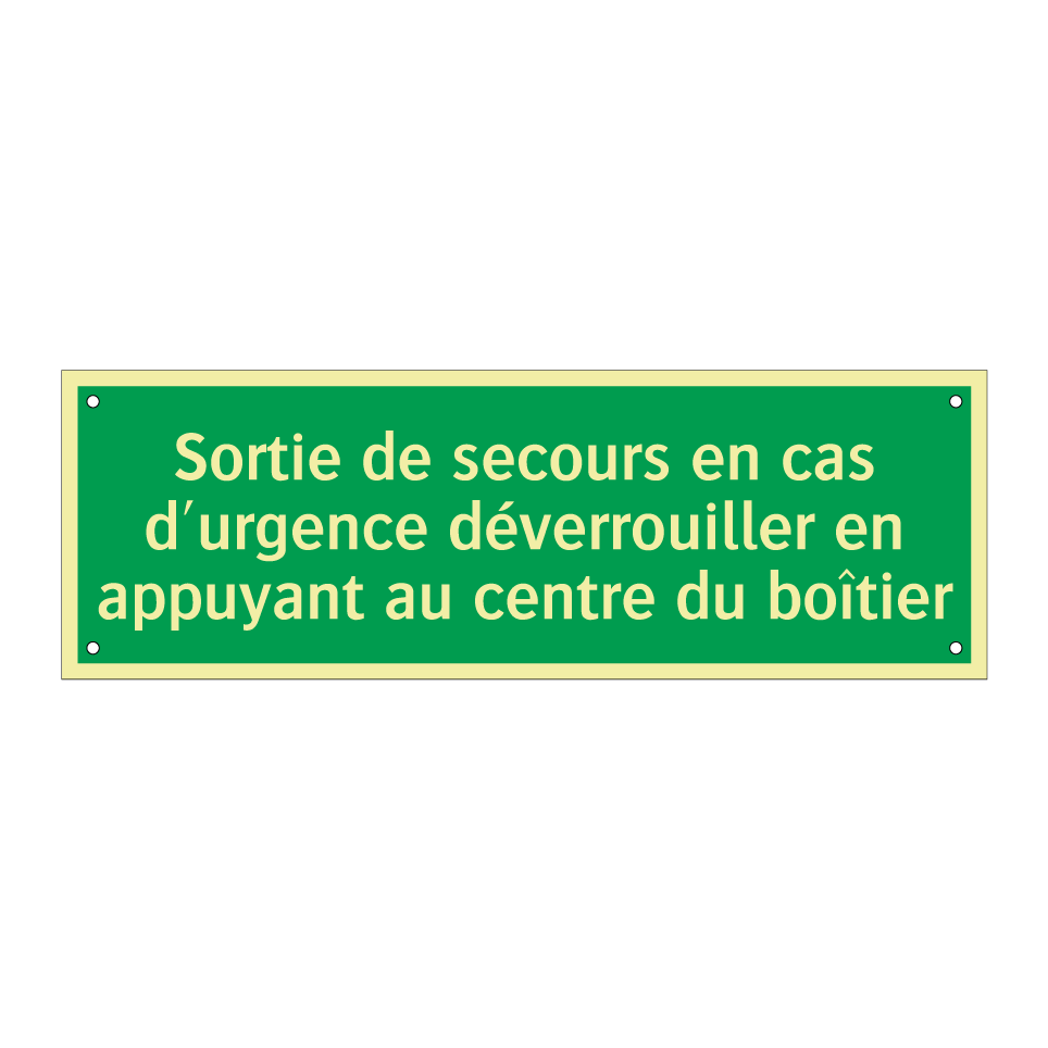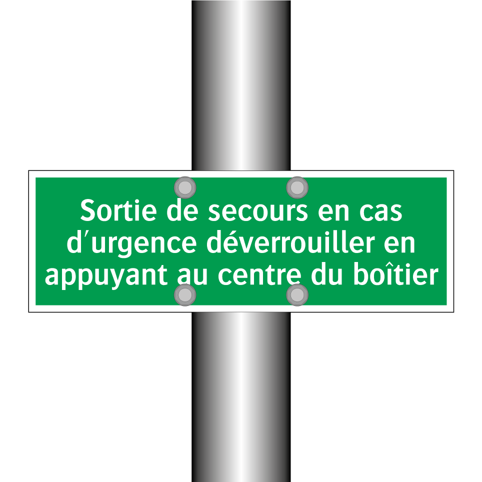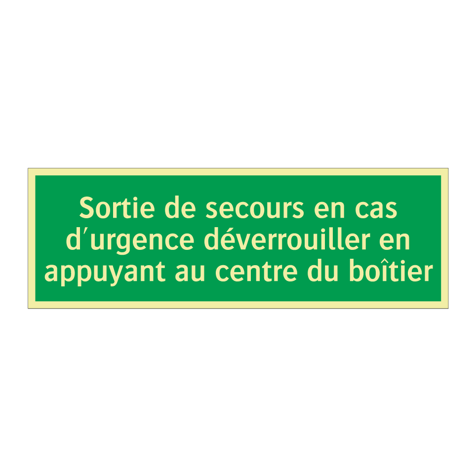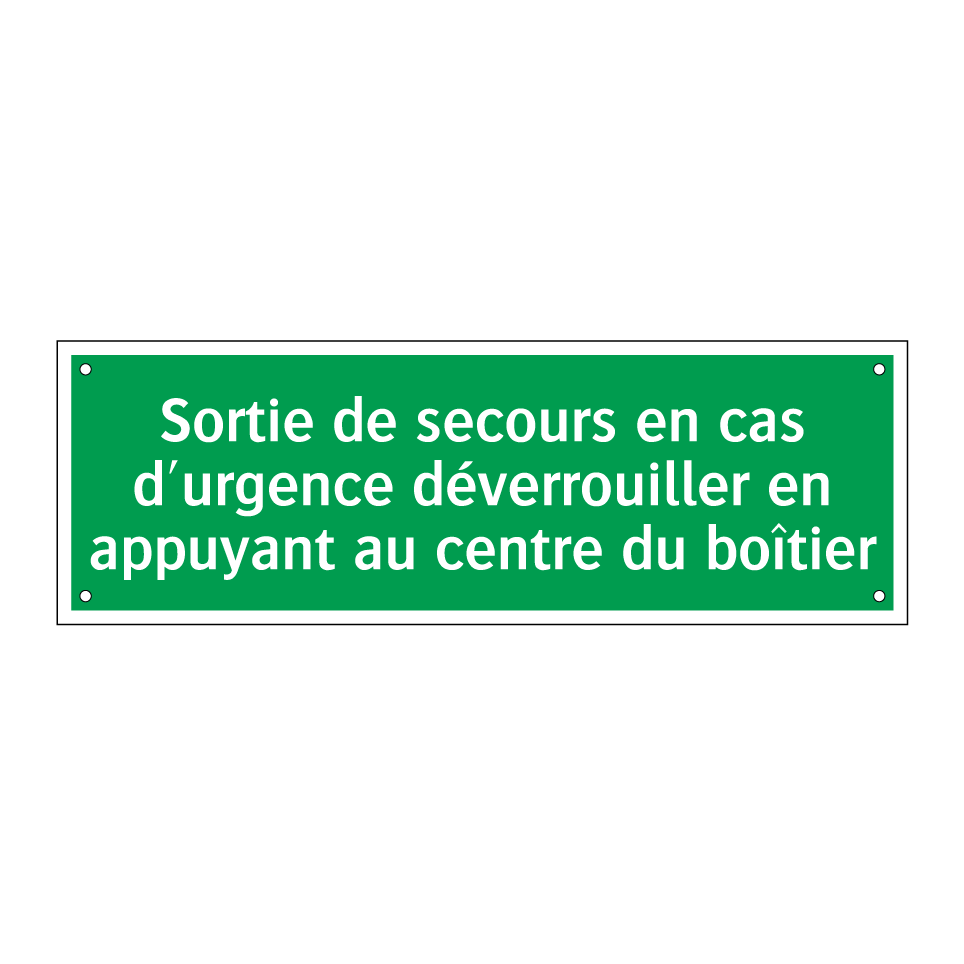 Panneau de secours avec le texte Sortie de secours en cas d'urgence déverrouiller en appuyant au centre du boîtier
