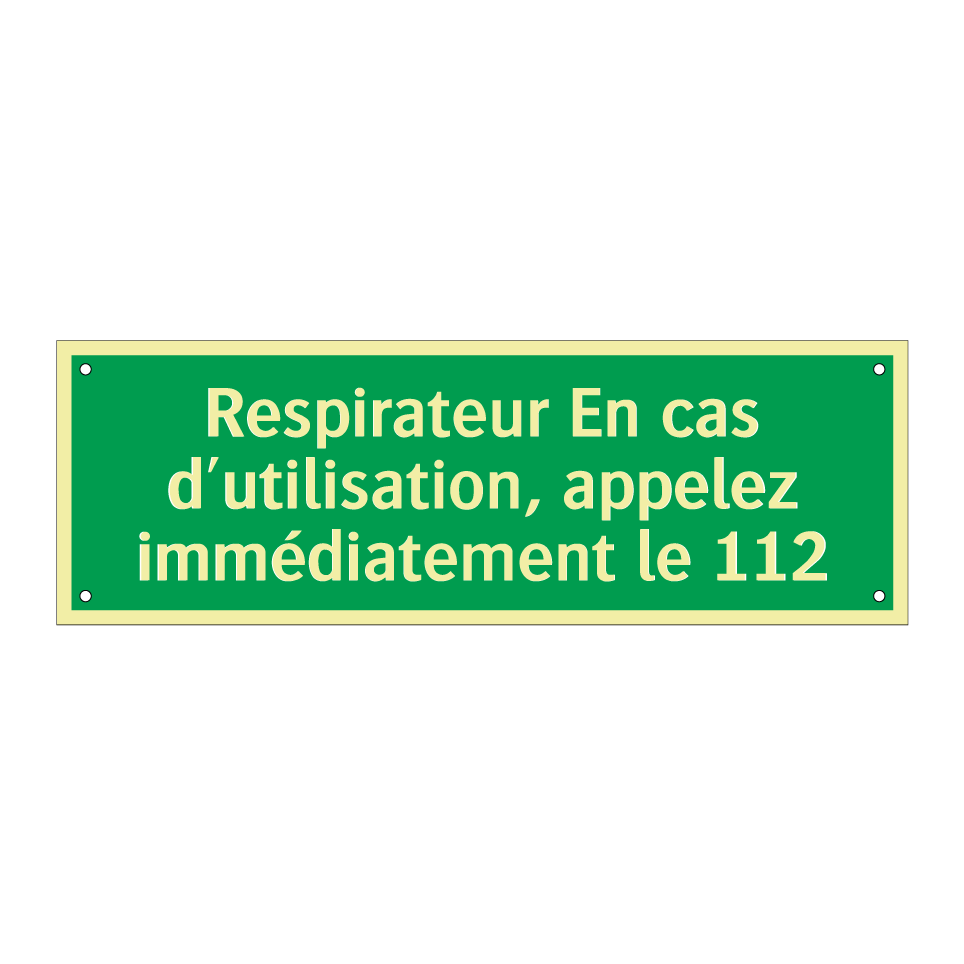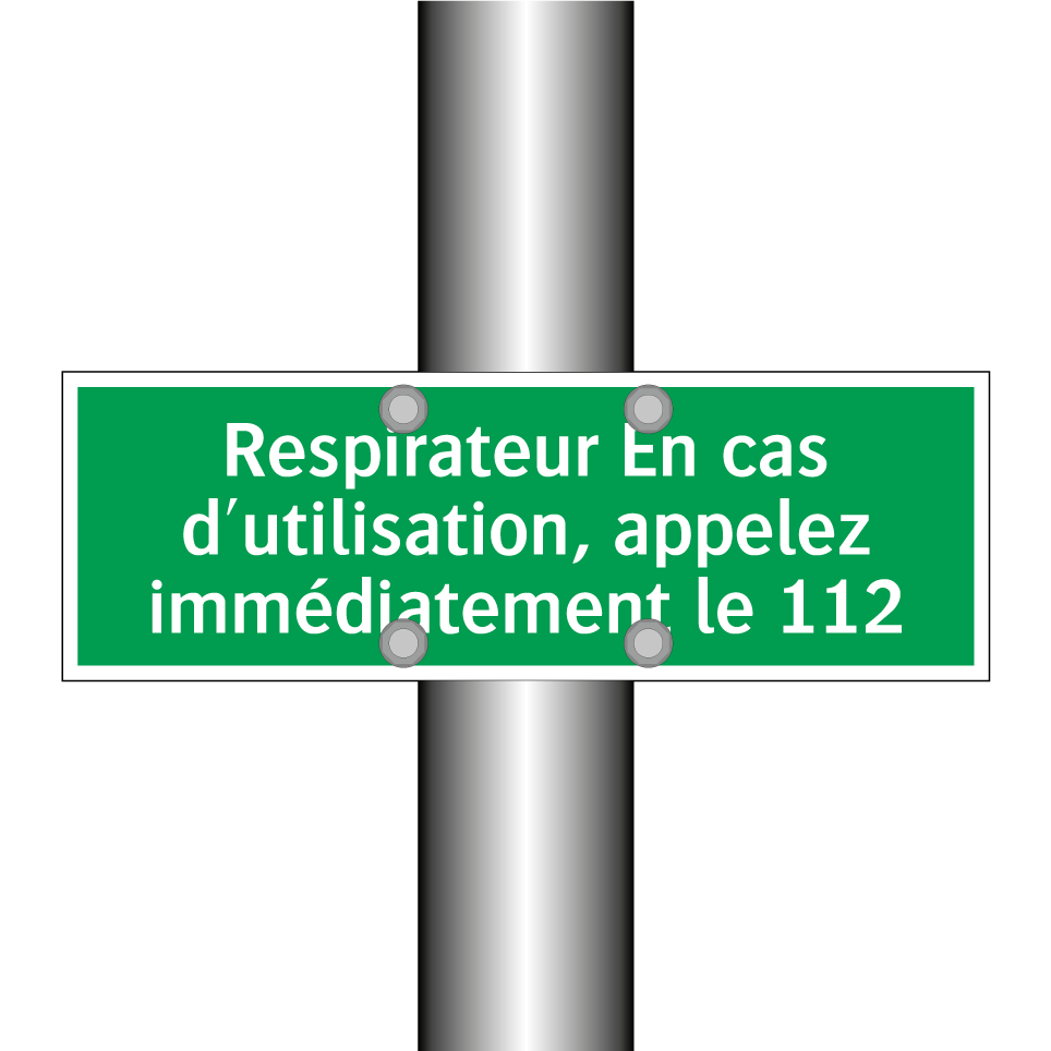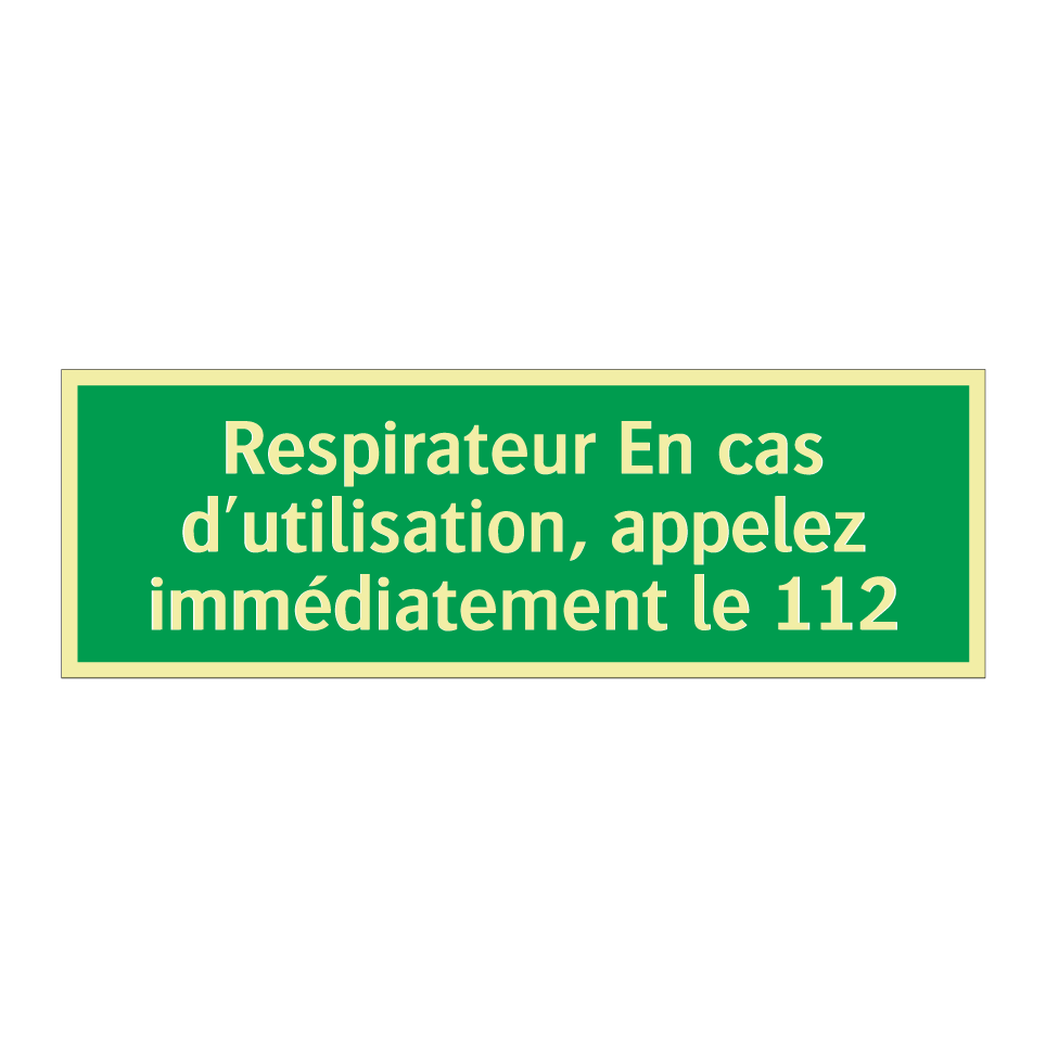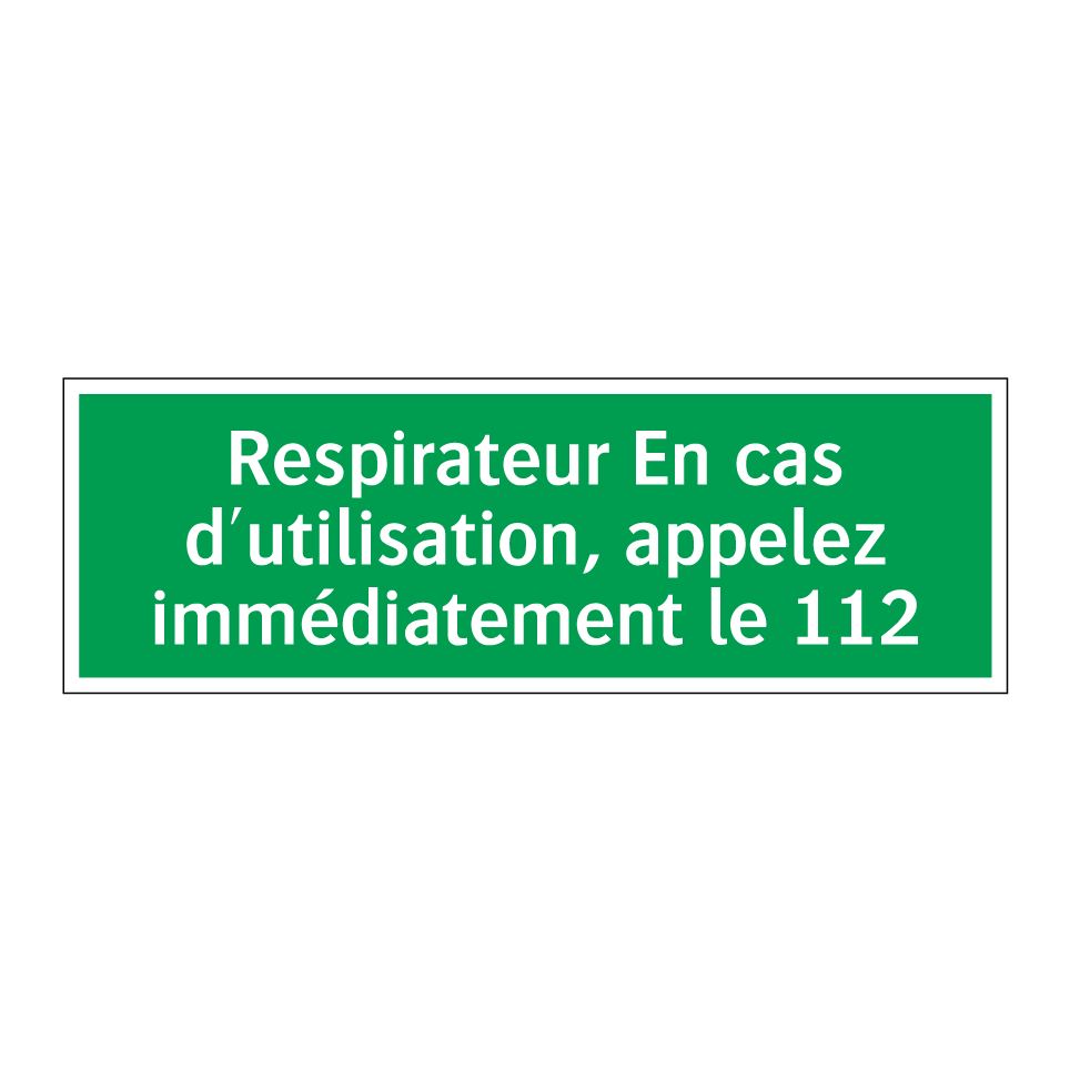Panneau de secours avec le texte Respirateur En cas d'utilisation, appelez immédiatement le 112