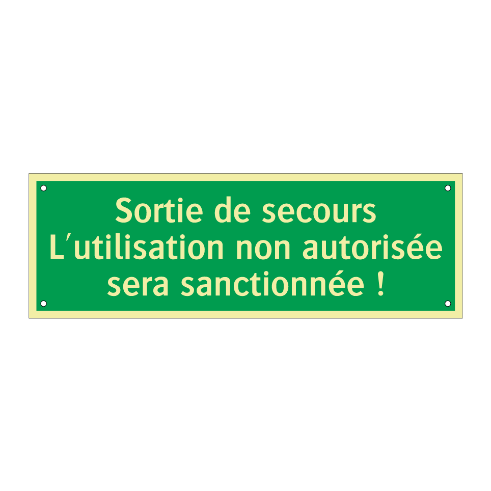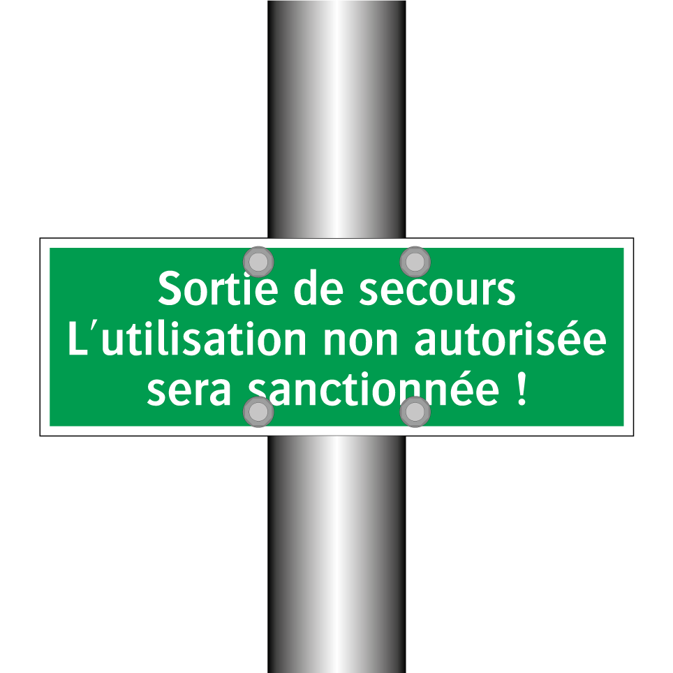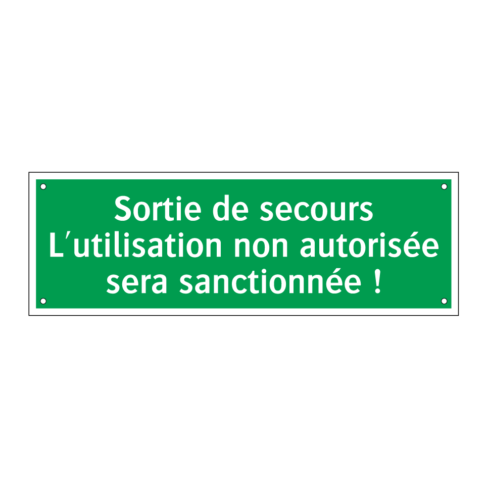 Panneau de secours avec le texte Sortie de secours L'utilisation non autorisée sera sanctionnée !
