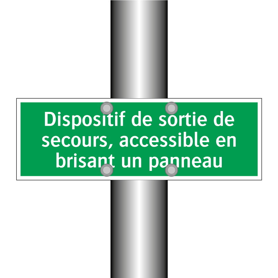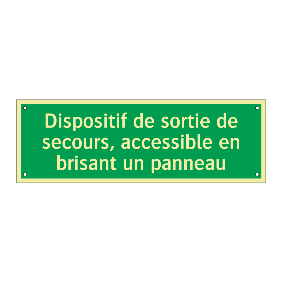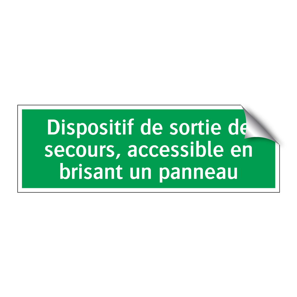 Panneau de secours avec le texte Dispositif de sortie de secours, accessible en brisant un panneau