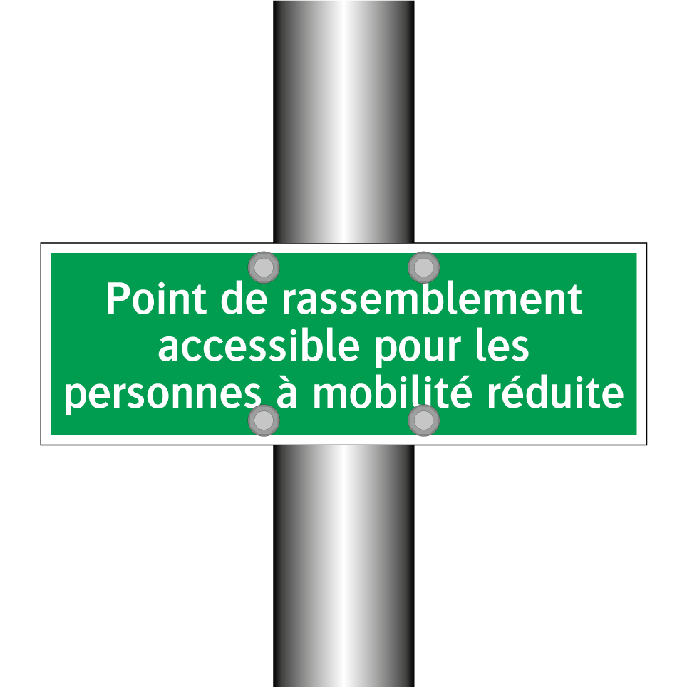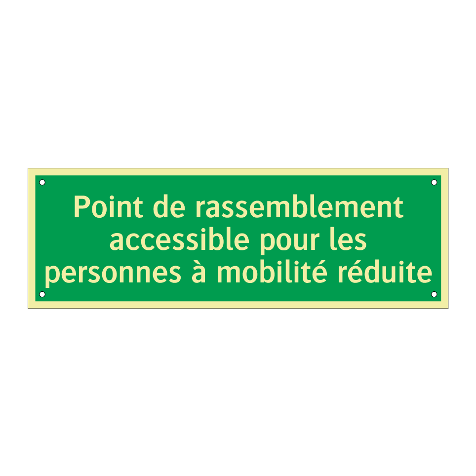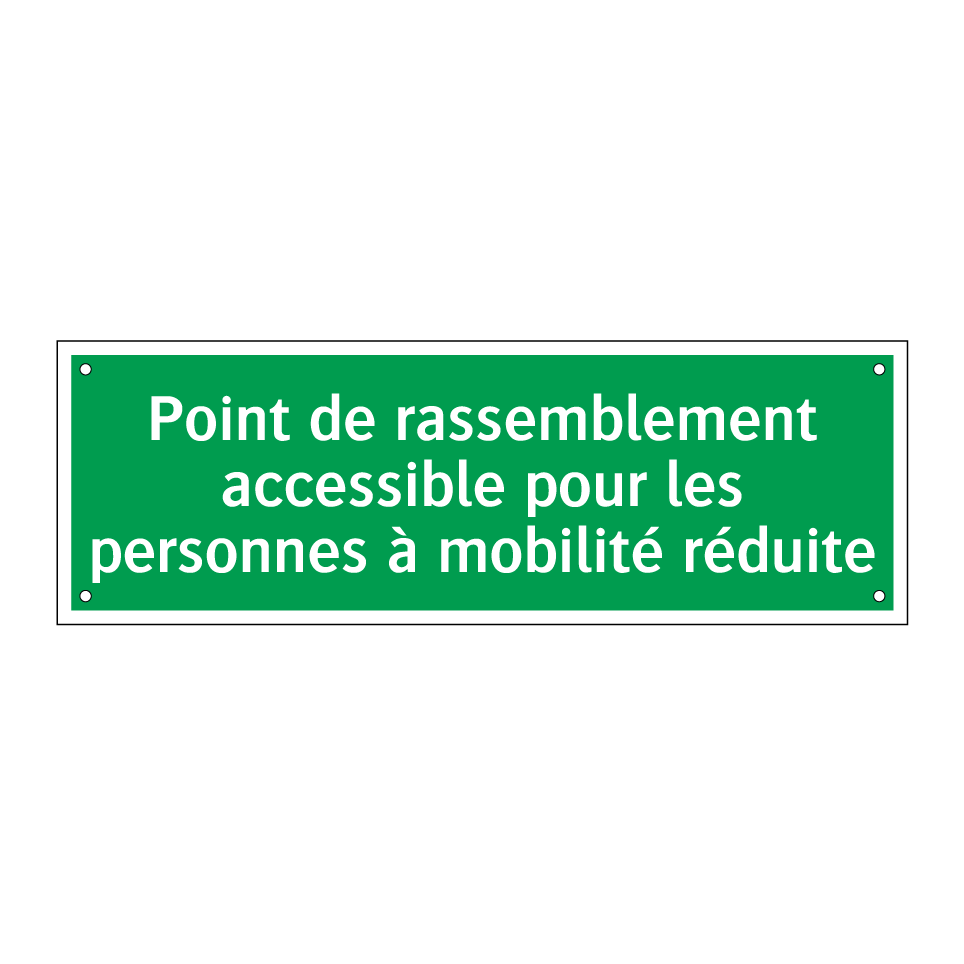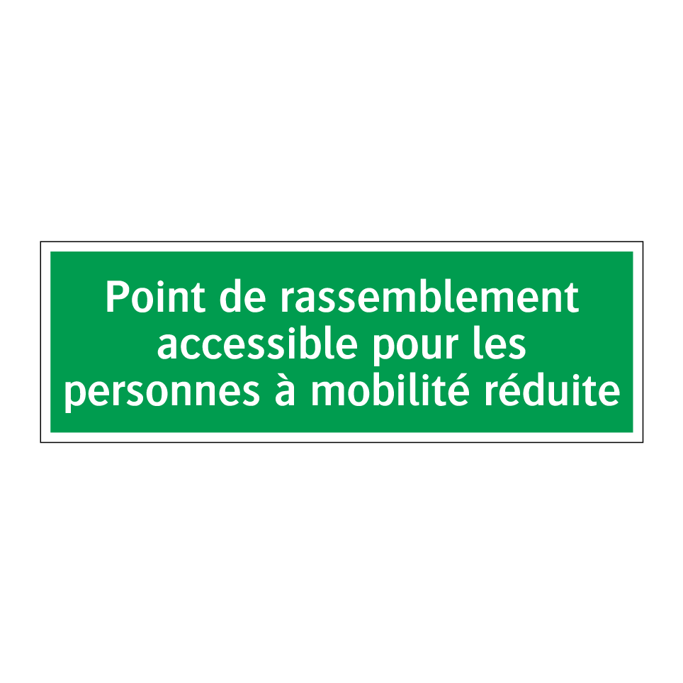 Panneau de secours avec le texte Point de rassemblement accessible pour les personnes à mobilité réduite
