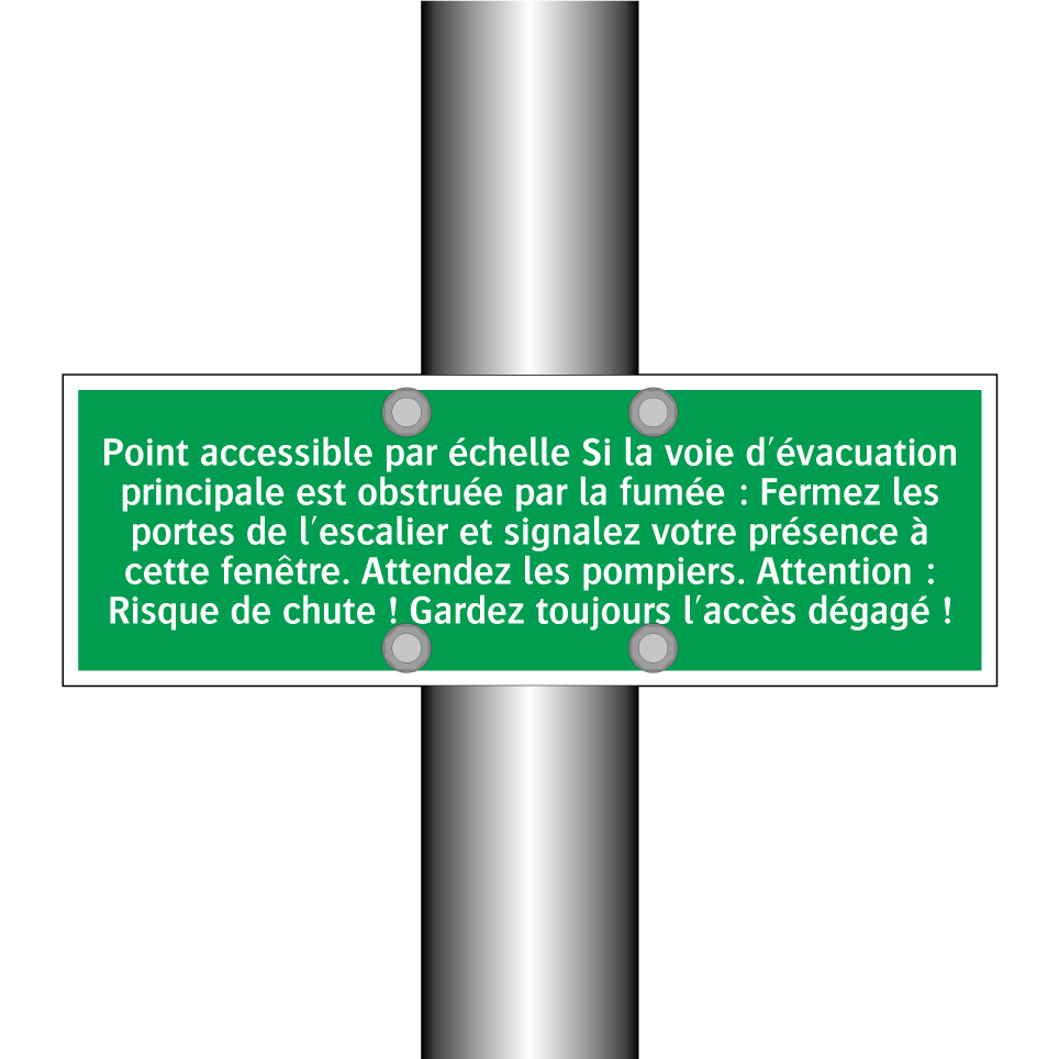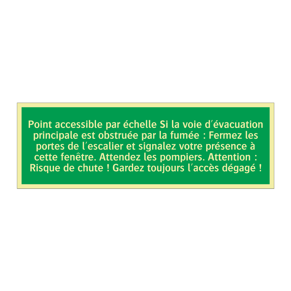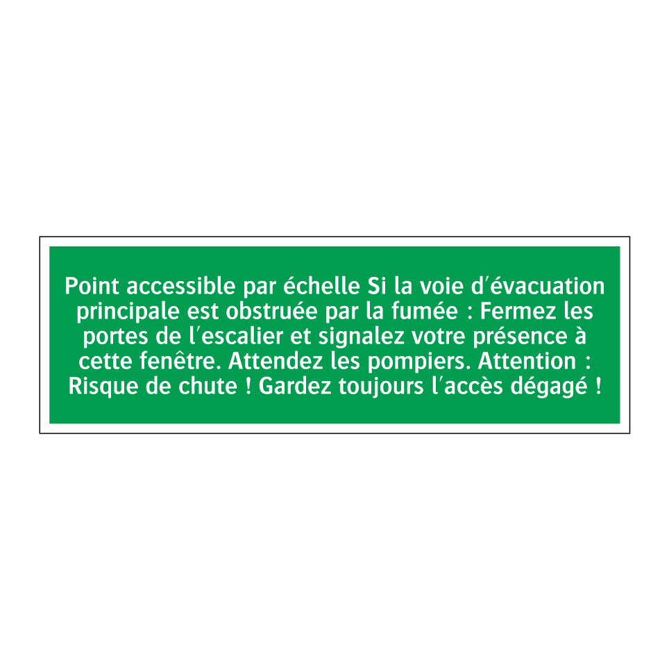 Panneau de secours avec le texte Point accessible par échelle Si la voie d'évacuation principale est obstruée par la fumée : Fermez les portes de l'escalier et signalez votre présence à cette fenêtre. Attendez les pompiers. Attention : Risque de chute ! Gardez toujours l'accès dégagé !