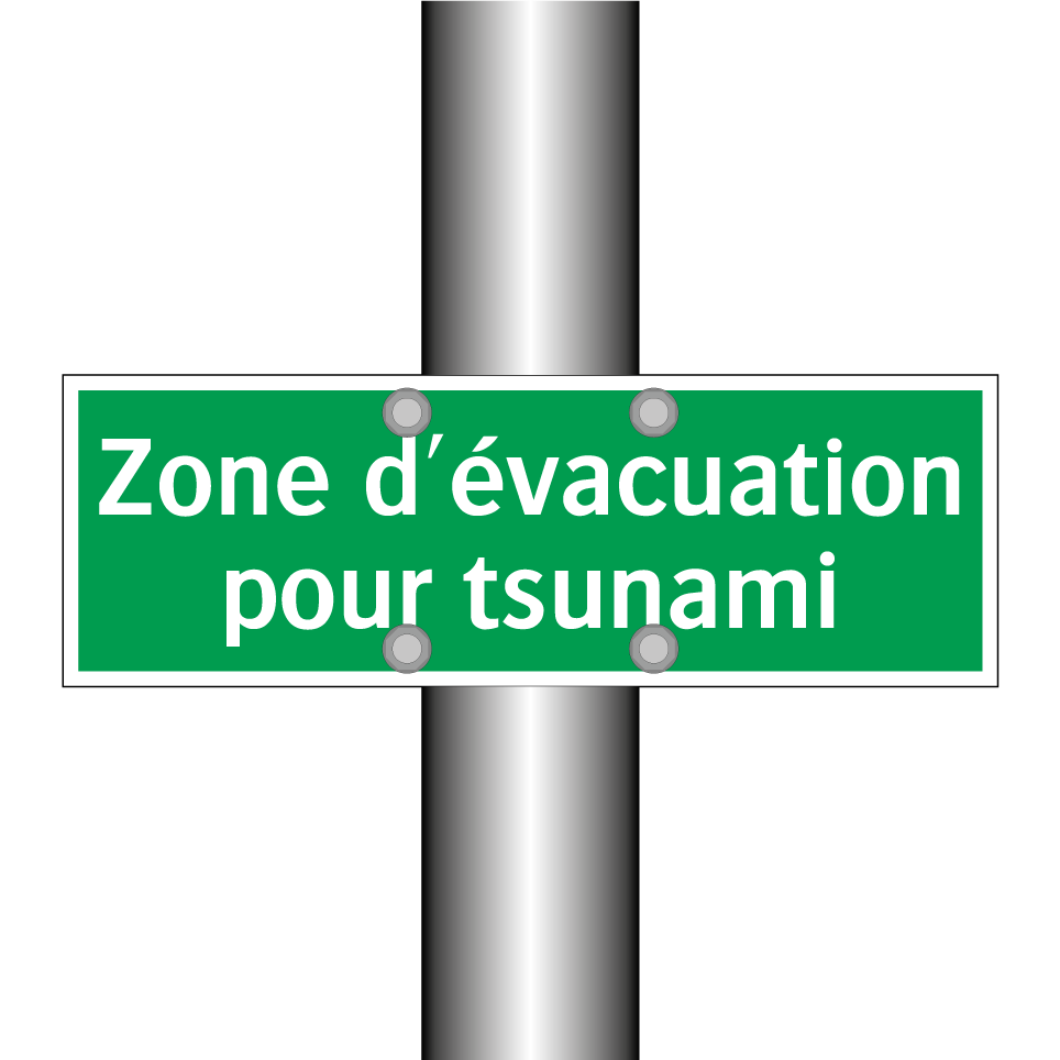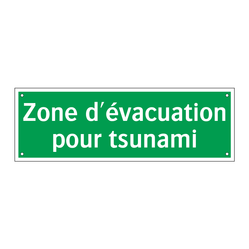 Cette pancarte d'évacuation en cas de tsunami est essentielle pour garantir la sécurité dans les zones à risque. Elle est idéale pour être installée dans les régions côtières, les plages, les ports et les zones touristiques sujettes aux tsunamis. Sa couleur verte et son texte blanc assurent une visibilité optimale, même de loin. Utilisée pour guider les personnes vers des zones sûres, elle peut être placée à des intersections clés, des sorties de bâtiments ou le long des routes d'évacuation. Cette signalisation est cruciale pour une évacuation rapide et ordonnée en cas d'urgence.