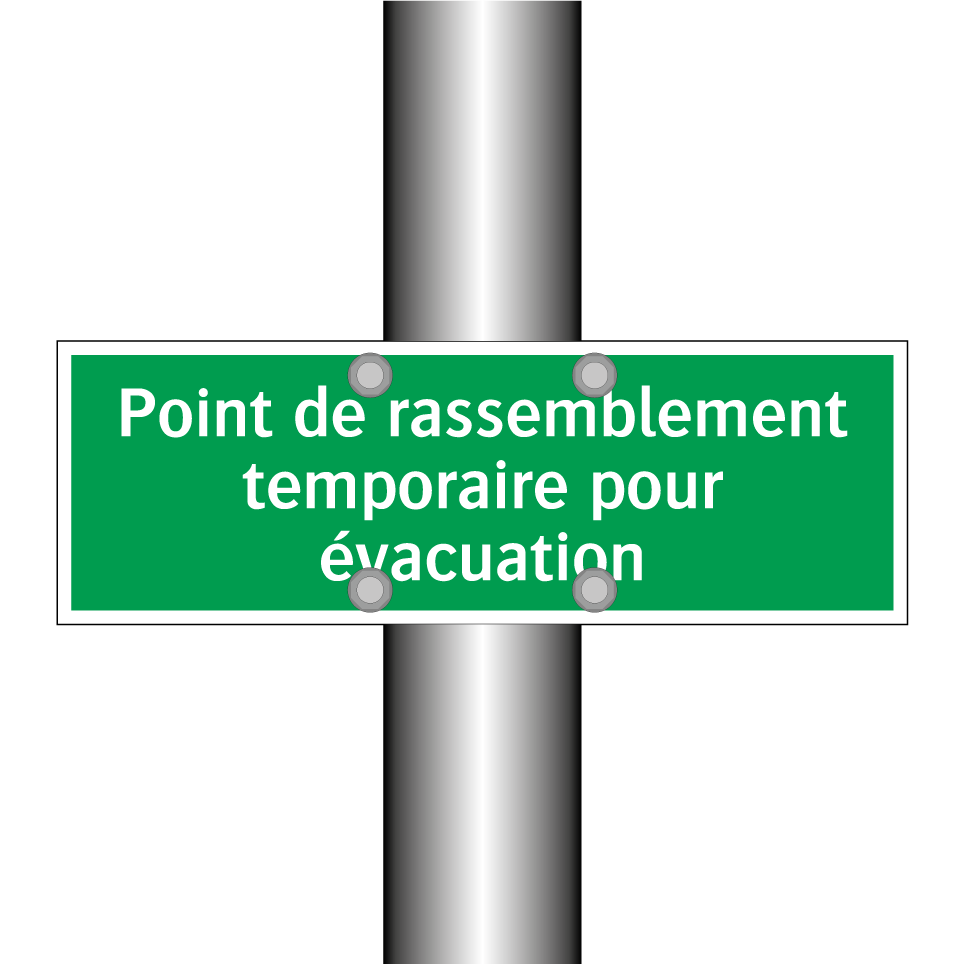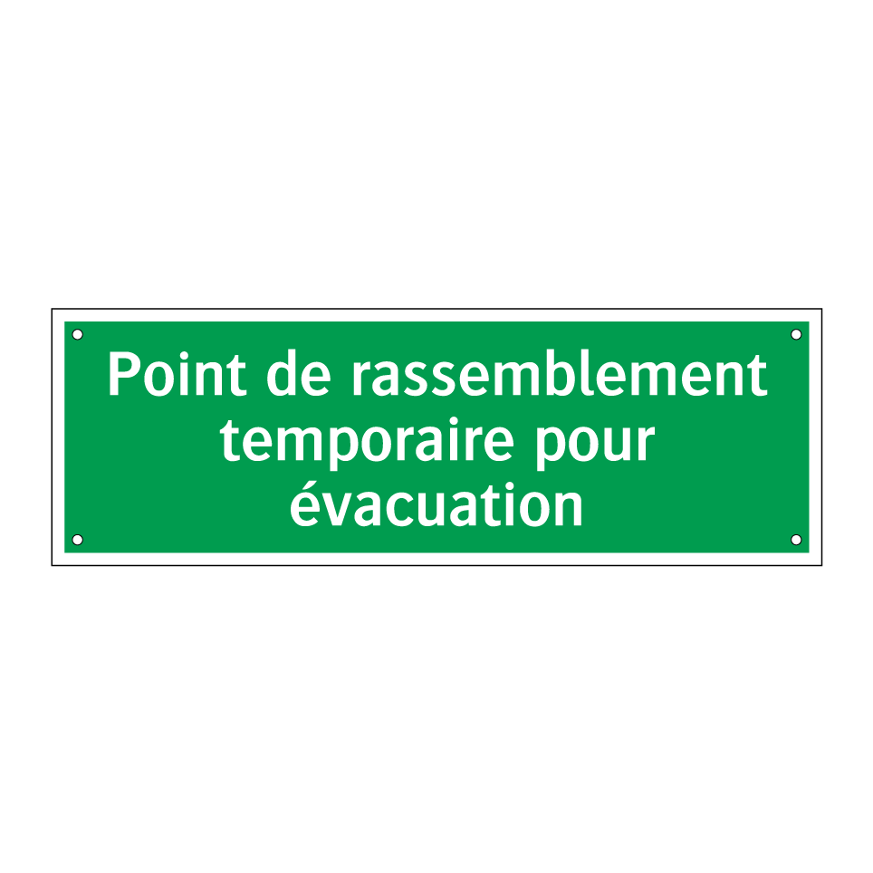 Panneau de secours avec le texte Point de rassemblement temporaire pour évacuation