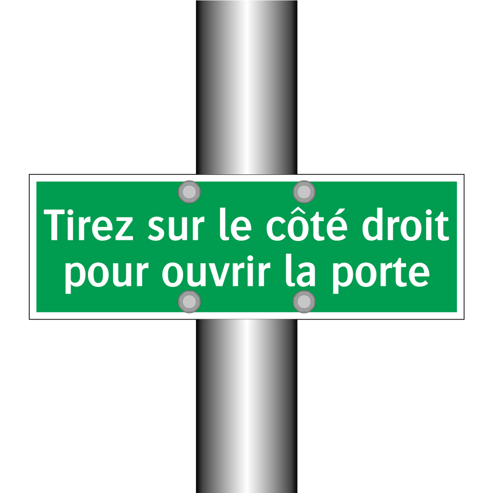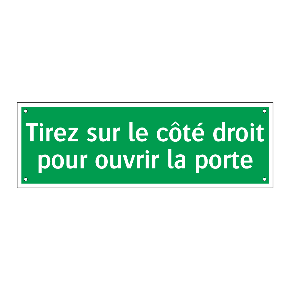 Panneau de secours avec le texte Tirez sur le côté droit pour ouvrir la porte