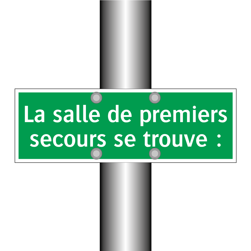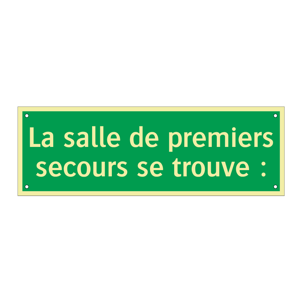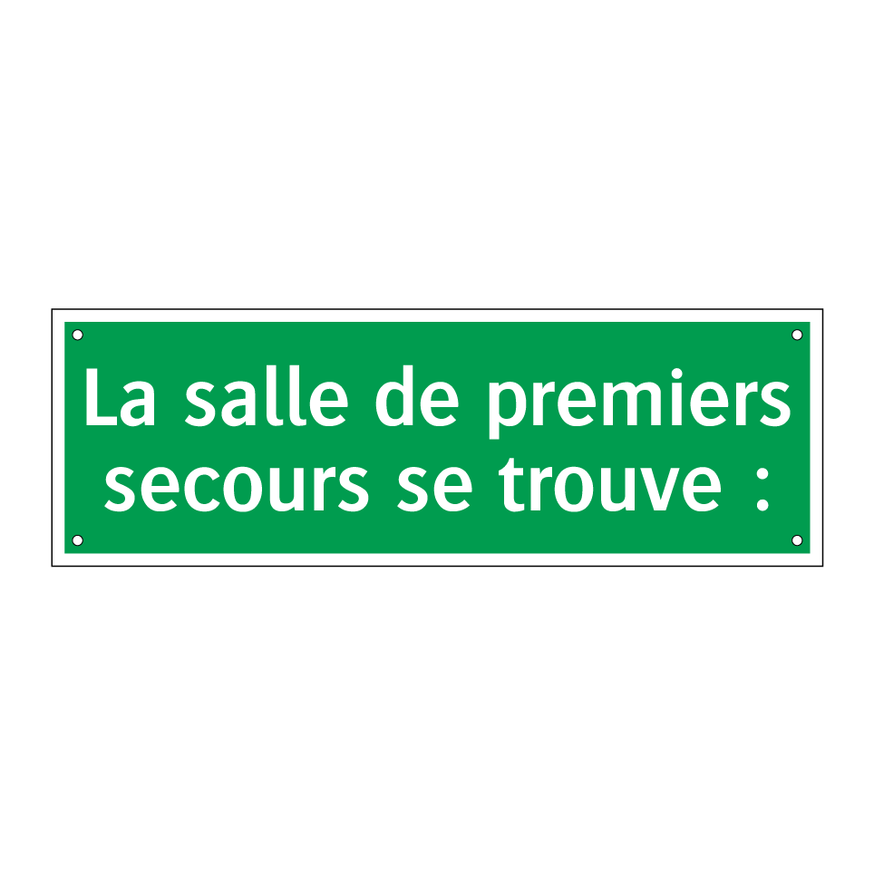 Panneau de secours avec le texte La salle de premiers secours se trouve :