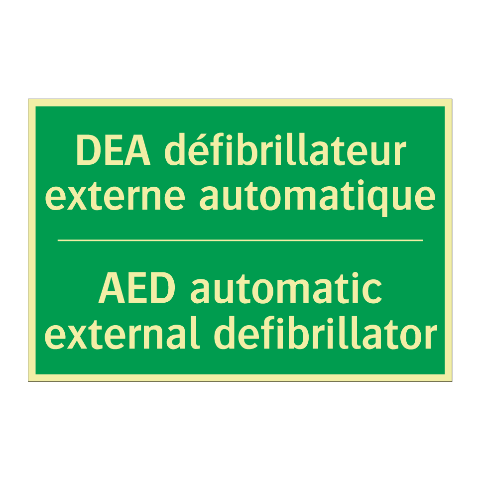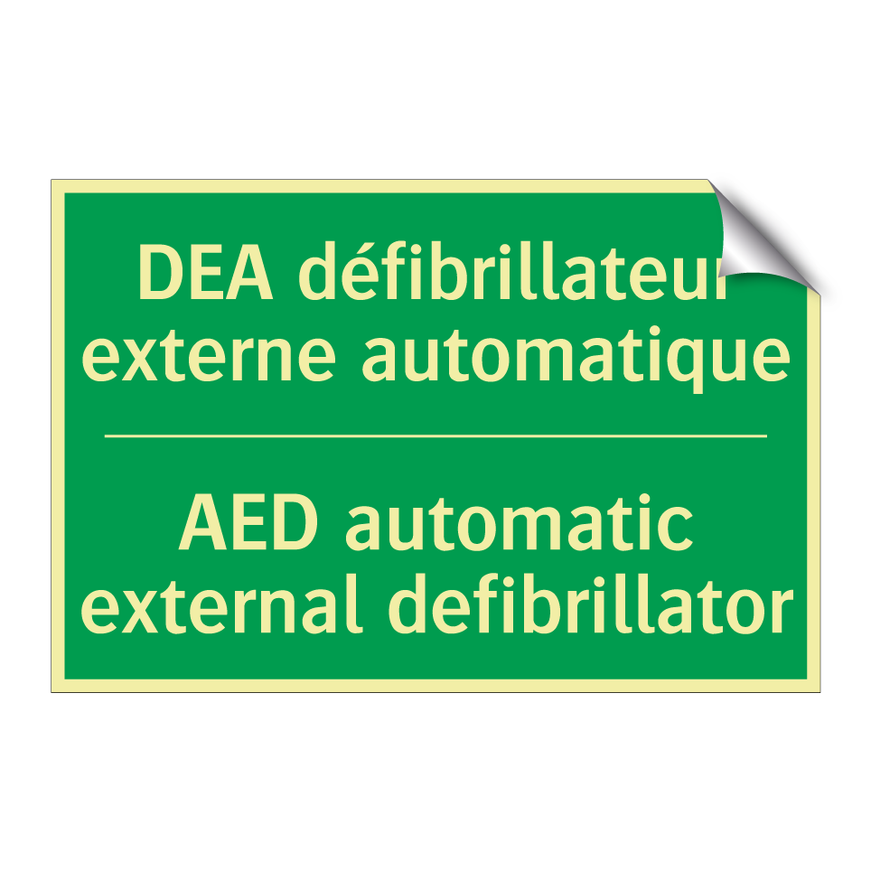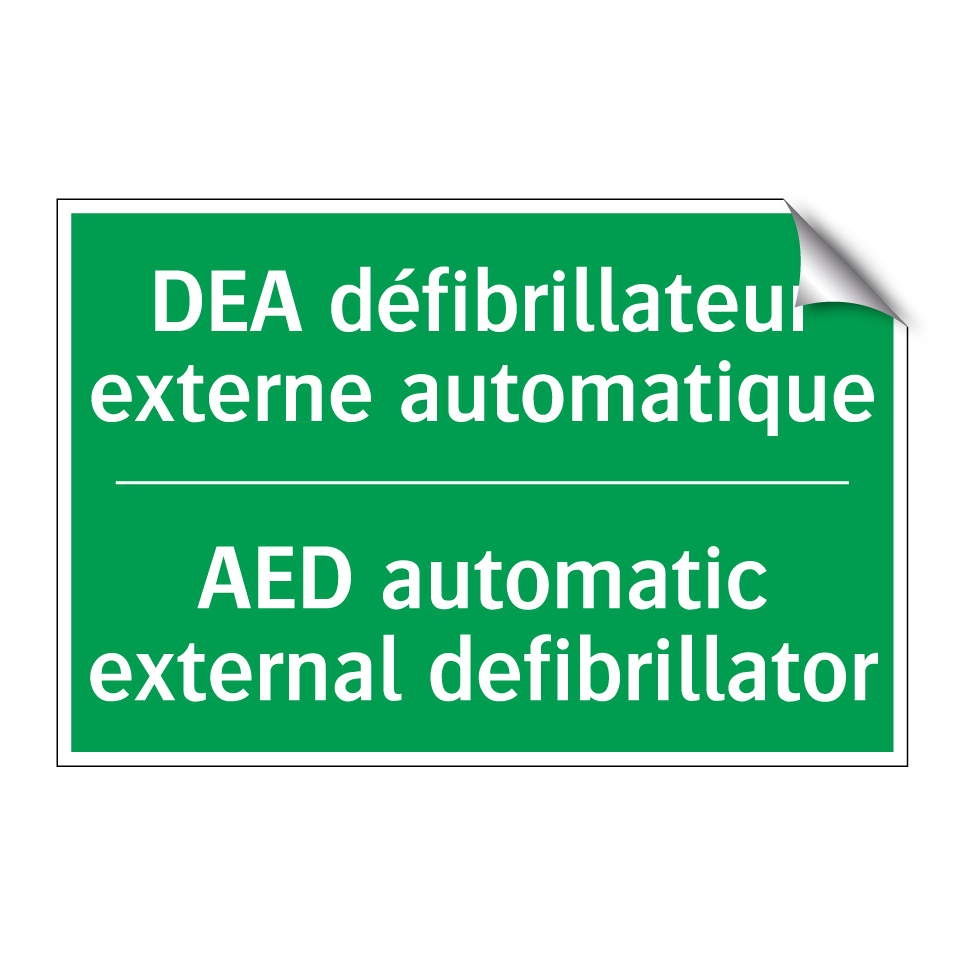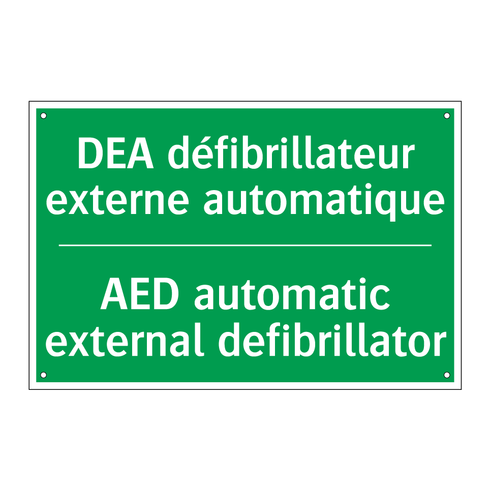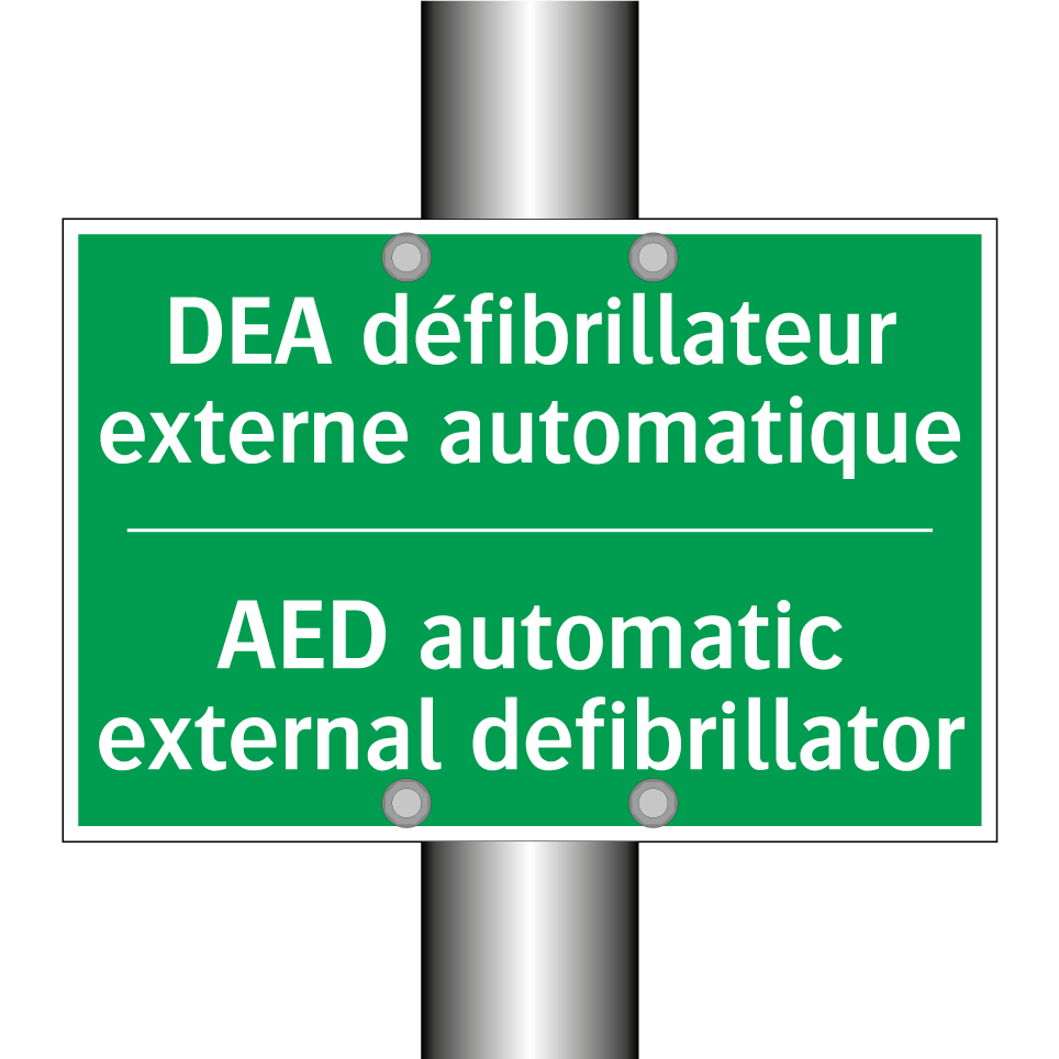 Panneau de secours bilingue avec texte en français : "DEA défibrillateur externe automatique", et en anglais : "AED automatic external defibrillator"