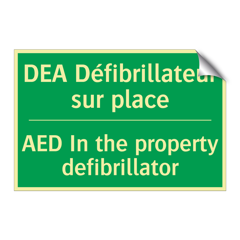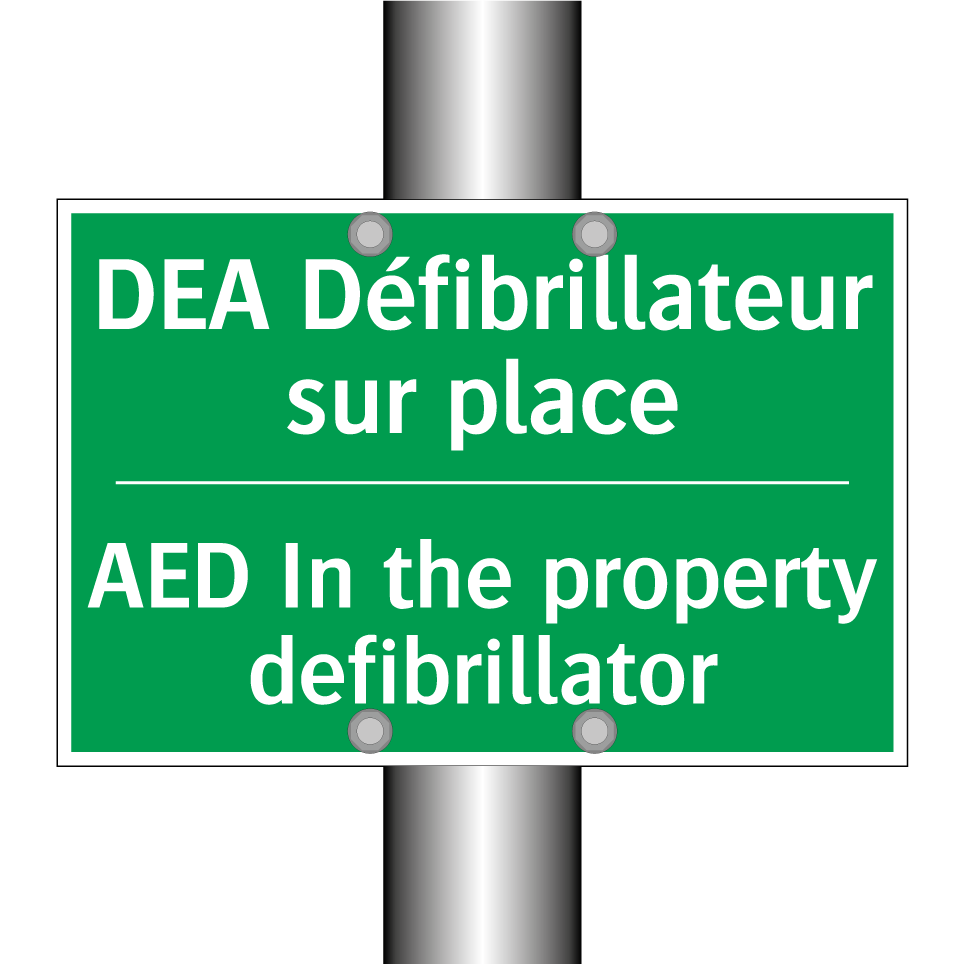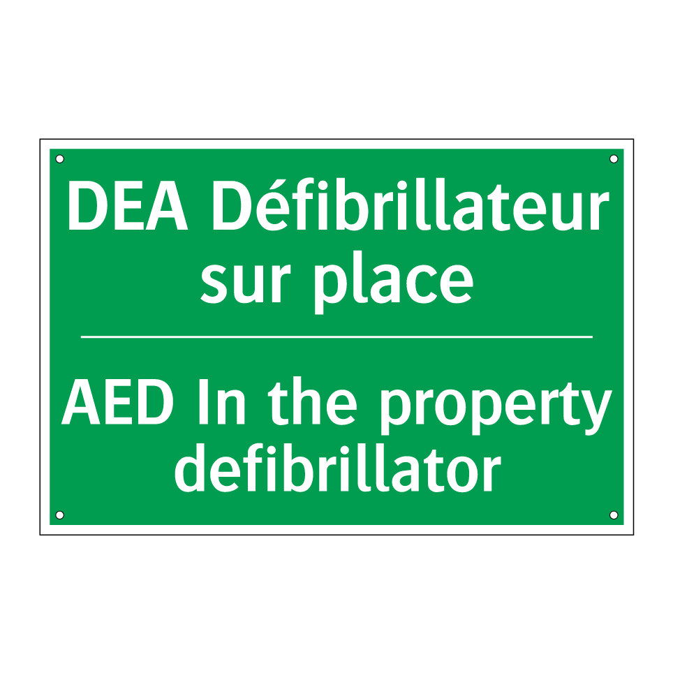 Panneau de secours bilingue avec texte en français : "DEA Défibrillateur sur place", et en anglais : "AED In the property defibrillator"