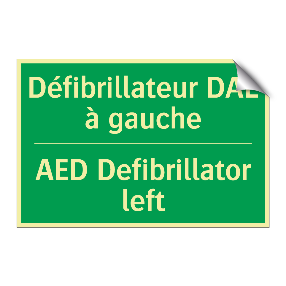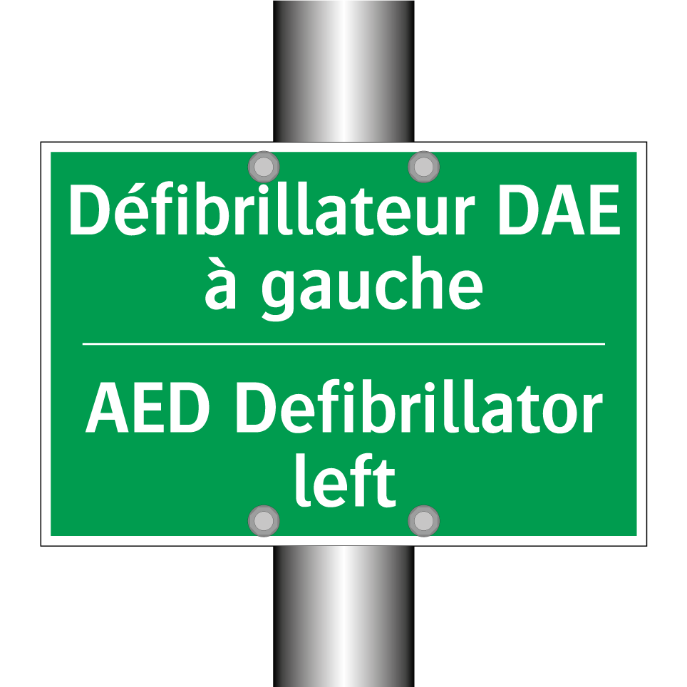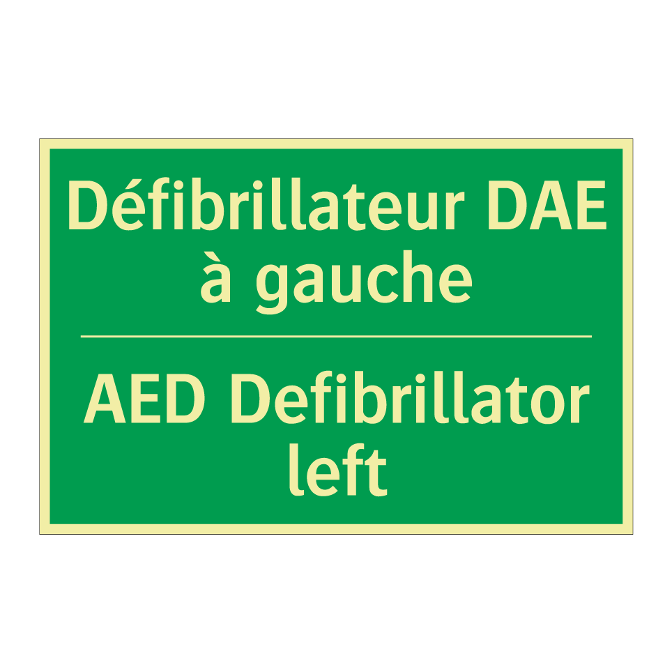 Panneau de secours bilingue avec texte en français : "Défibrillateur DAE à gauche", et en anglais : "AED Defibrillator left"