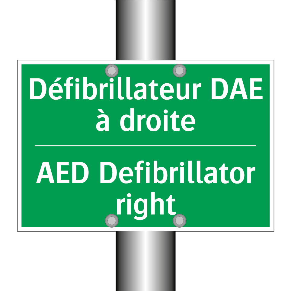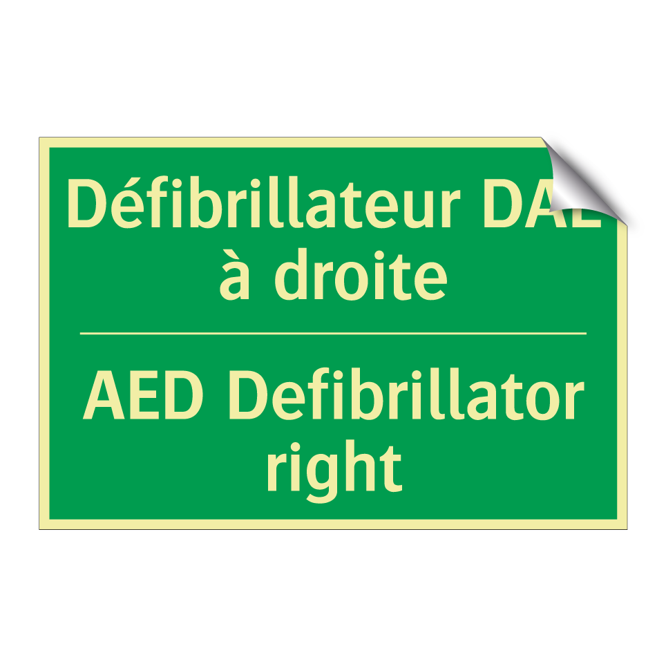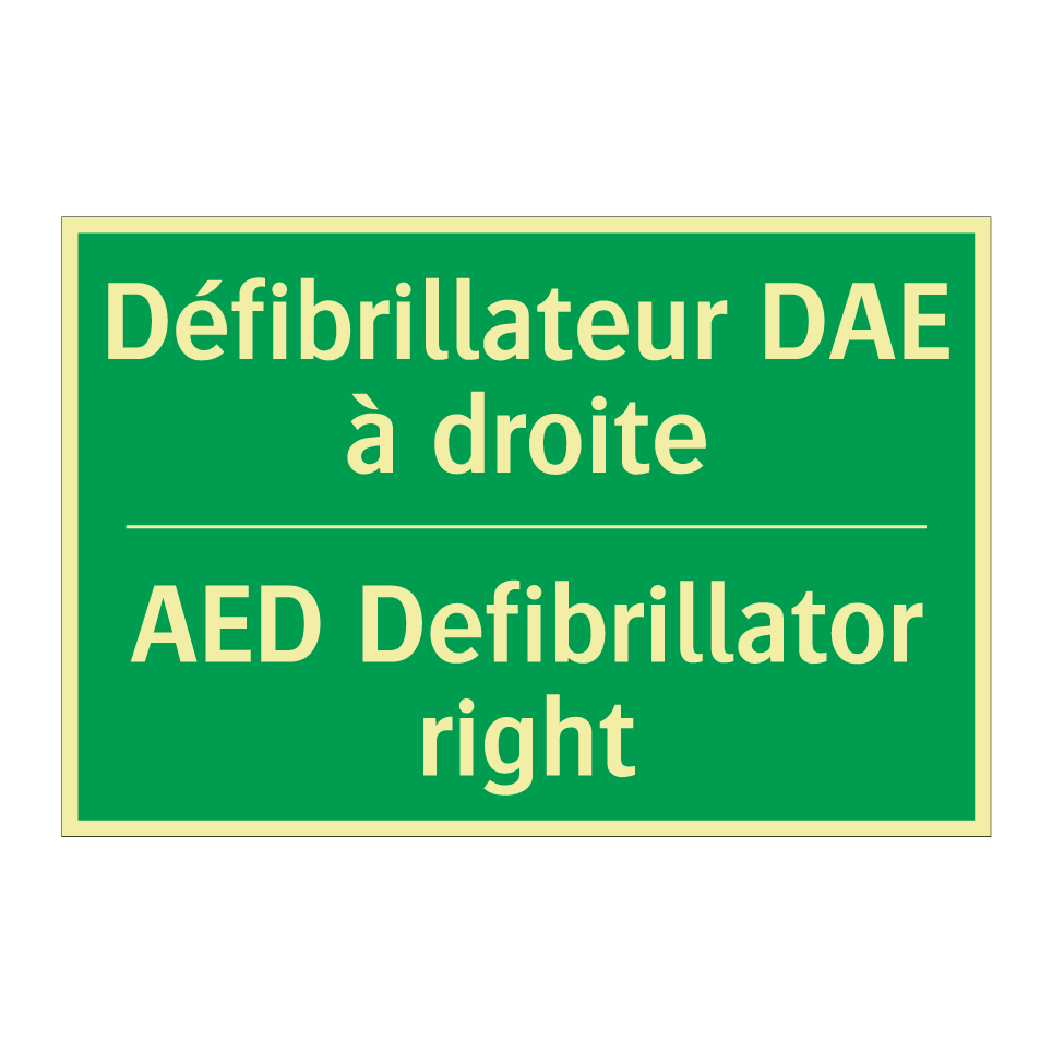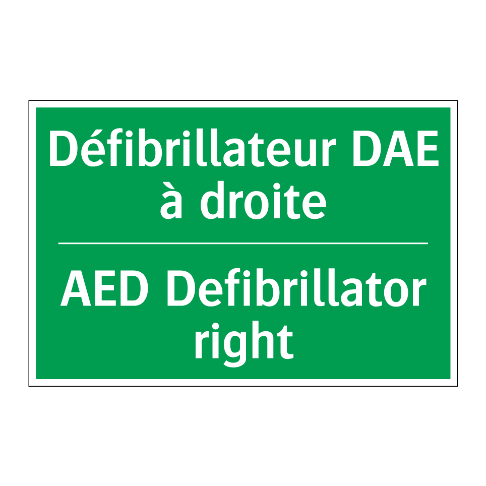 Panneau de secours bilingue avec texte en français : "Défibrillateur DAE à droite", et en anglais : "AED Defibrillator right"