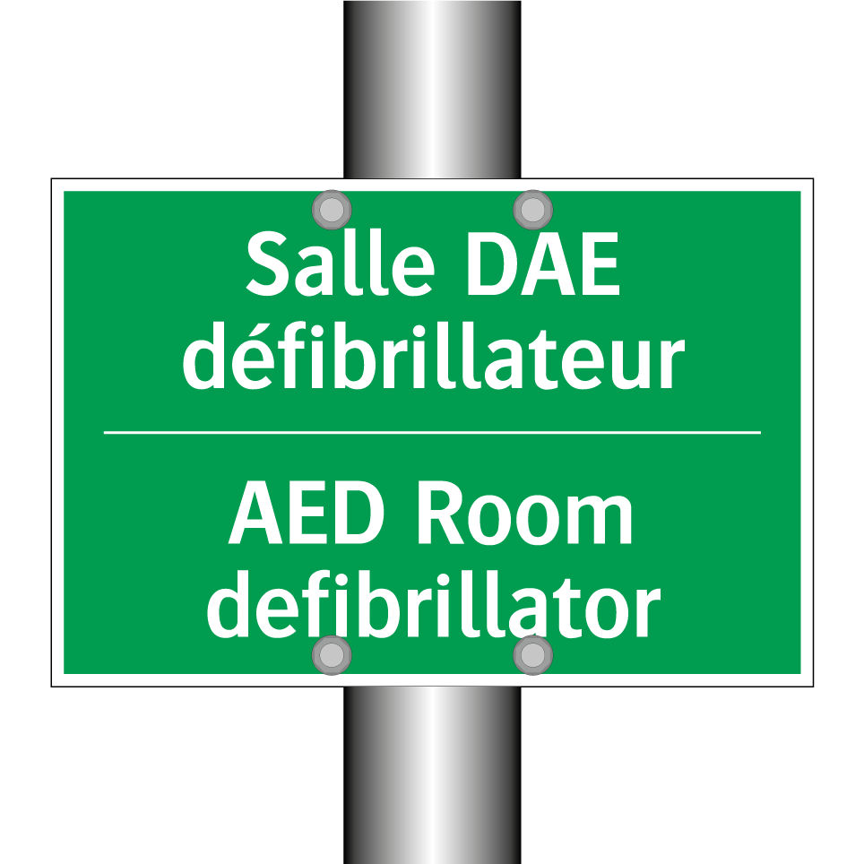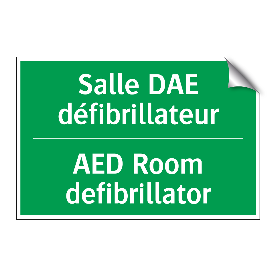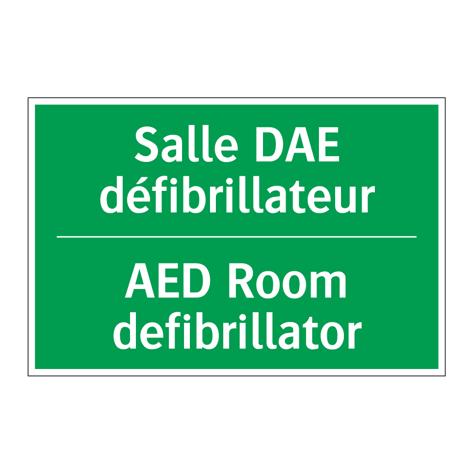 Panneau de secours bilingue avec texte en français : "Salle DAE défibrillateur", et en anglais : "AED Room defibrillator"