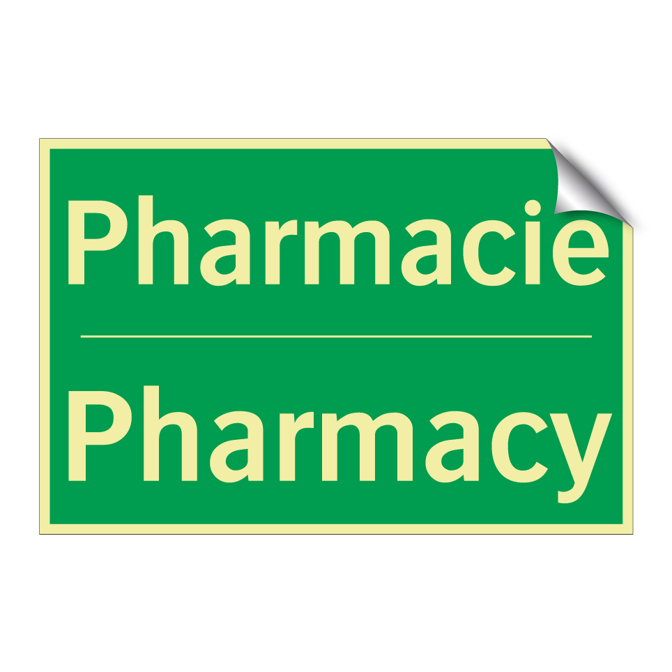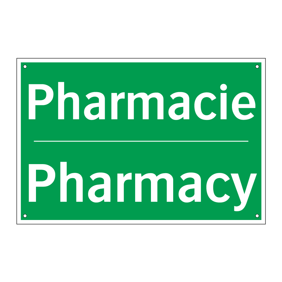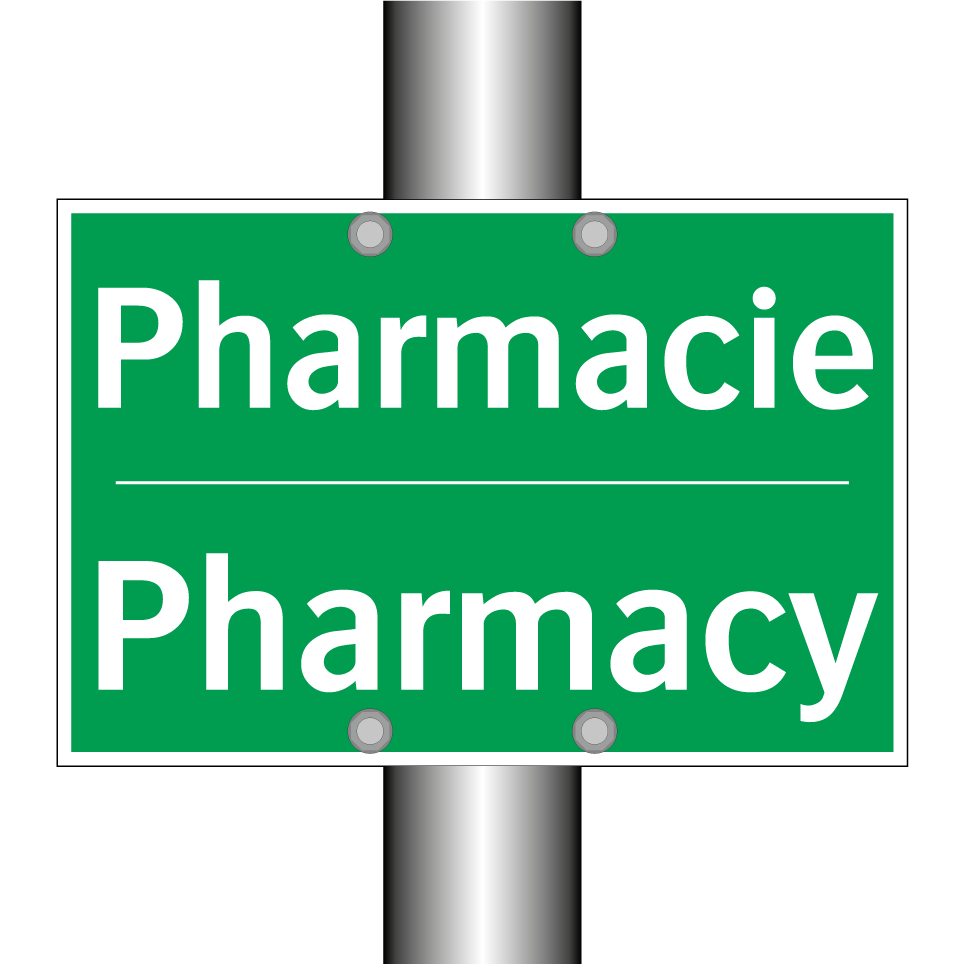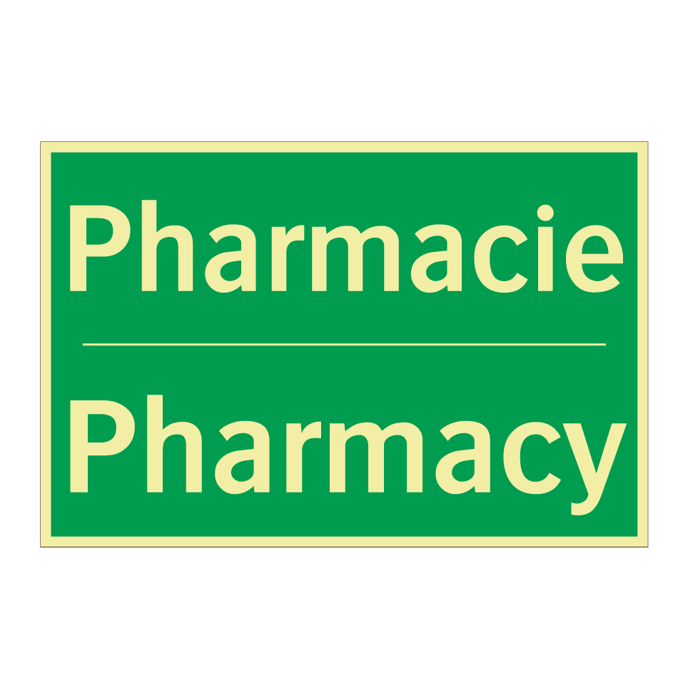Panneau de secours bilingue avec texte en français : "Pharmacie", et en anglais : "Pharmacy"