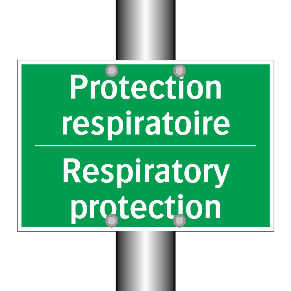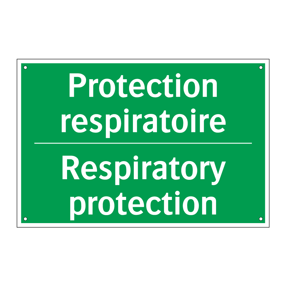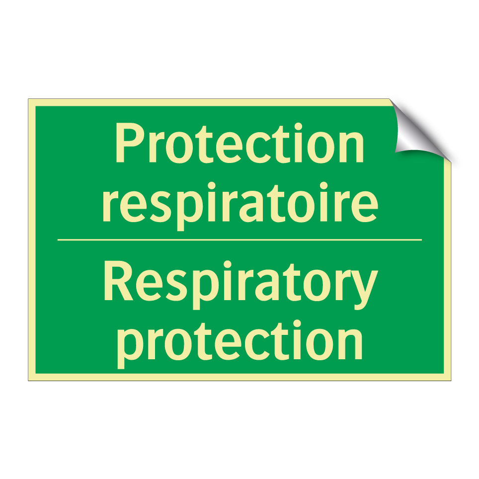 Panneau de secours bilingue avec texte en français : "Protection respiratoire", et en anglais : "Respiratory protection"