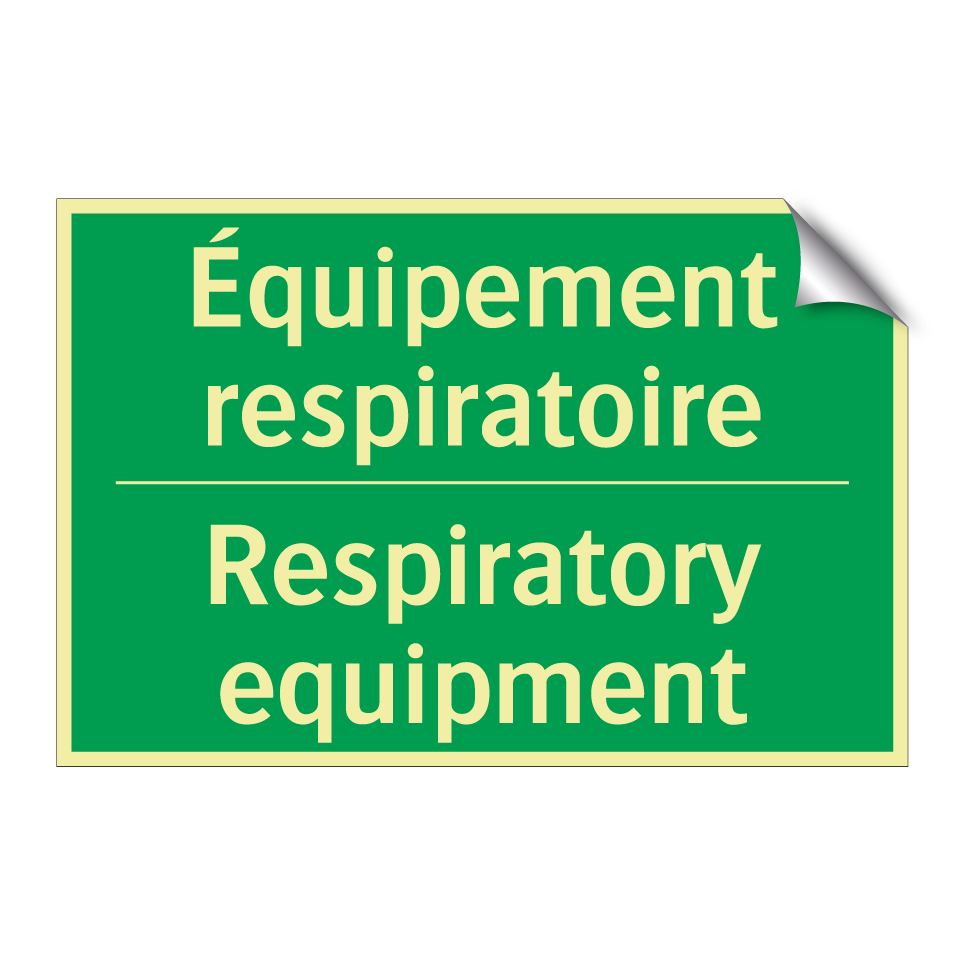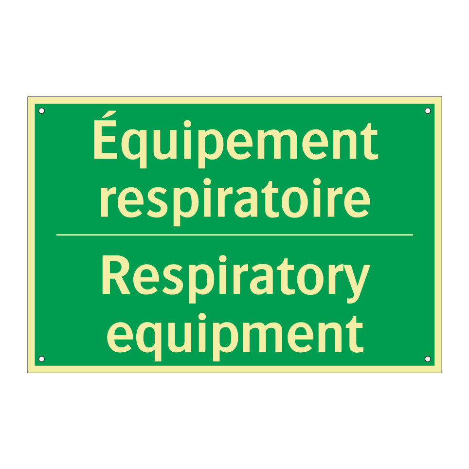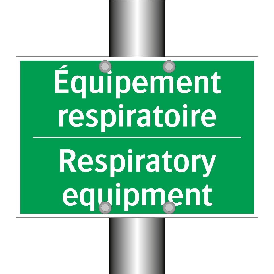 Panneau de secours bilingue avec texte en français : "Équipement respiratoire", et en anglais : "Respiratory equipment"