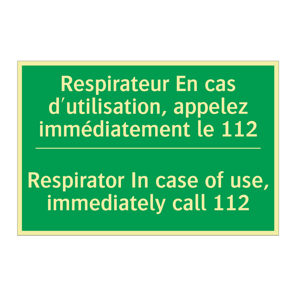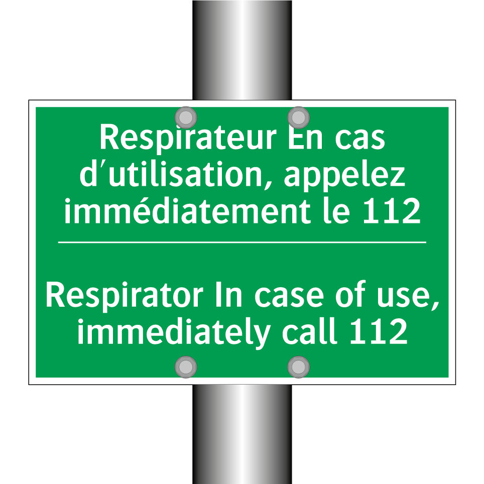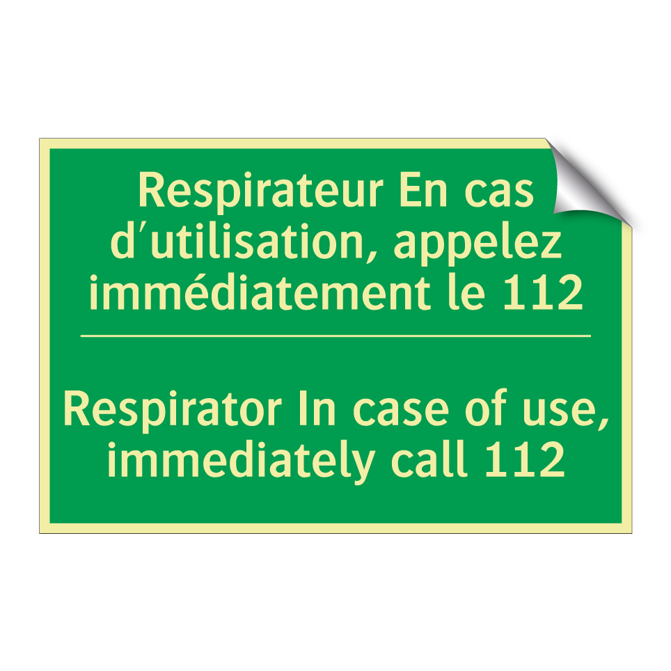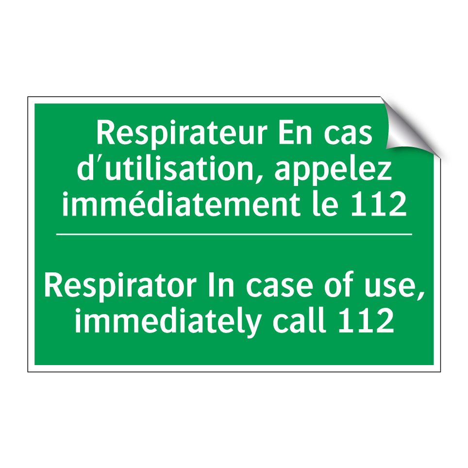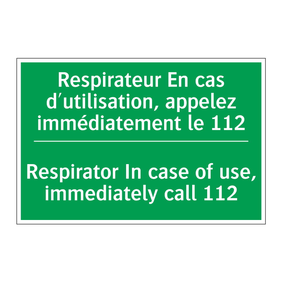 Panneau de secours bilingue avec texte en français : "Respirateur En cas d'utilisation, appelez immédiatement le 112", et en anglais : "Respirator In case of use, immediately call 112"