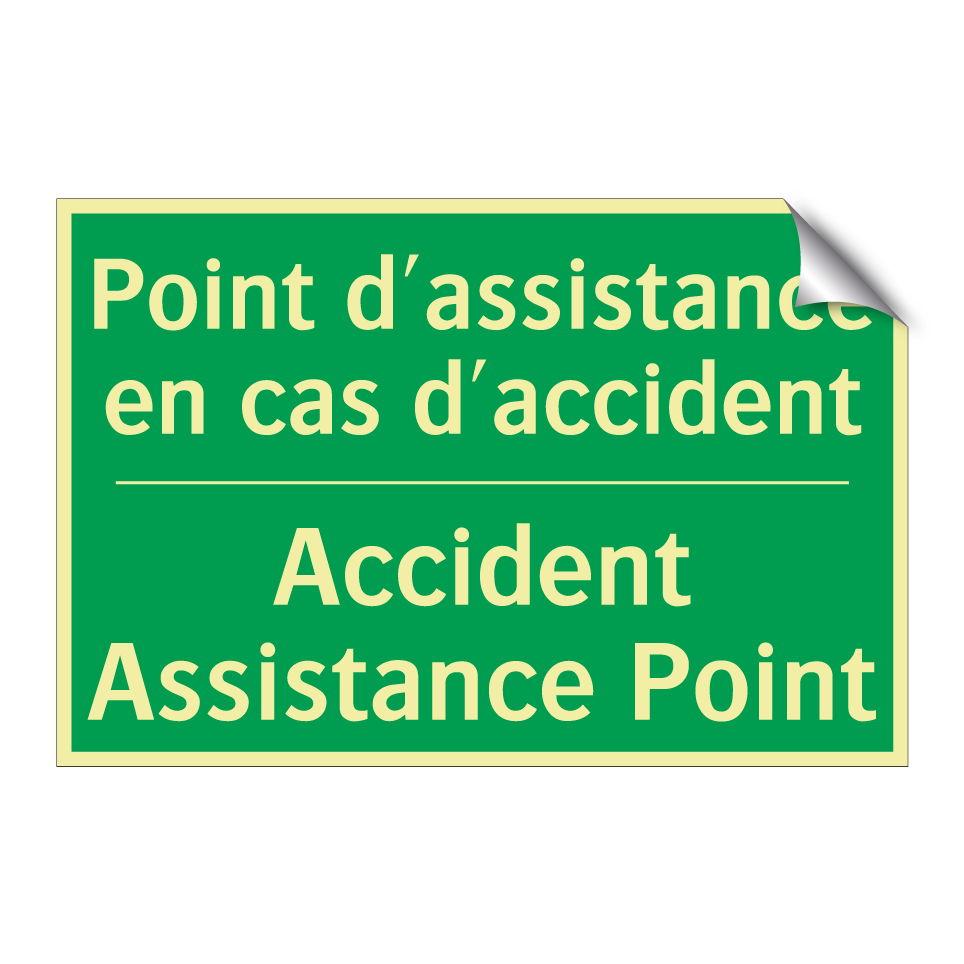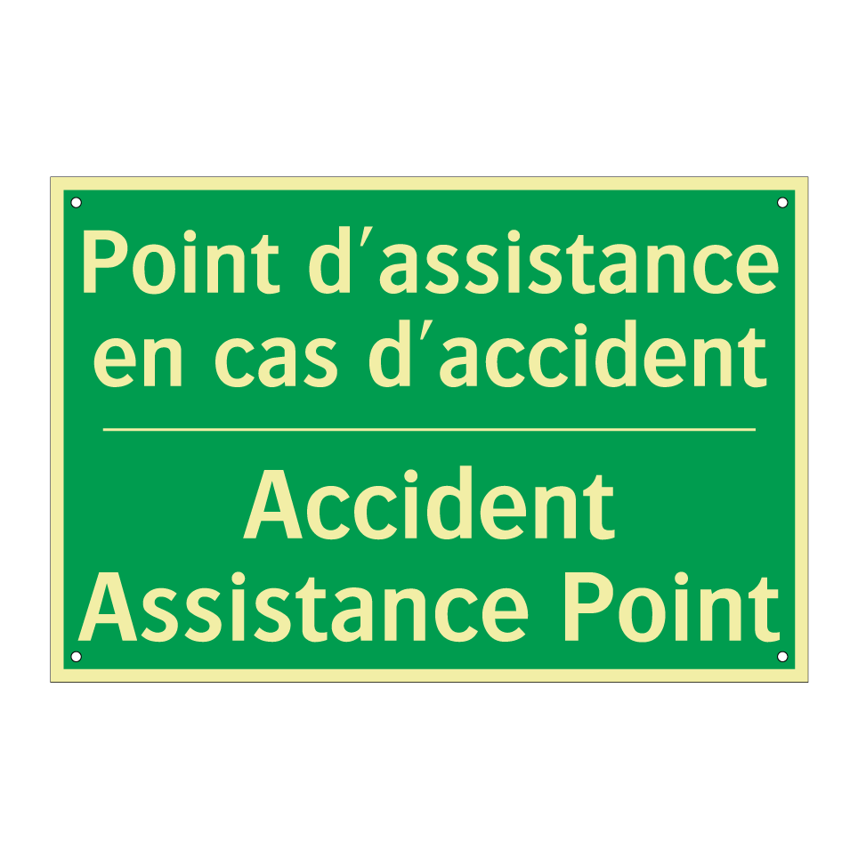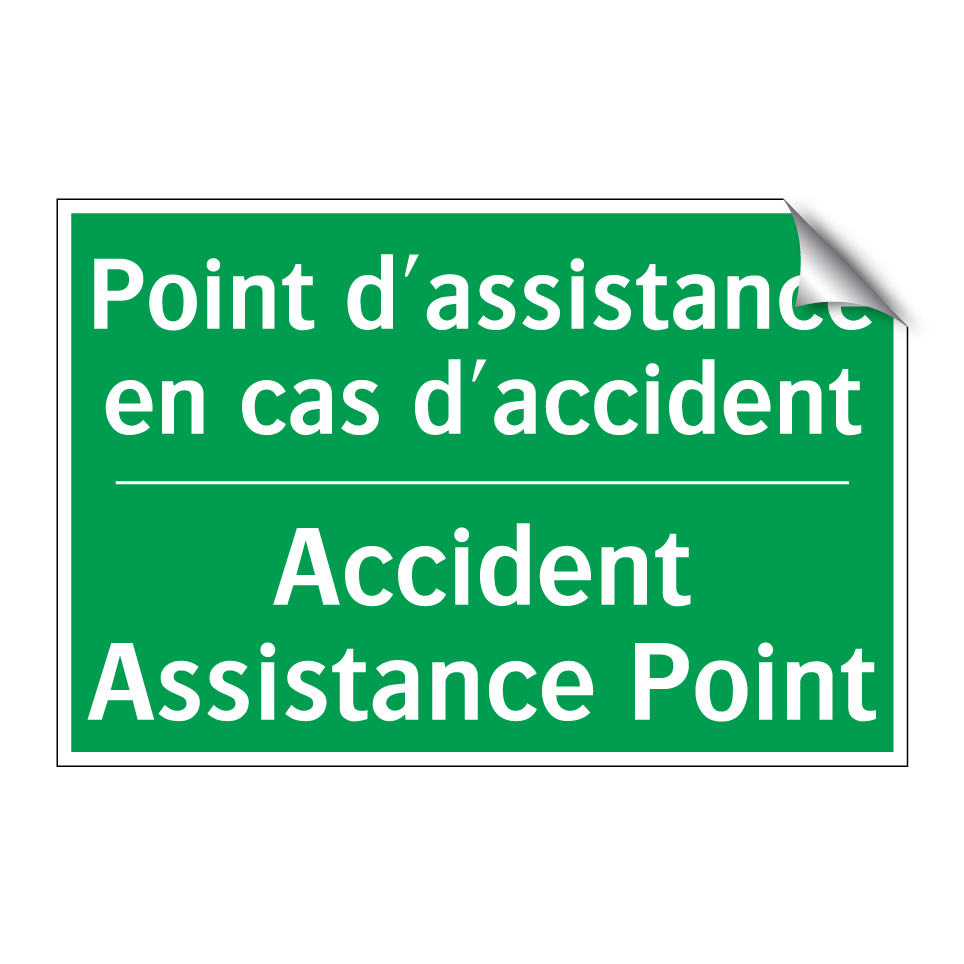 Panneau de secours bilingue avec texte en français : "Point d'assistance en cas d'accident", et en anglais : "Accident Assistance Point"