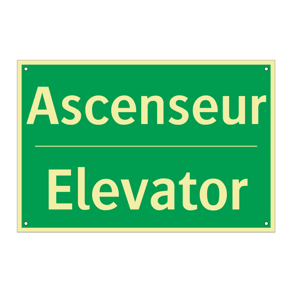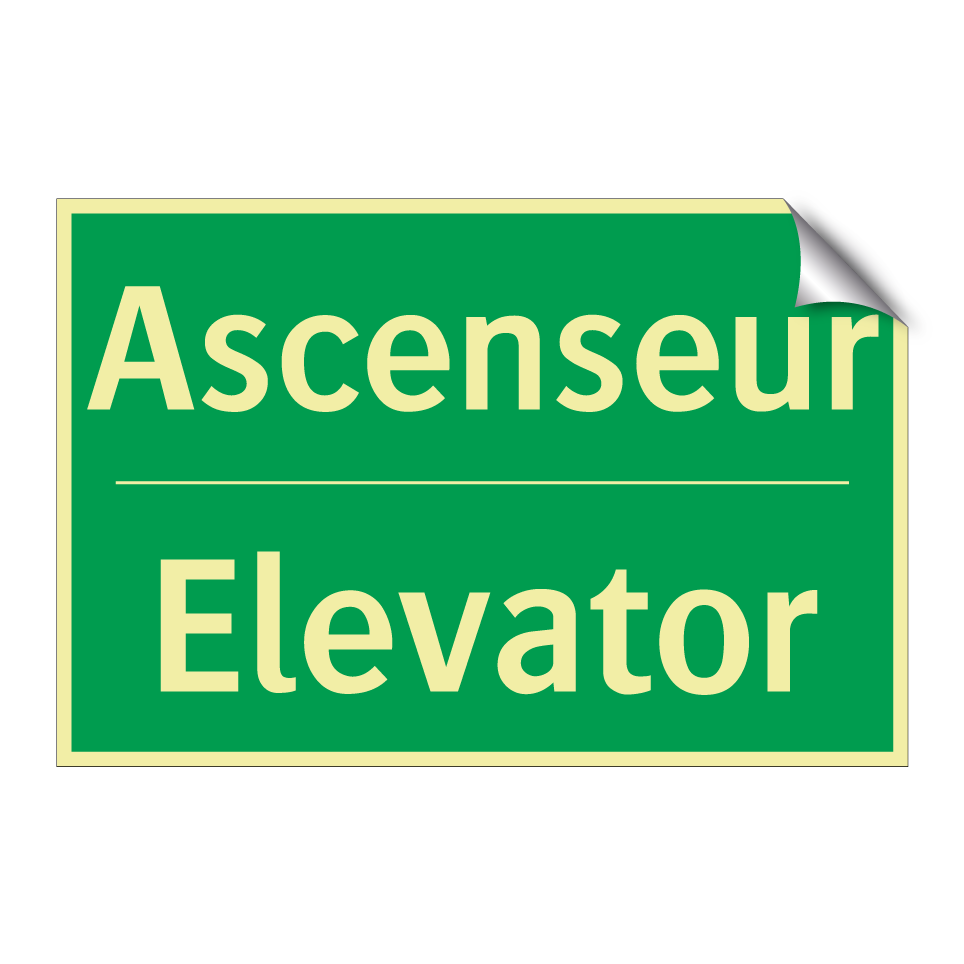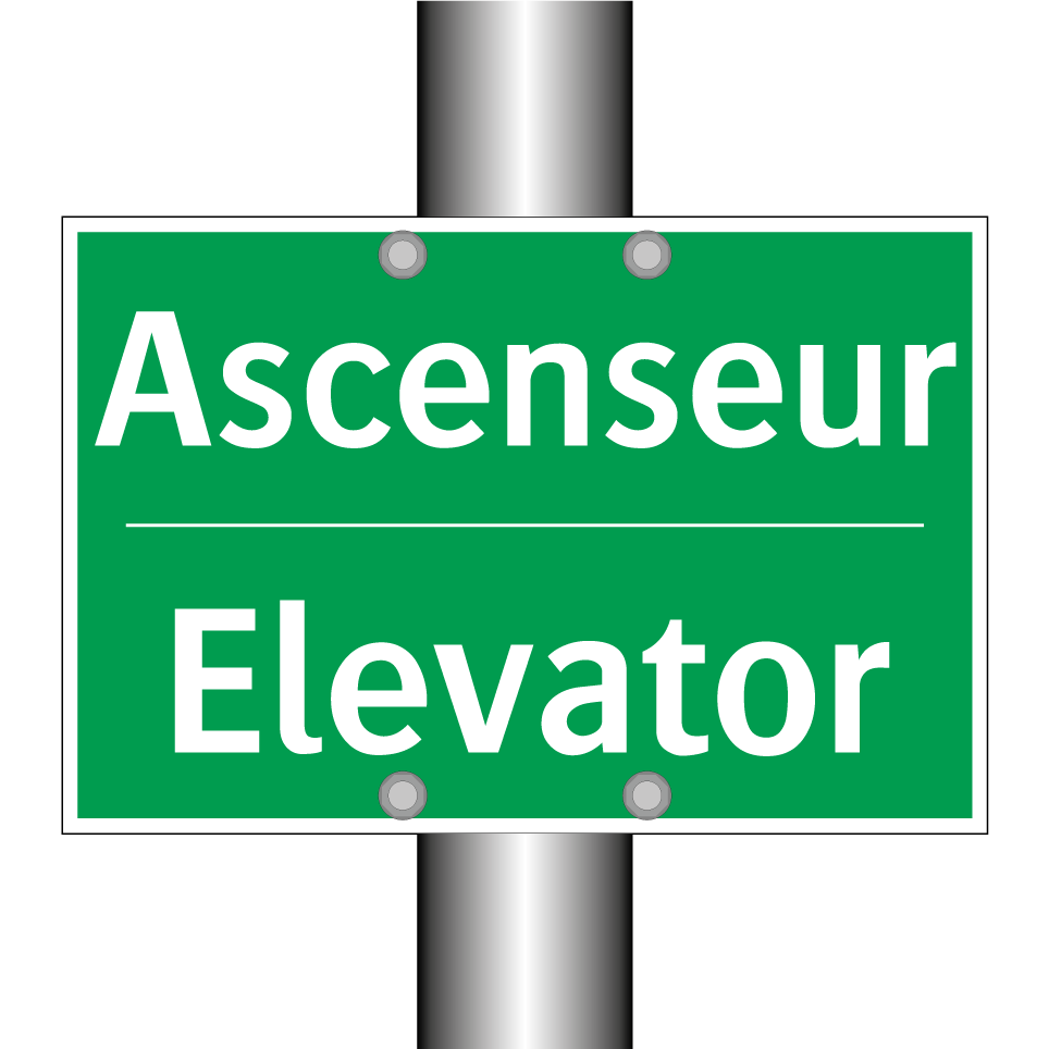 Panneau de secours bilingue avec texte en français : "Ascenseur", et en anglais : "Elevator"