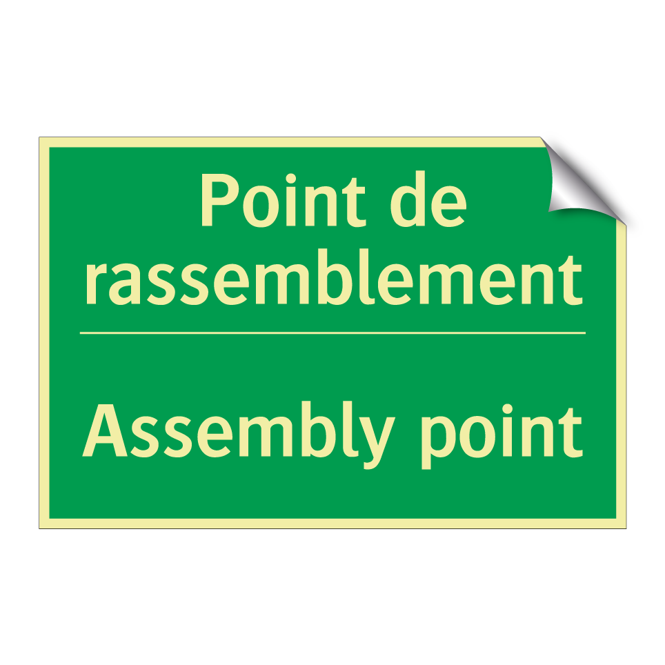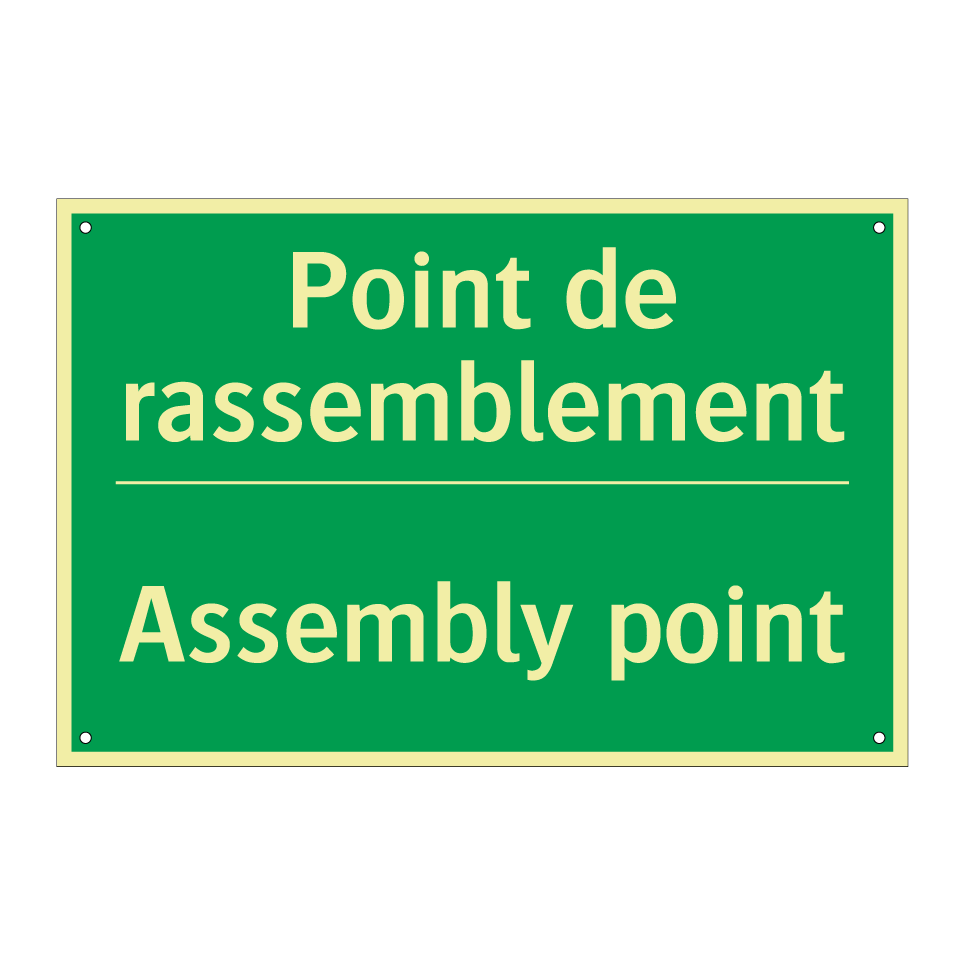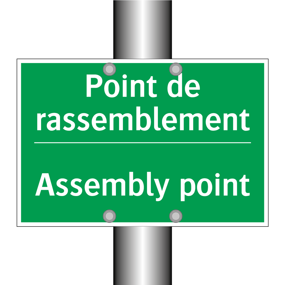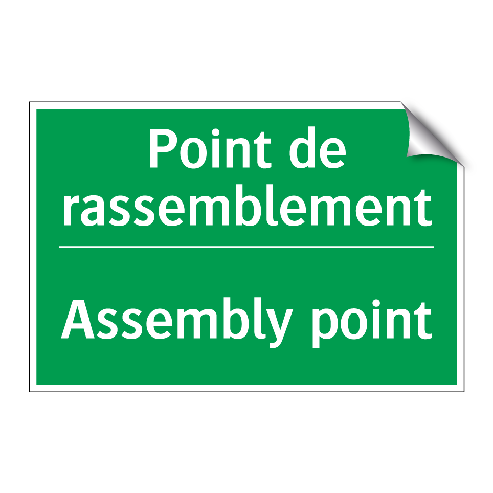 Panneau de secours bilingue avec texte en français : "Point de rassemblement", et en anglais : "Assembly point"