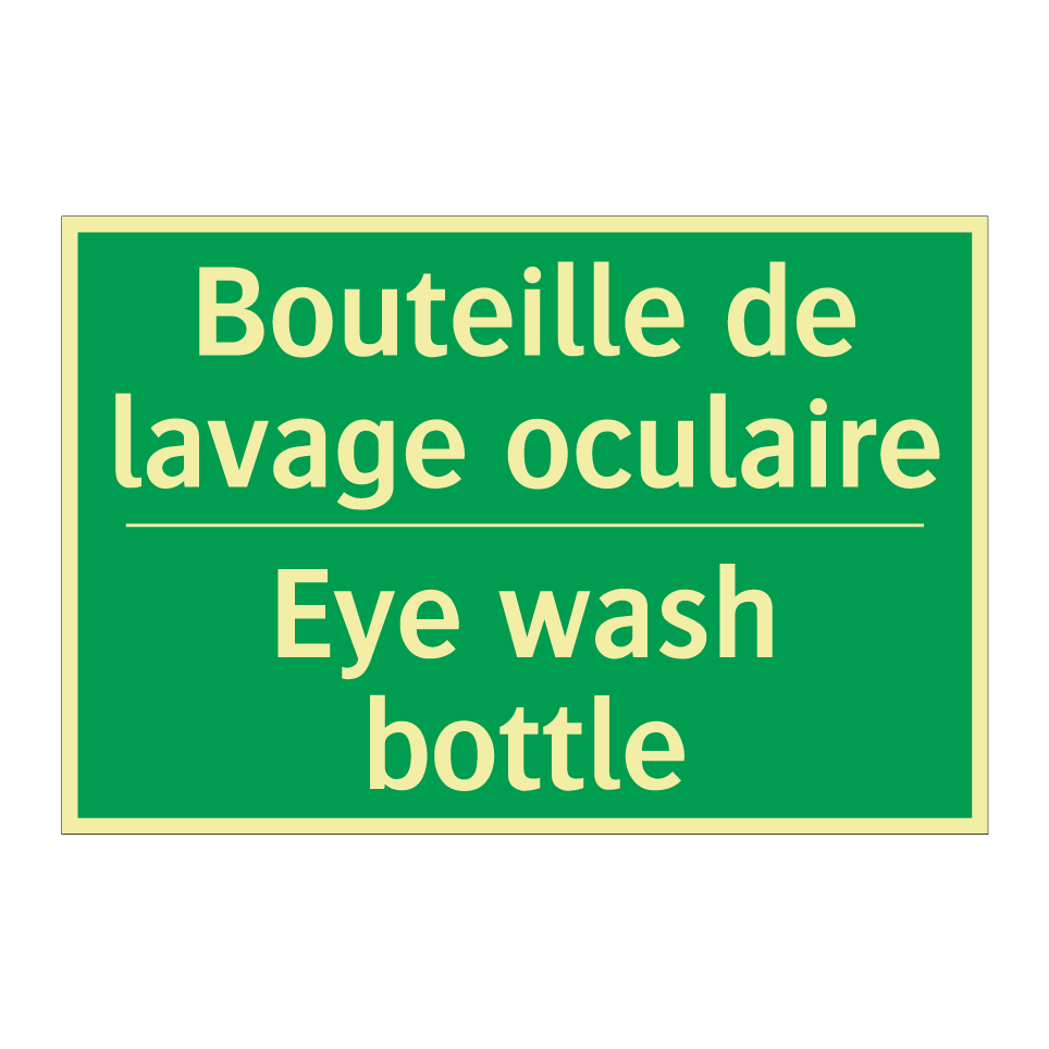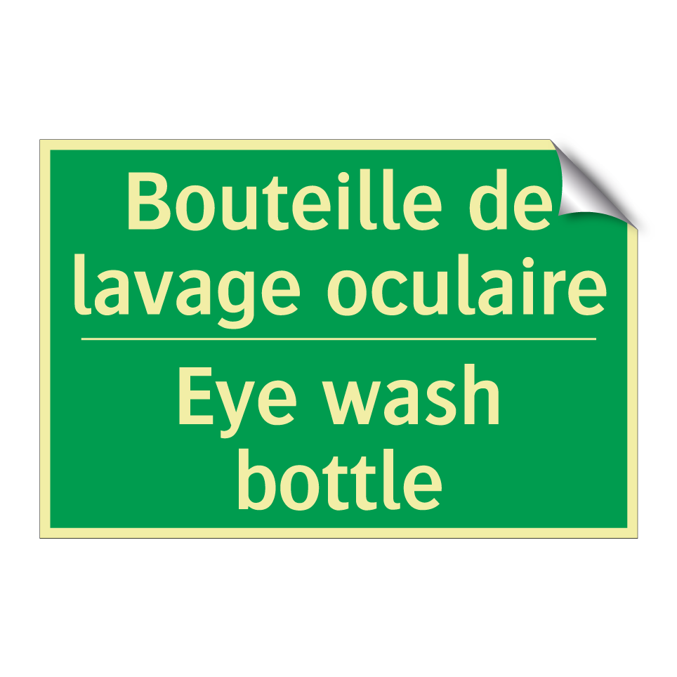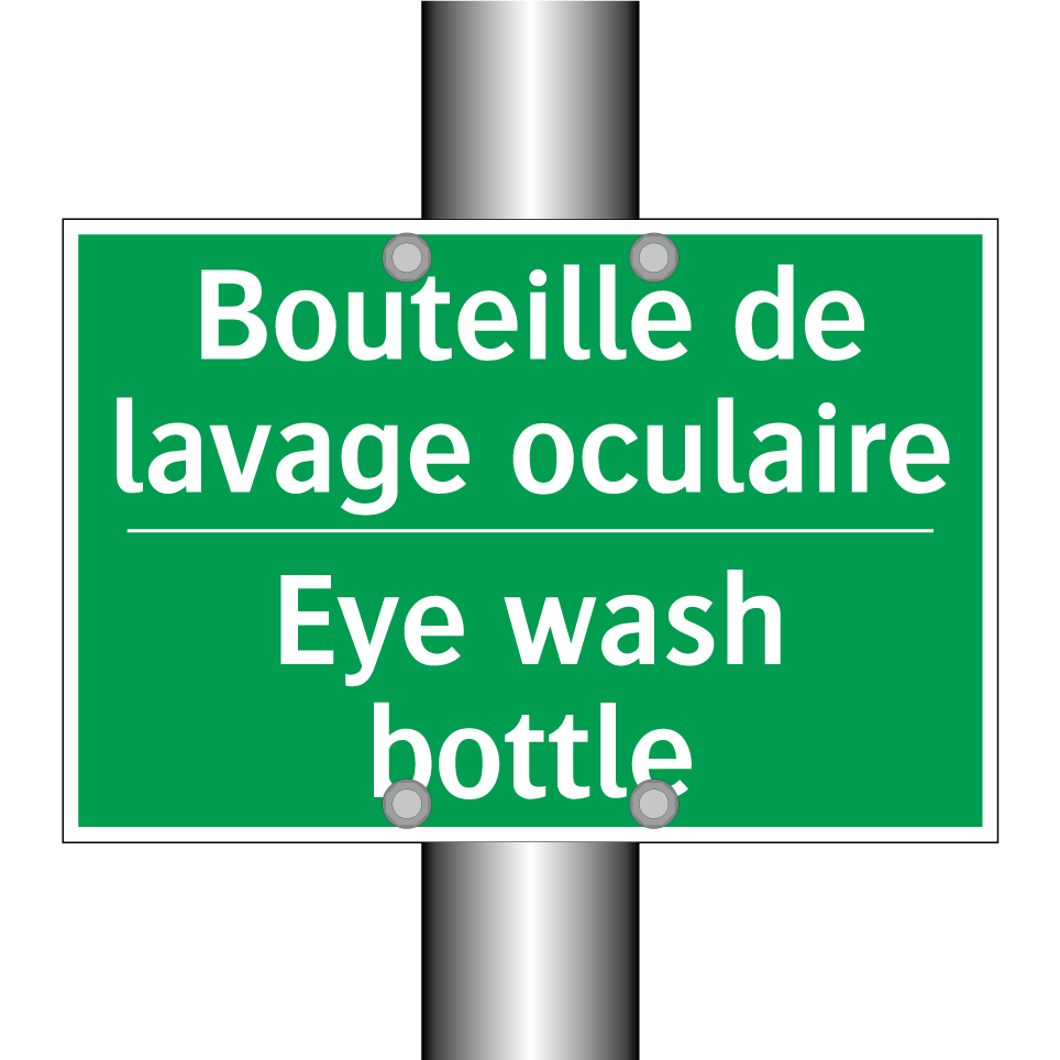 Panneau de secours bilingue avec texte en français : "Bouteille de lavage oculaire", et en anglais : "Eye wash bottle"