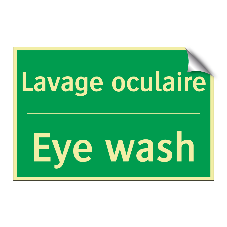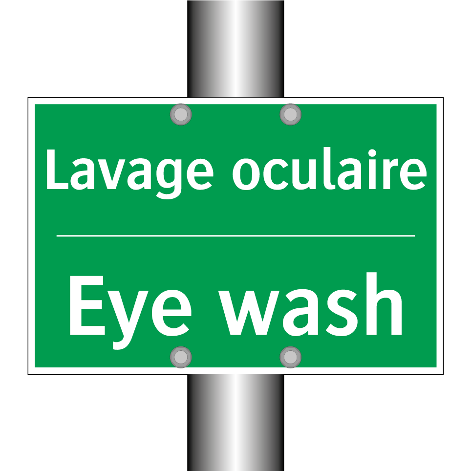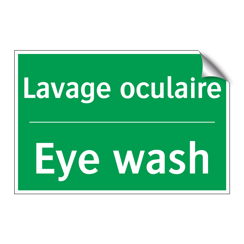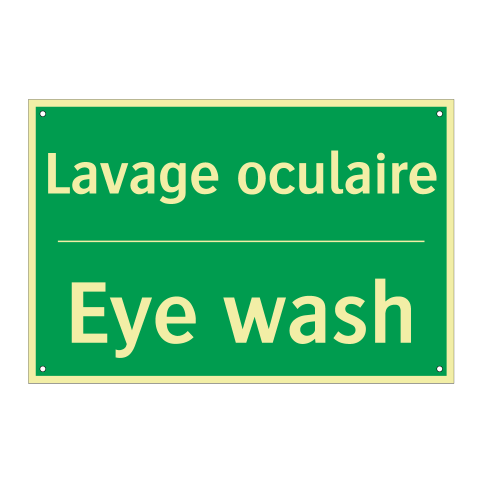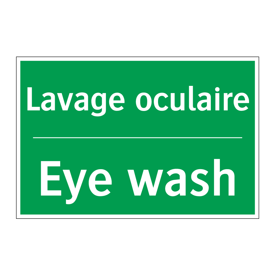 Panneau de secours bilingue avec texte en français : "Lavage oculaire", et en anglais : "Eye wash"