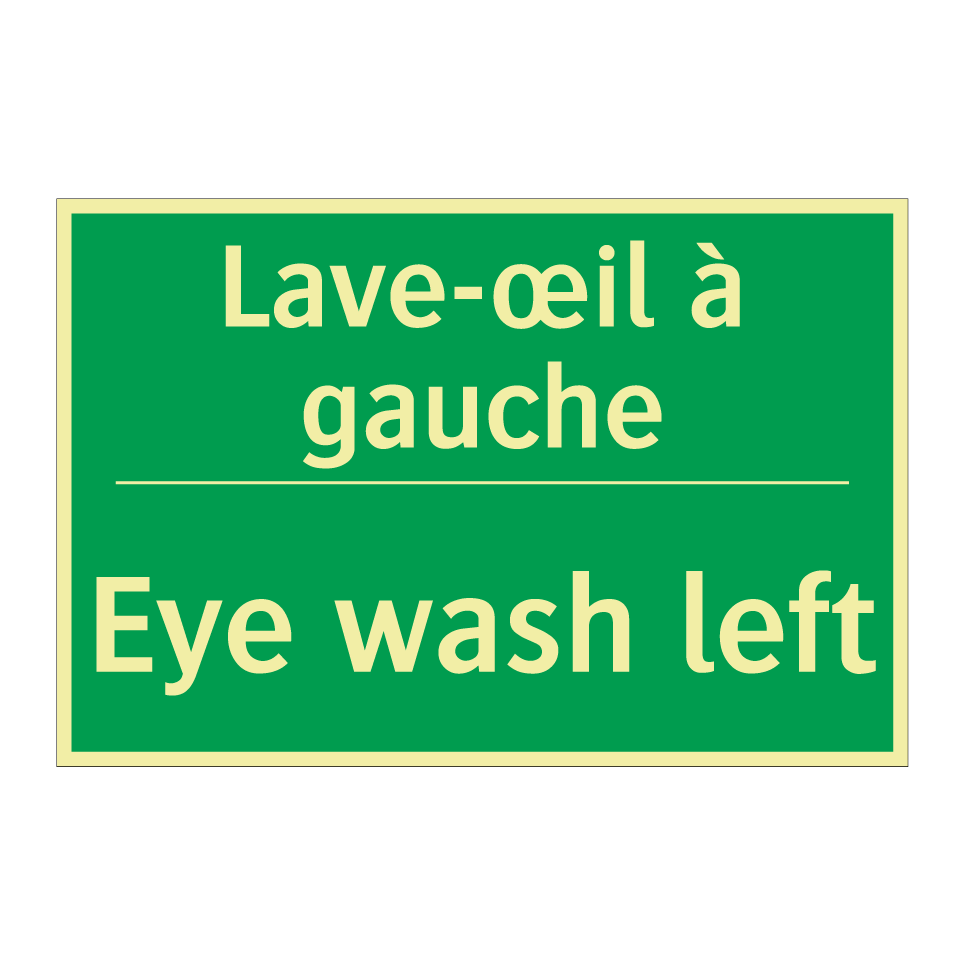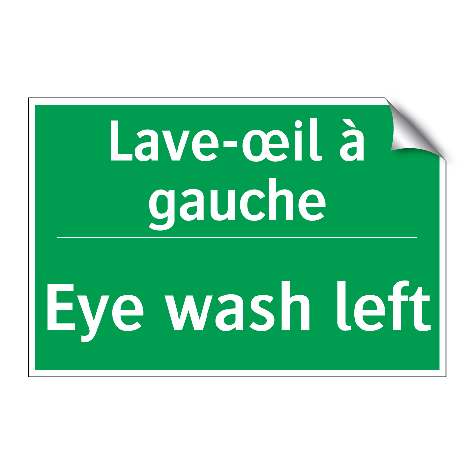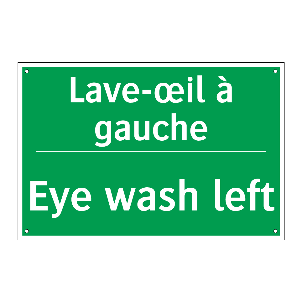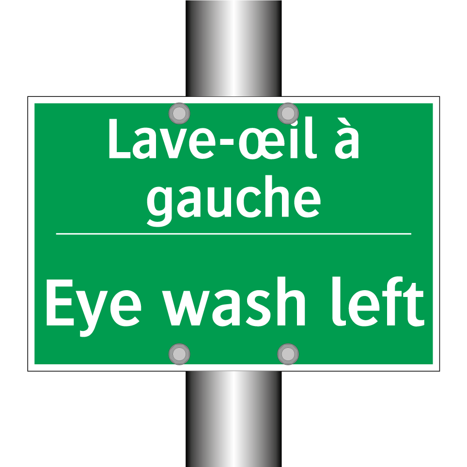 Panneau de secours bilingue avec texte en français : "Lave-œil à gauche", et en anglais : "Eye wash left"